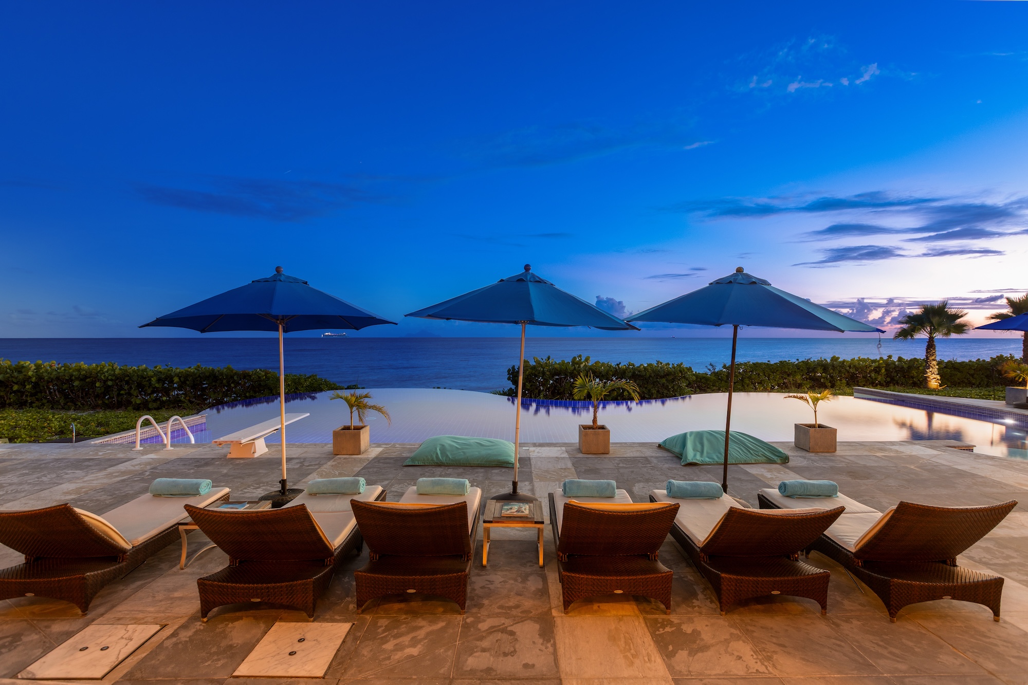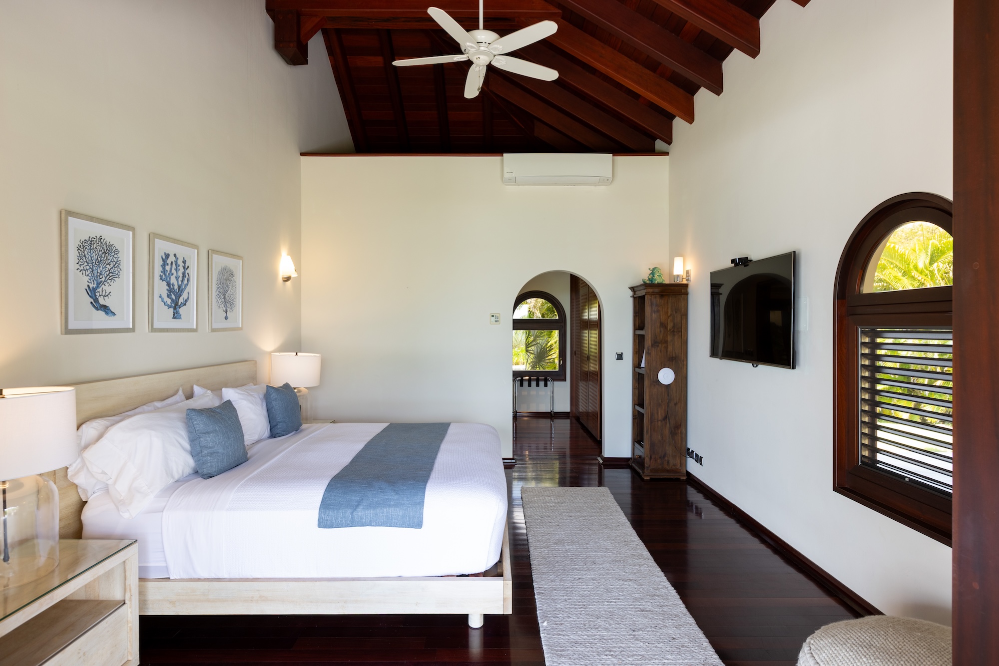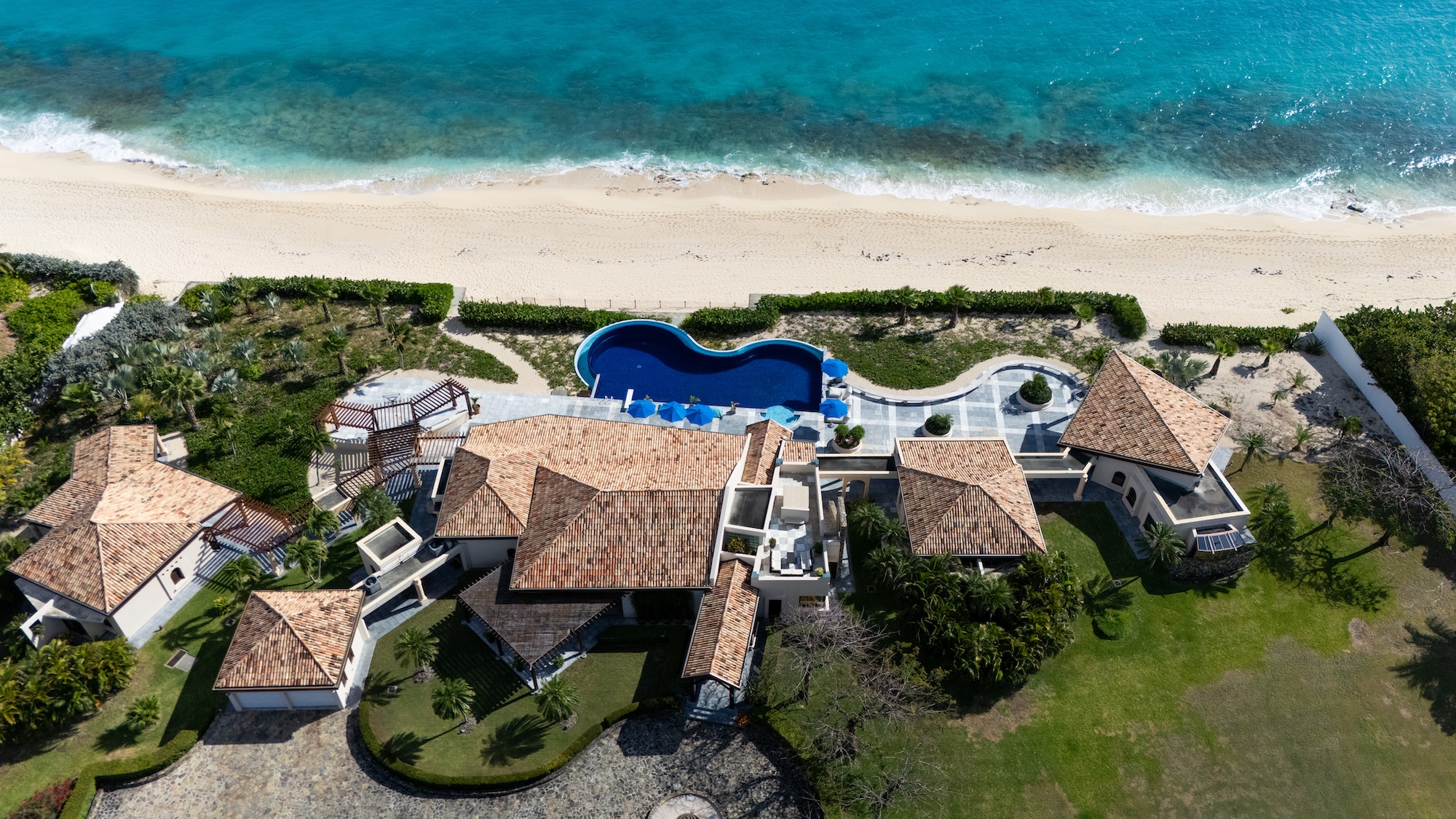 The 5 bedrooms are laid out so they each enjoy beach views from their private access under the covered terrace. The master bedroom, secluded from the Great Room, boasts 800 sq. ft of living space including a large en-suite bathroom with a soaking tub and an immense rain shower. The 4 other bedrooms, split 2 and 2 on either side of the Great Room, provide similar amenities with large garden view en-suite bathrooms. Great for families, one bedroom provides 2 double beds, so the kids will not have to share. With large vaulted ceilings like the Great Room, each bedroom is a private oasis.