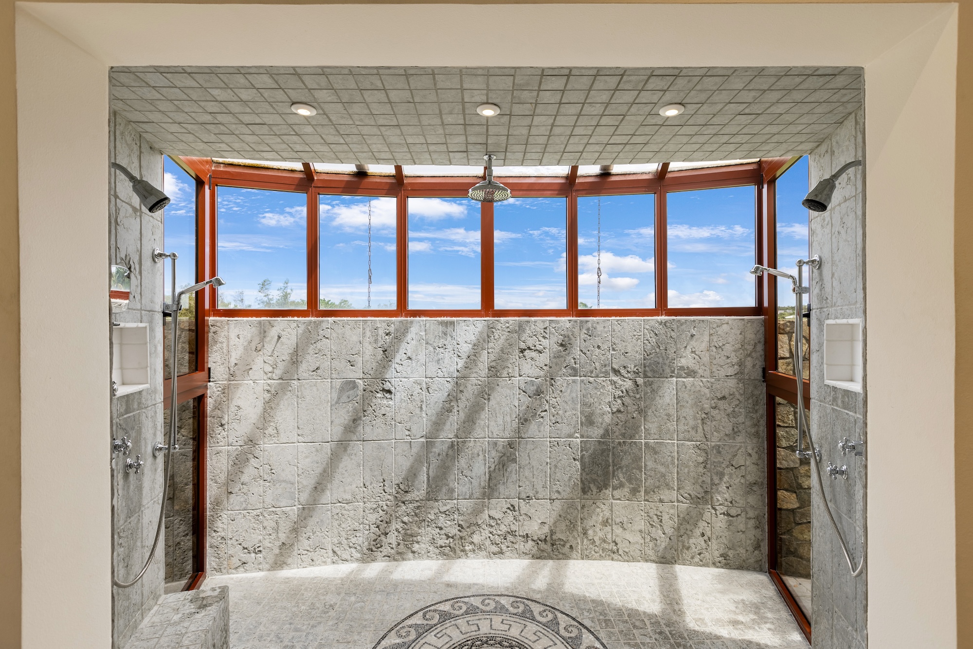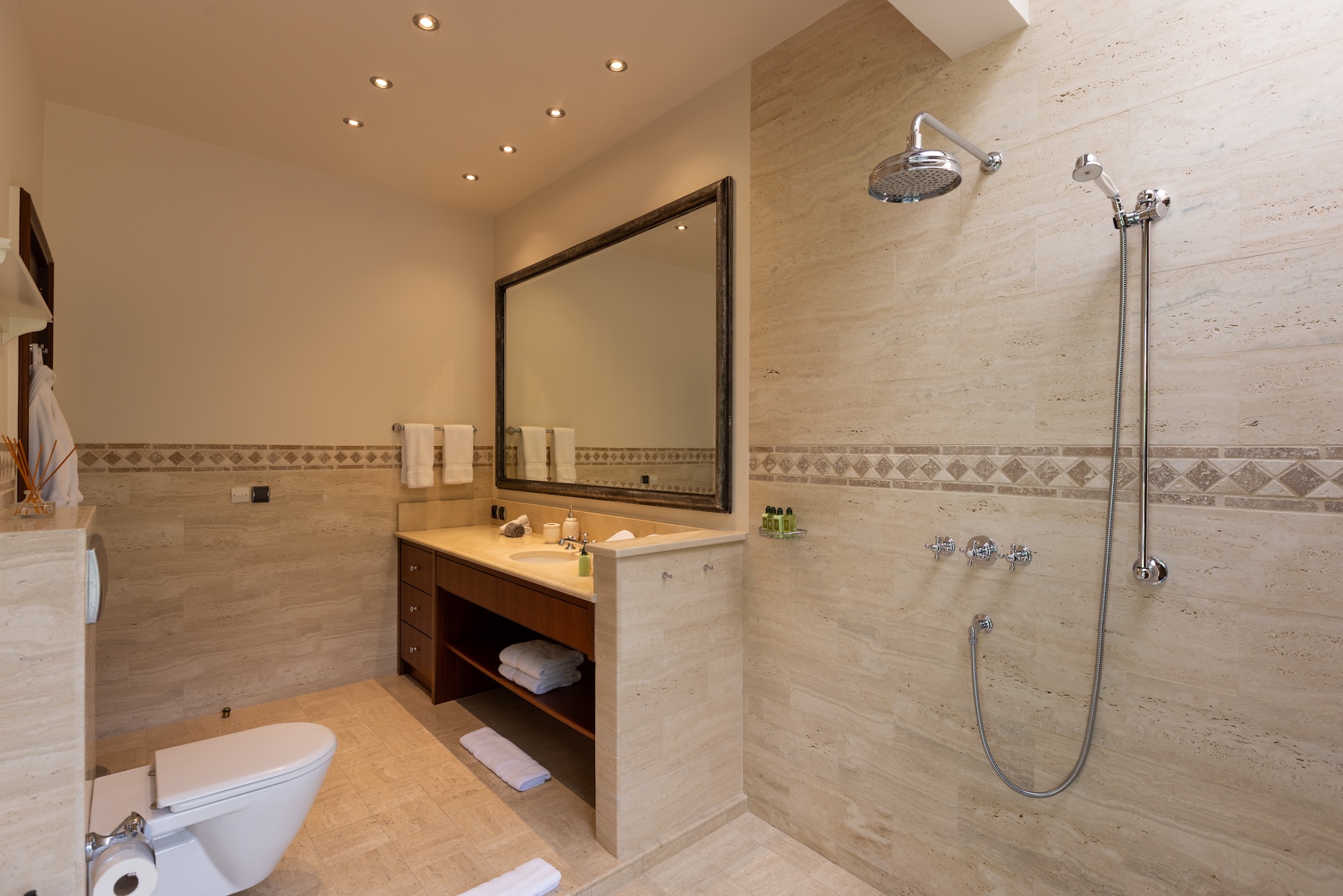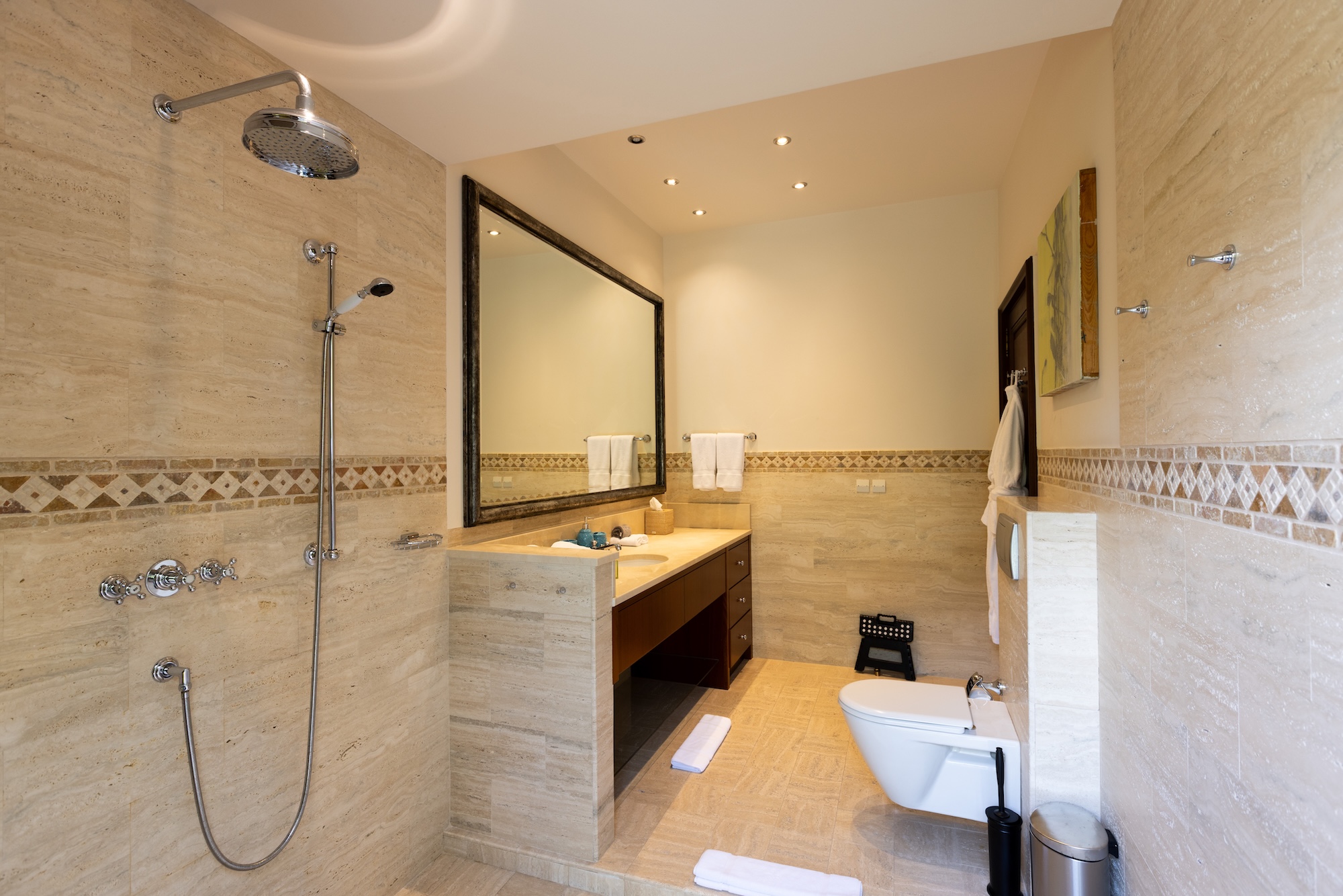 The 5 bedrooms are laid out so they each enjoy beach views from their private access under the covered terrace. The master bedroom, secluded from the Great Room, boasts 800 sq. ft of living space including a large en-suite bathroom with a soaking tub and an immense rain shower. The 4 other bedrooms, split 2 and 2 on either side of the Great Room, provide similar amenities with large garden view en-suite bathrooms. Great for families, one bedroom provides 2 double beds, so the kids will not have to share. With large vaulted ceilings like the Great Room, each bedroom is a private oasis.