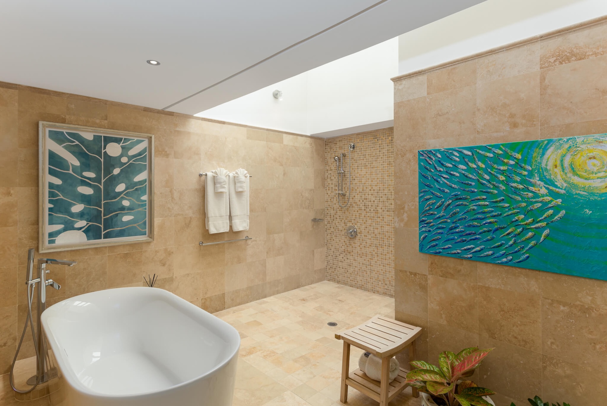 Inside, contemporary design meets effortless coastal sophistication. The expansive living space is styled with curated furnishings and elegant finishes, while floor-to-ceiling glass doors frame uninterrupted sea views and open onto a private oceanfront terrace. The seamless indoor-outdoor layout creates a breezy, light-filled atmosphere throughout. Three beautifully appointed bedrooms offer serene privacy, including a stunning primary suite with a king bed, private balcony, sweeping ocean views, and a spa-inspired en-suite featuring a soaking tub and rain shower. Two additional guest suites provide the same level of comfort, each with plush bedding and refined en-suite bathrooms.