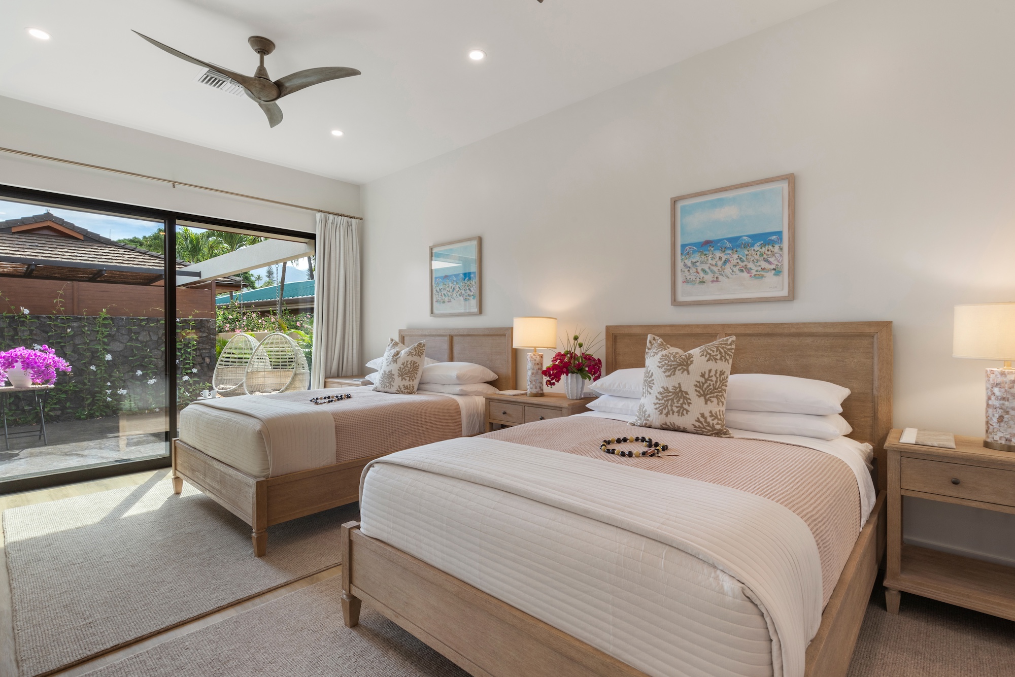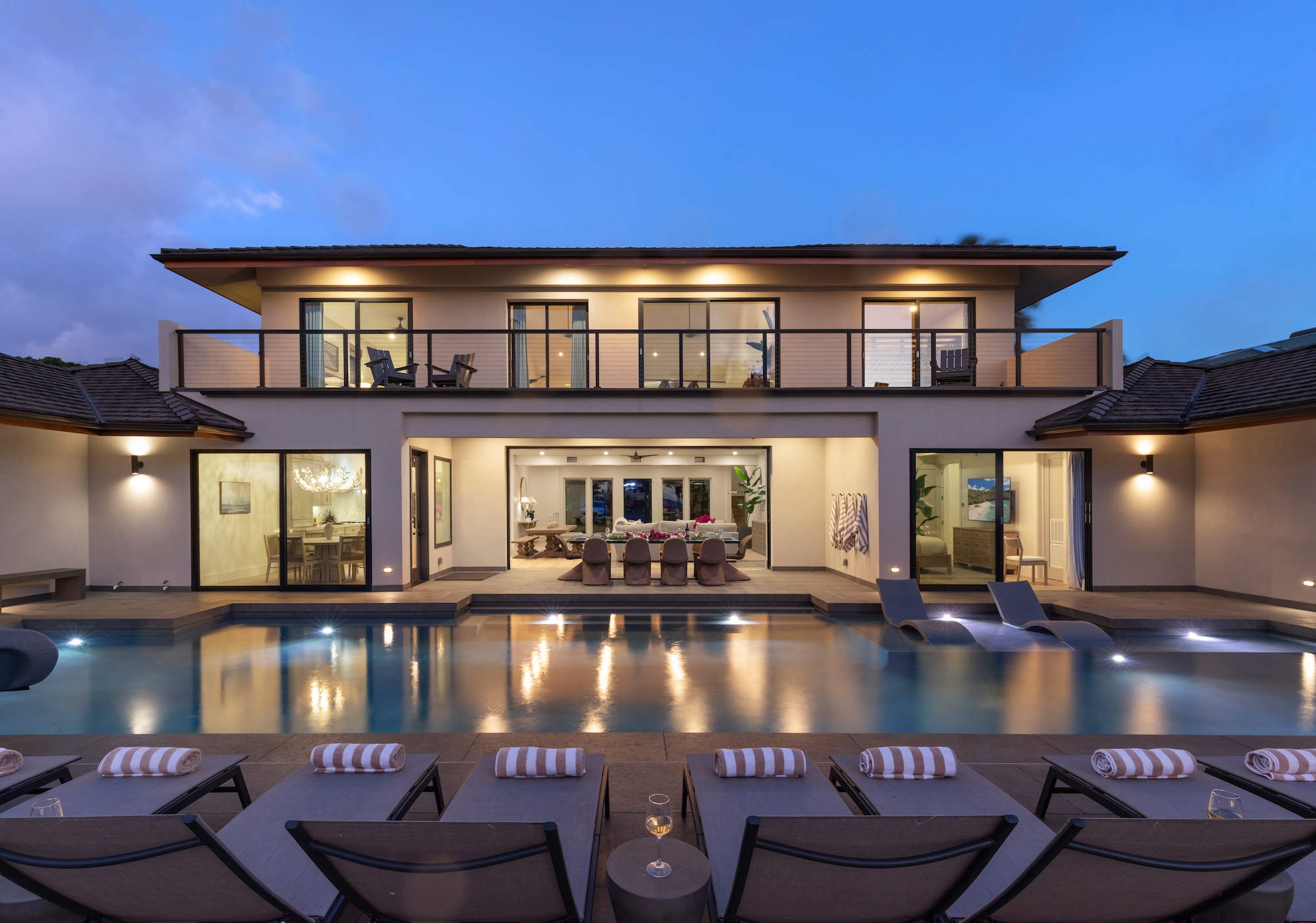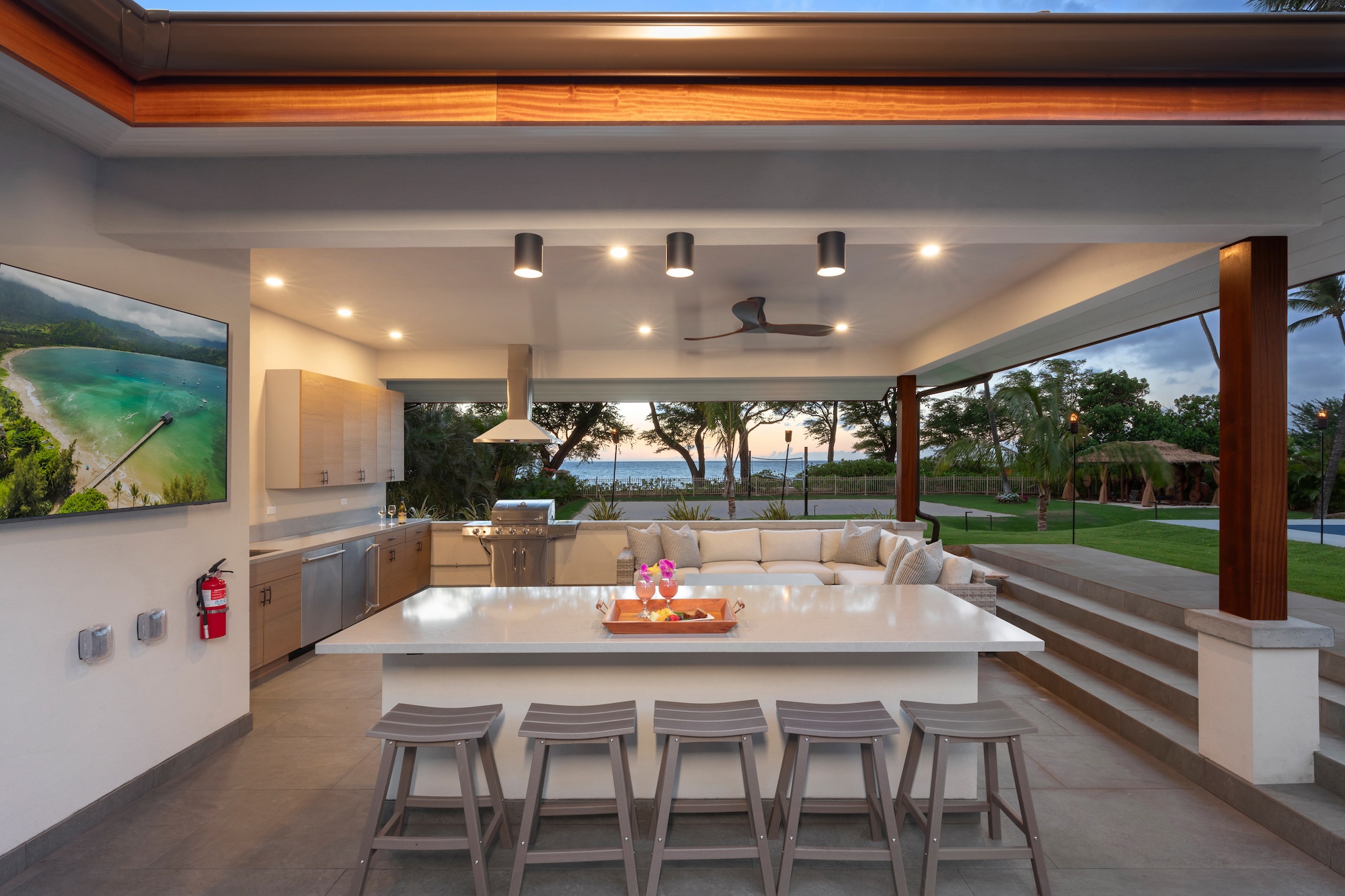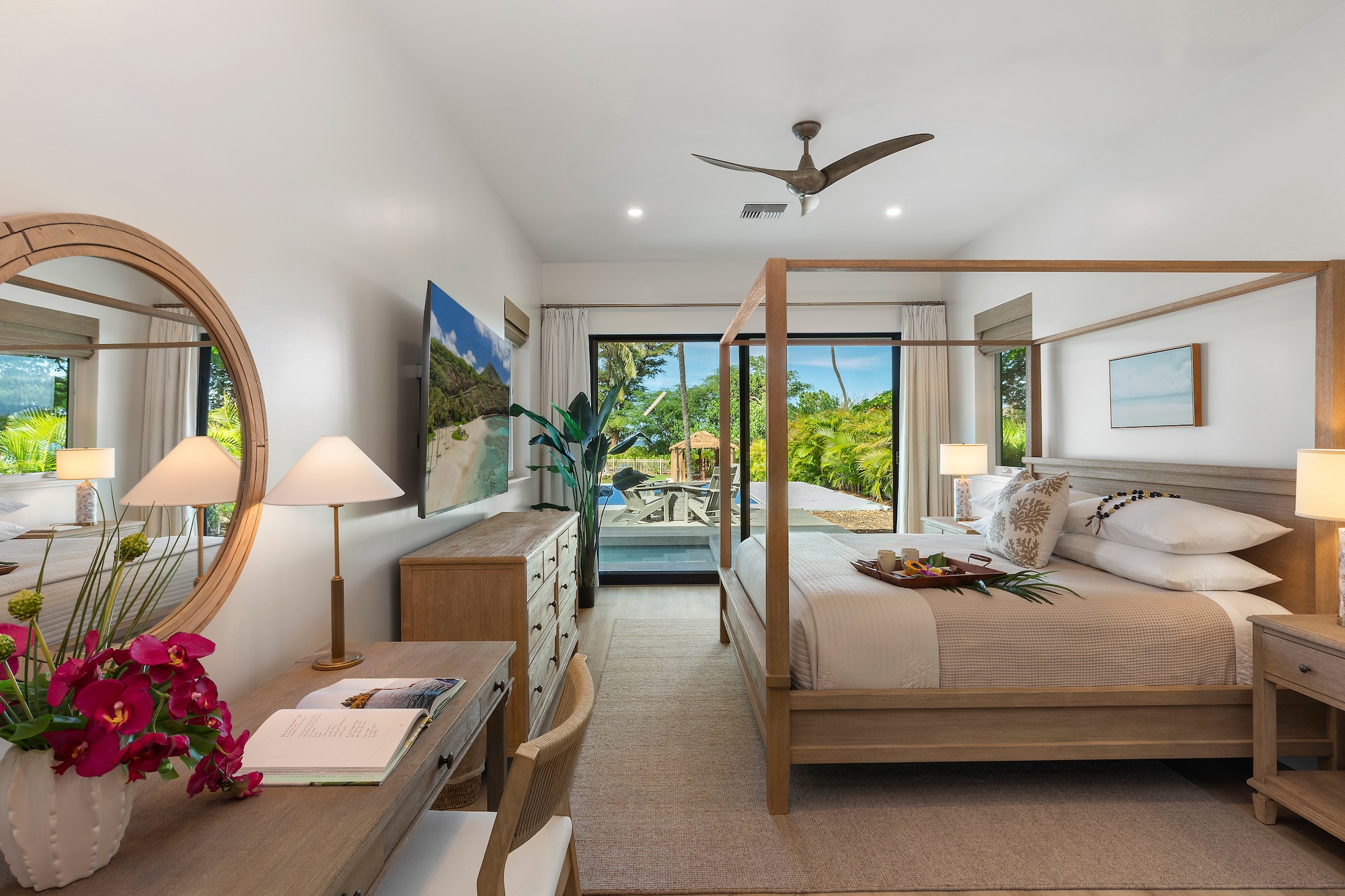 The detached three-bedroom suites complete the 11-bedroom villa. Two spacious king suites with en-suite baths, just steps from the main house, provide privacy and extra room for families. Both suites feature outdoor soaking tubs and showers. The final bedroom, known as the Ohana cottage, is perfect for a family of three, offering a king-size bed, a pullout sofa, a full kitchen, and laundry. Opposite the Ohana is an air-conditioned indoor gym with everything needed to stay on top of your fitness goals.