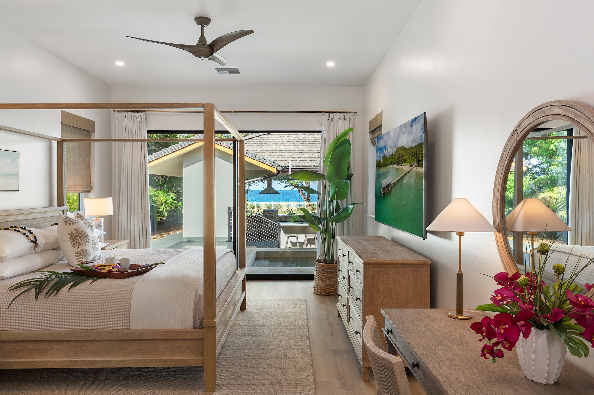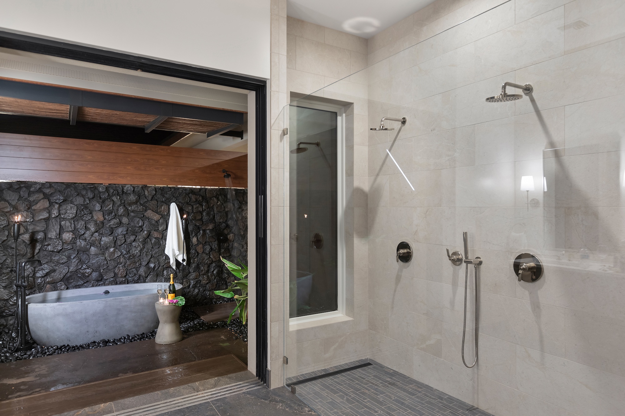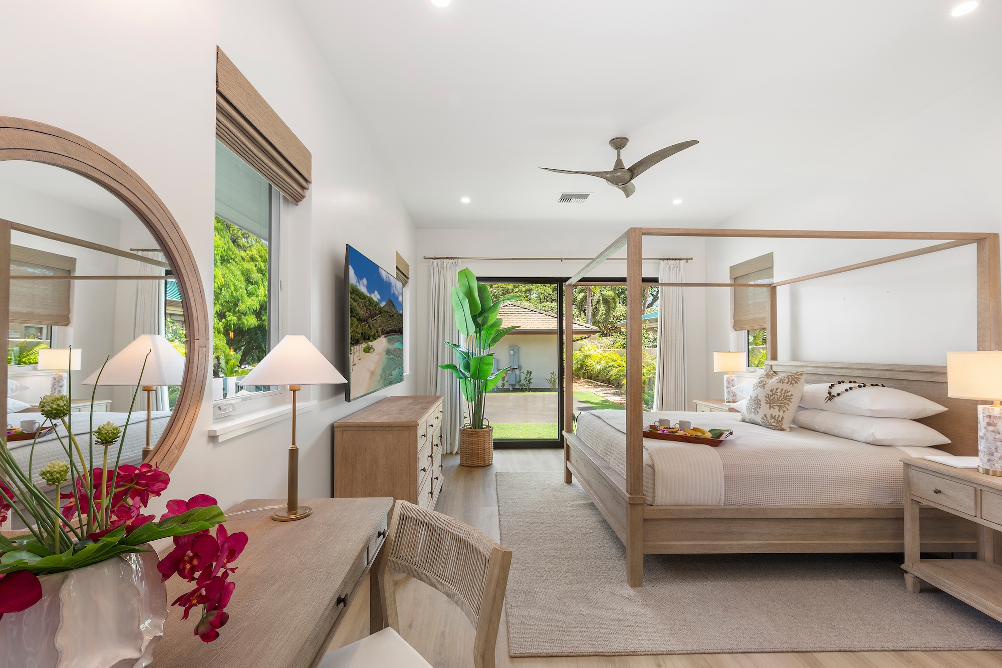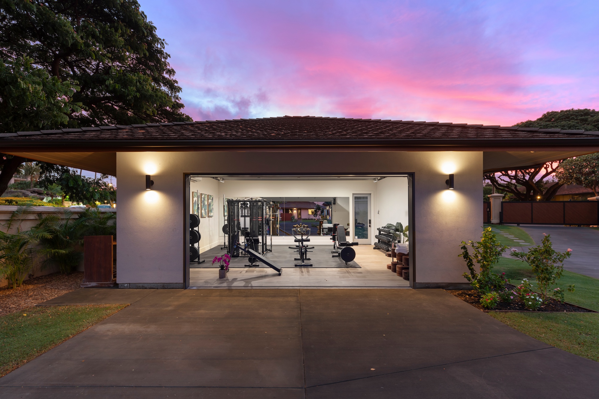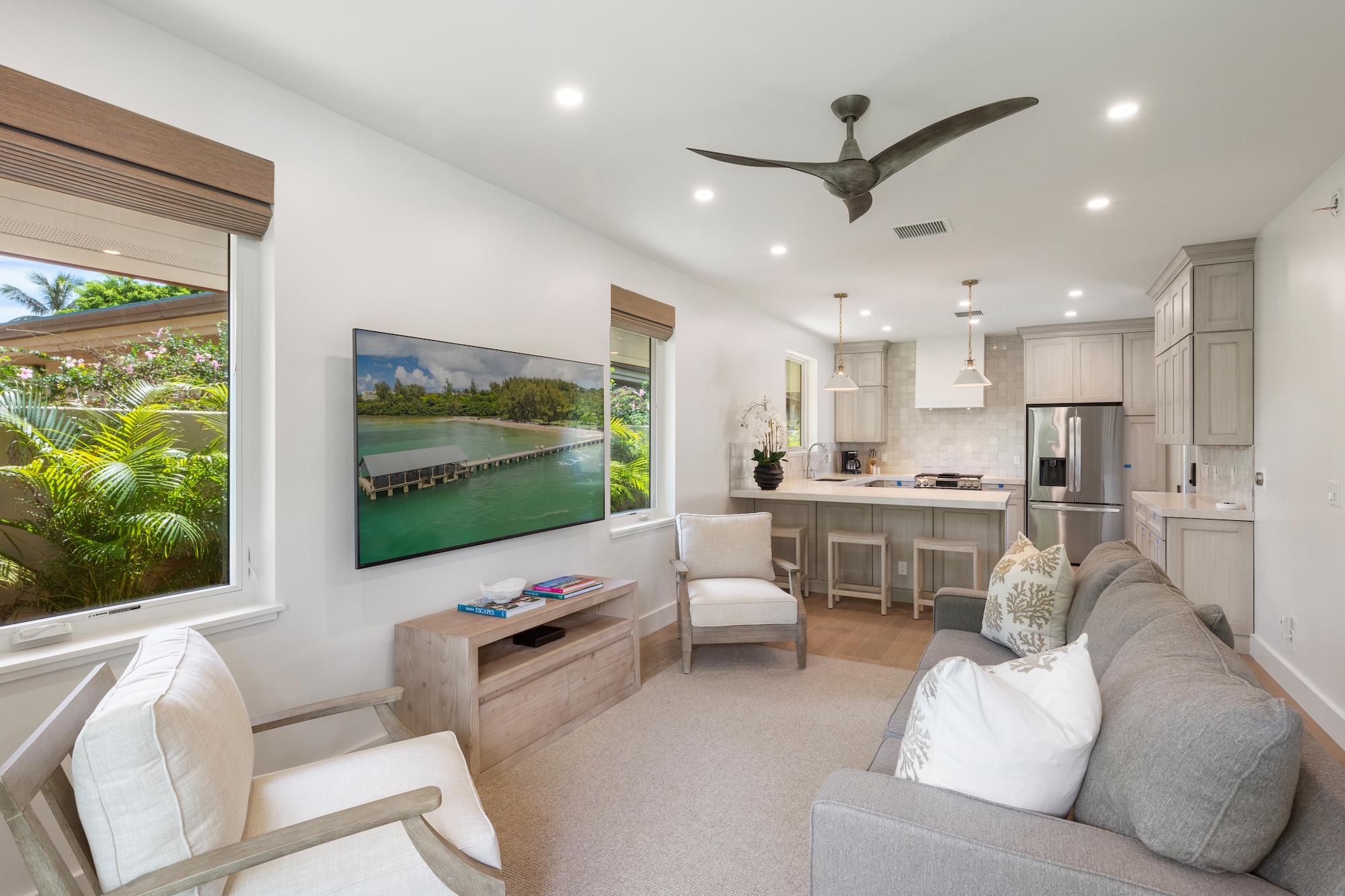 The detached three-bedroom suites complete the 11-bedroom villa. Two spacious king suites with en-suite baths, just steps from the main house, provide privacy and extra room for families. Both suites feature outdoor soaking tubs and showers. The final bedroom, known as the Ohana cottage, is perfect for a family of three, offering a king-size bed, a pullout sofa, a full kitchen, and laundry. Opposite the Ohana is an air-conditioned indoor gym with everything needed to stay on top of your fitness goals.