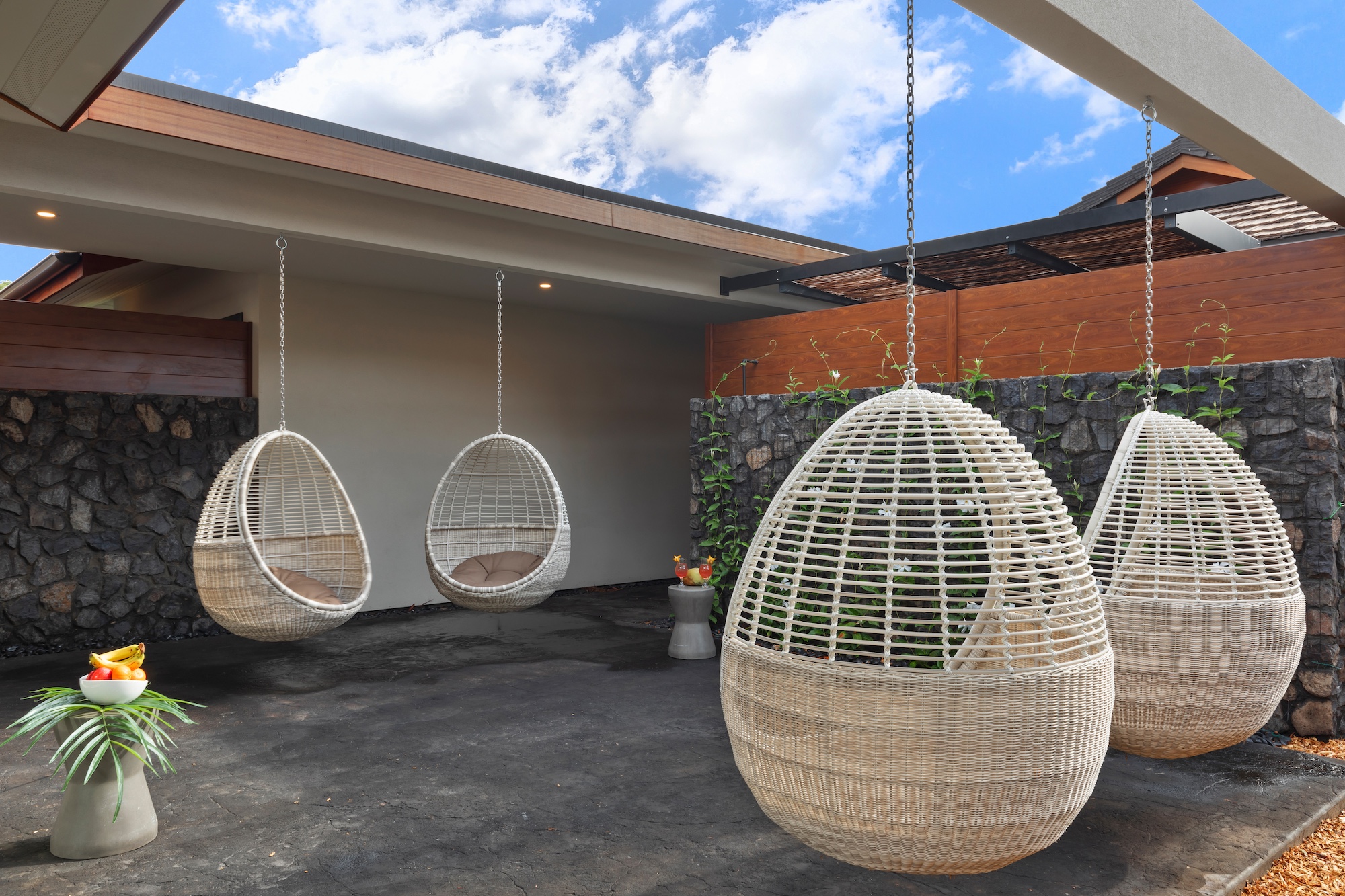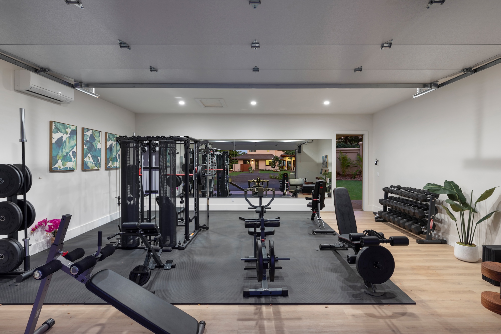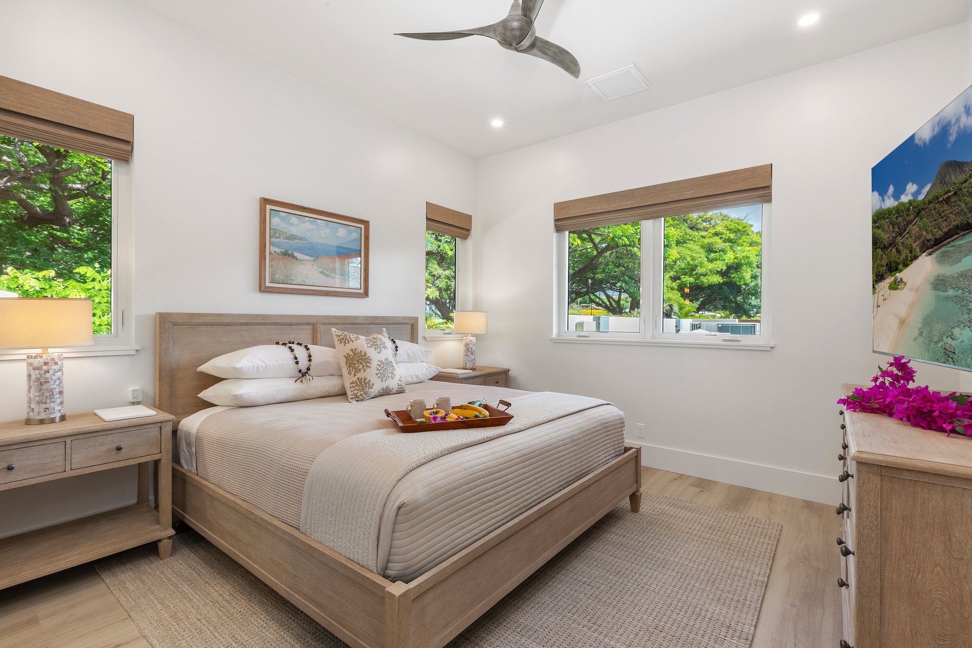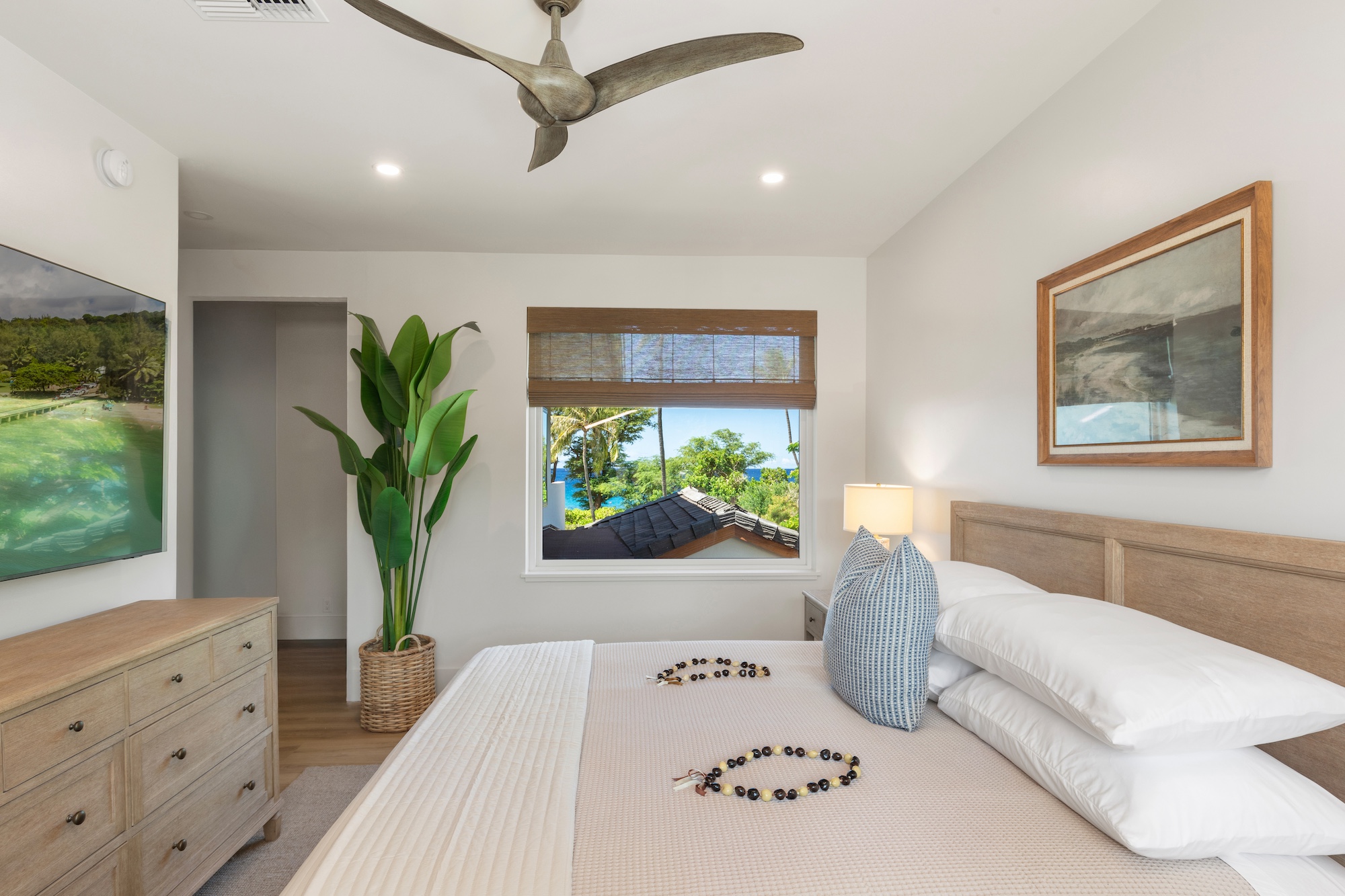 The detached three-bedroom suites complete the 11-bedroom villa. Two spacious king suites with en-suite baths, just steps from the main house, provide privacy and extra room for families. Both suites feature outdoor soaking tubs and showers. The final bedroom, known as the Ohana cottage, is perfect for a family of three, offering a king-size bed, a pullout sofa, a full kitchen, and laundry. Opposite the Ohana is an air-conditioned indoor gym with everything needed to stay on top of your fitness goals.