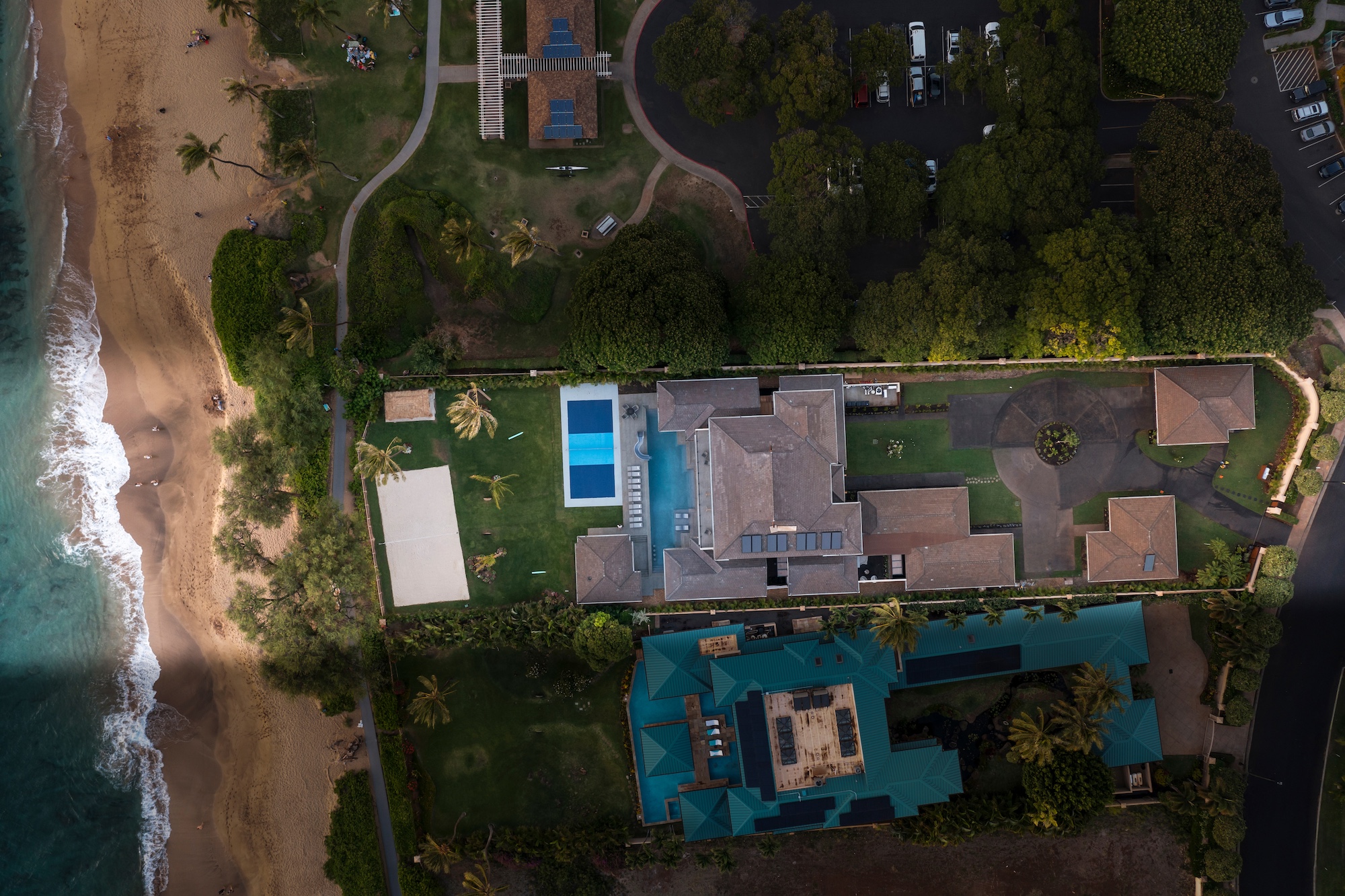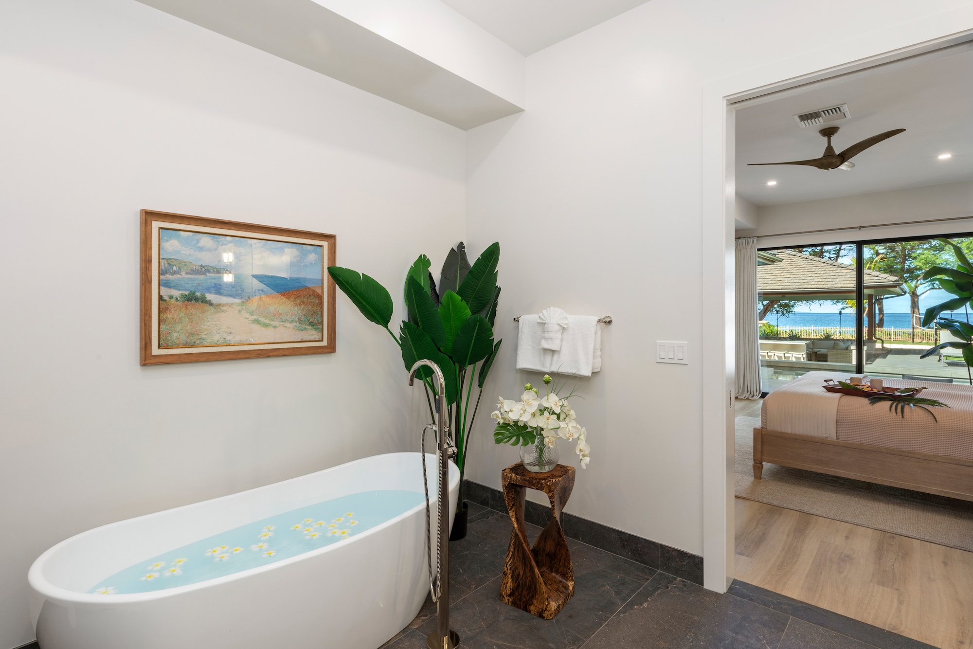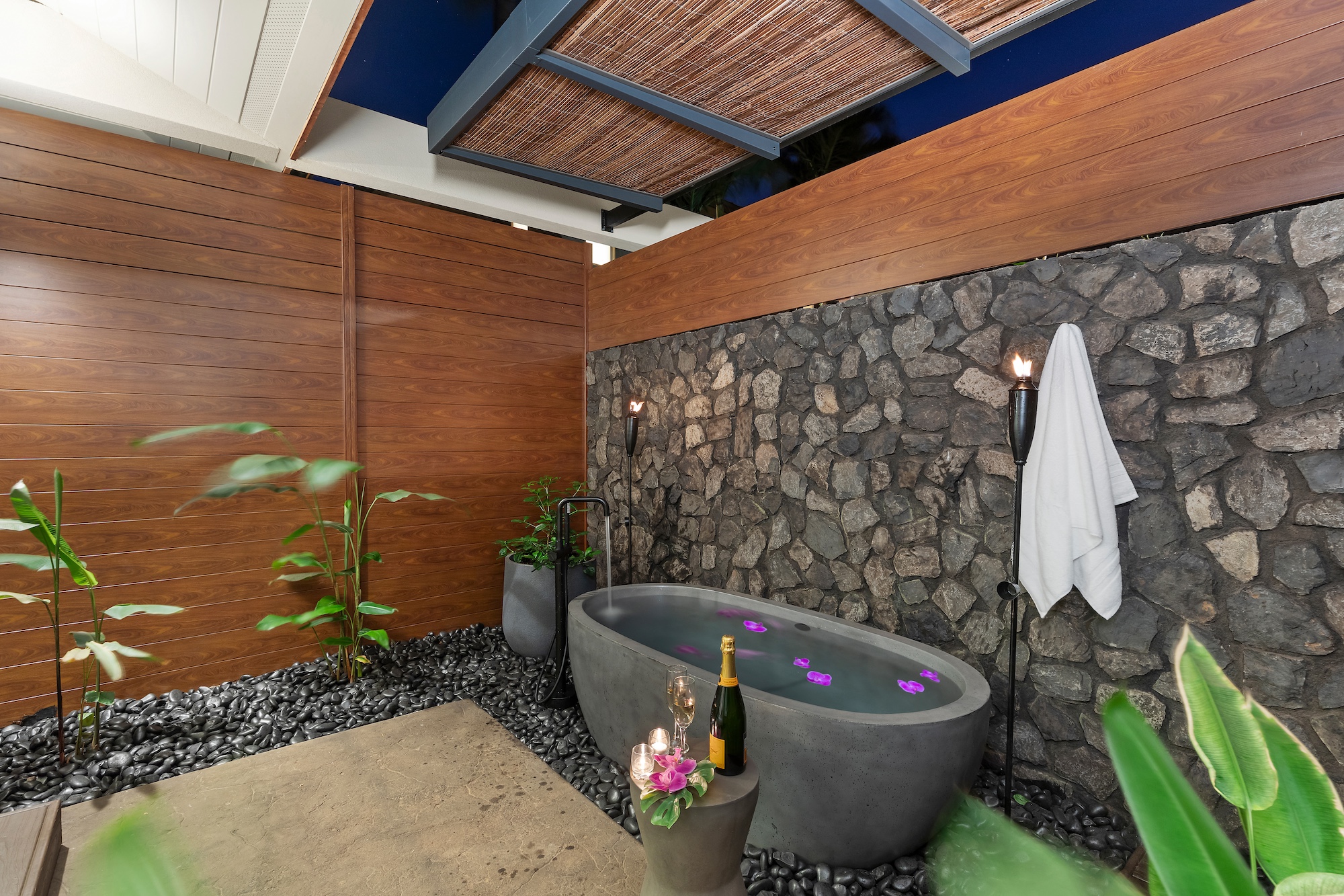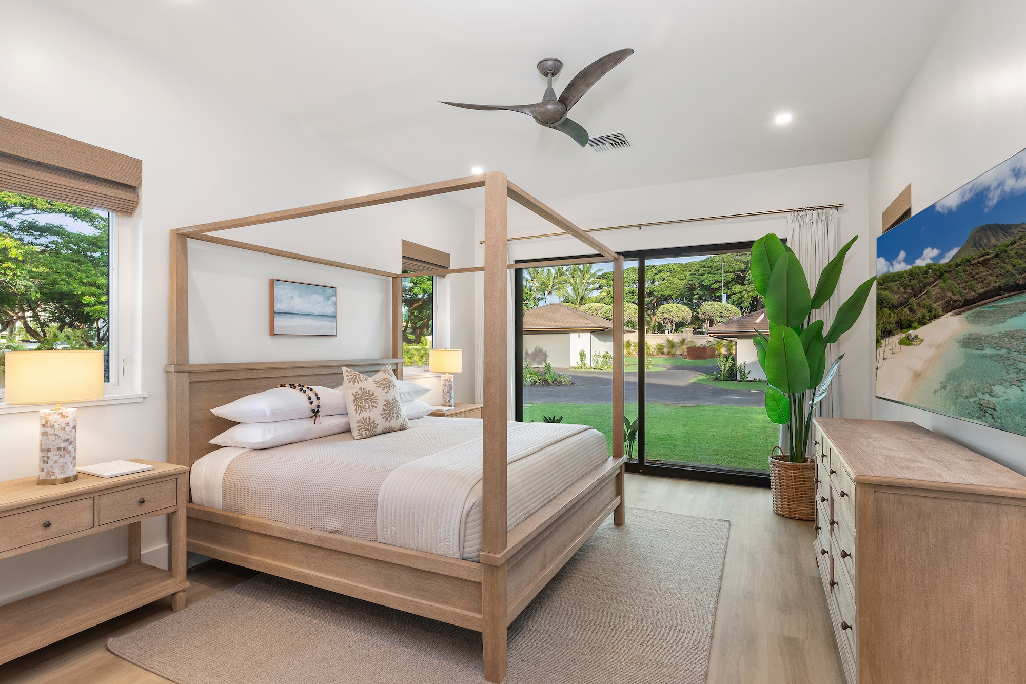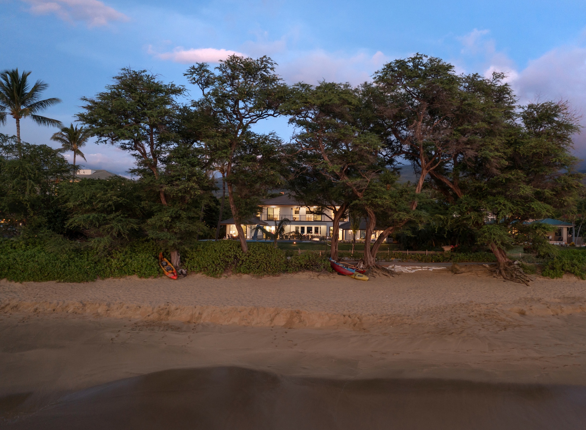 The detached three-bedroom suites complete the 11-bedroom villa. Two spacious king suites with en-suite baths, just steps from the main house, provide privacy and extra room for families. Both suites feature outdoor soaking tubs and showers. The final bedroom, known as the Ohana cottage, is perfect for a family of three, offering a king-size bed, a pullout sofa, a full kitchen, and laundry. Opposite the Ohana is an air-conditioned indoor gym with everything needed to stay on top of your fitness goals.