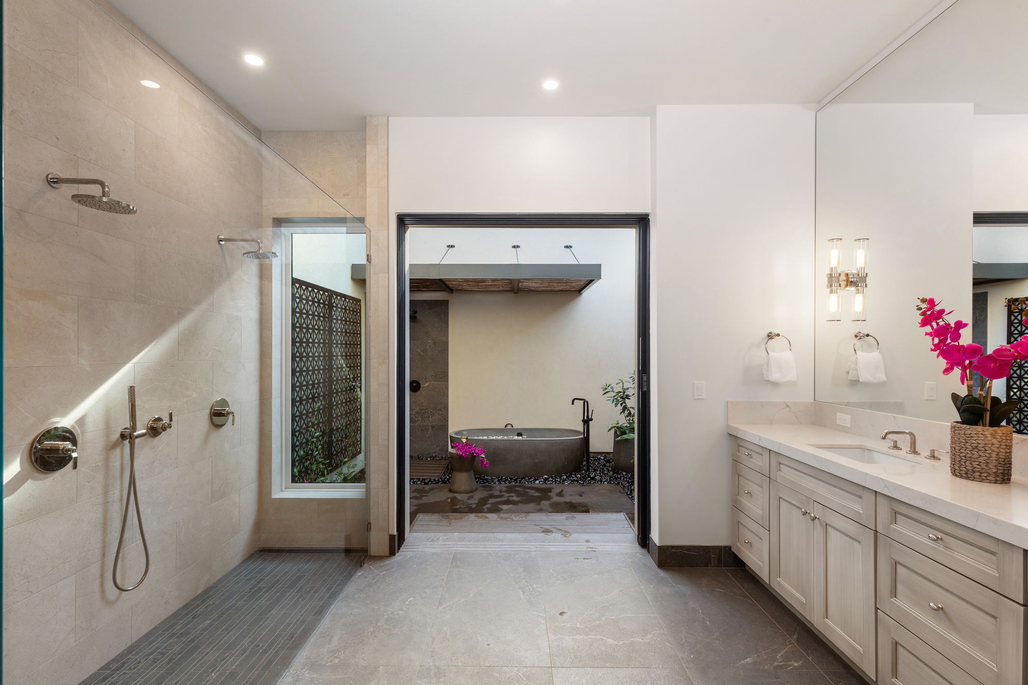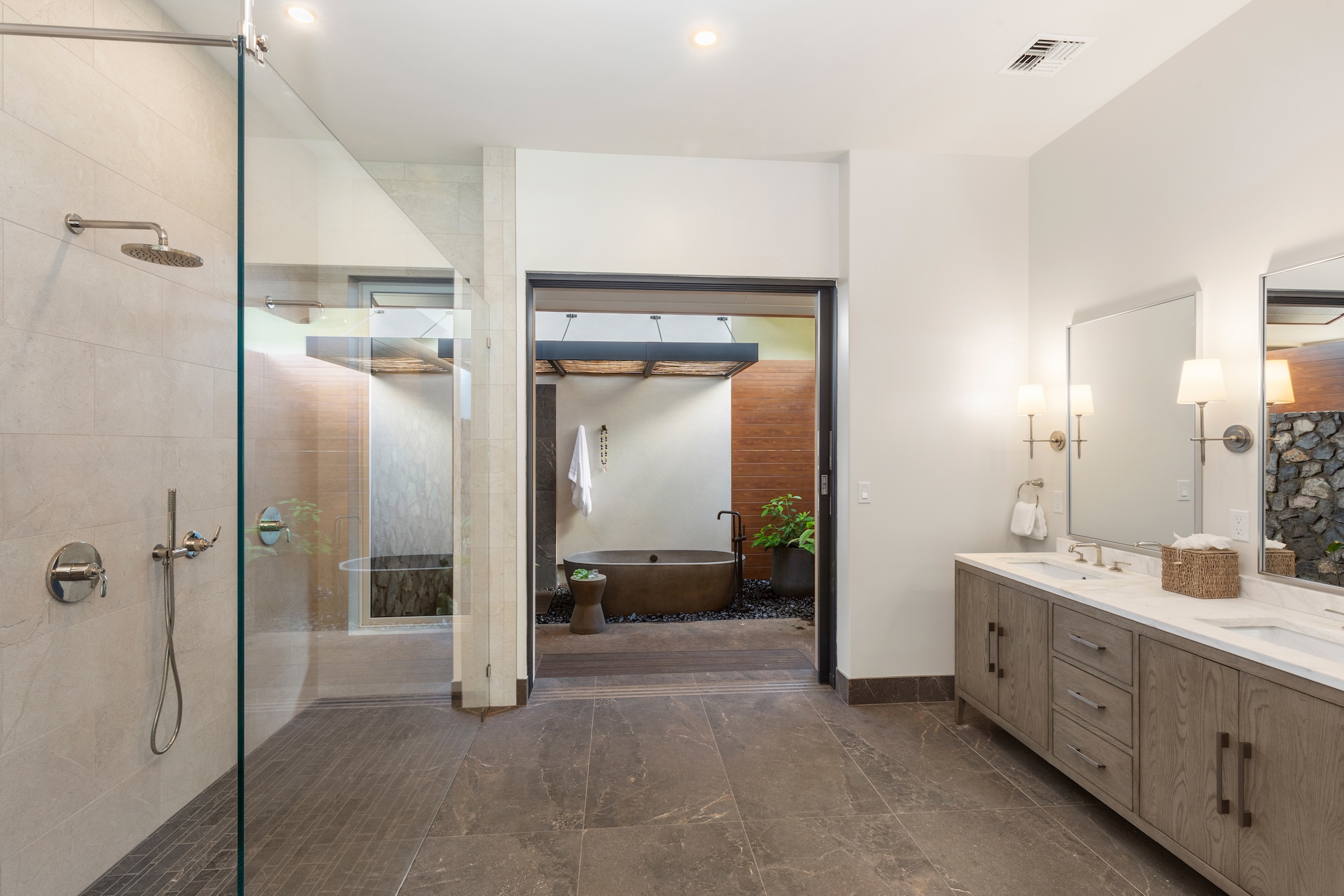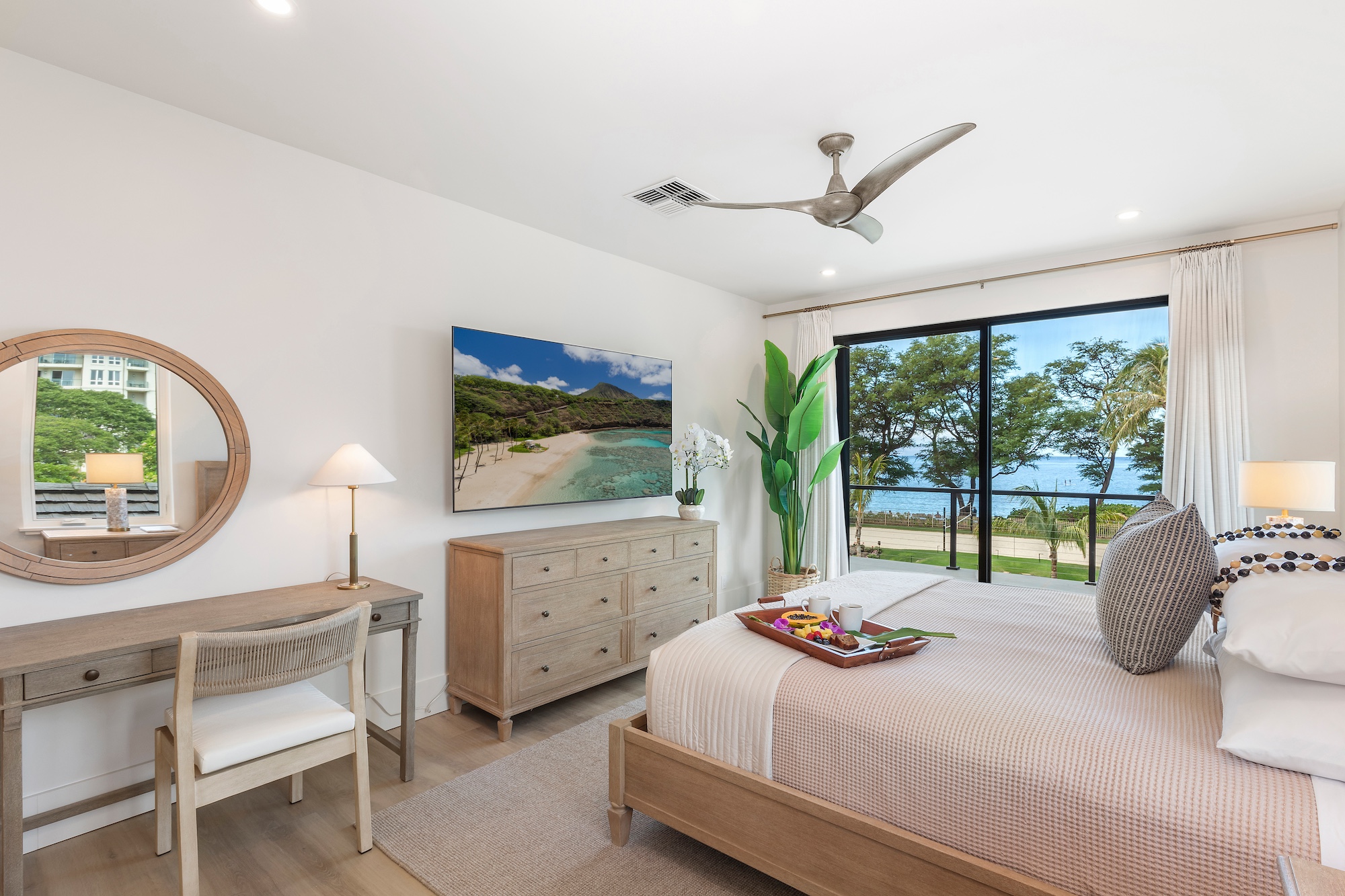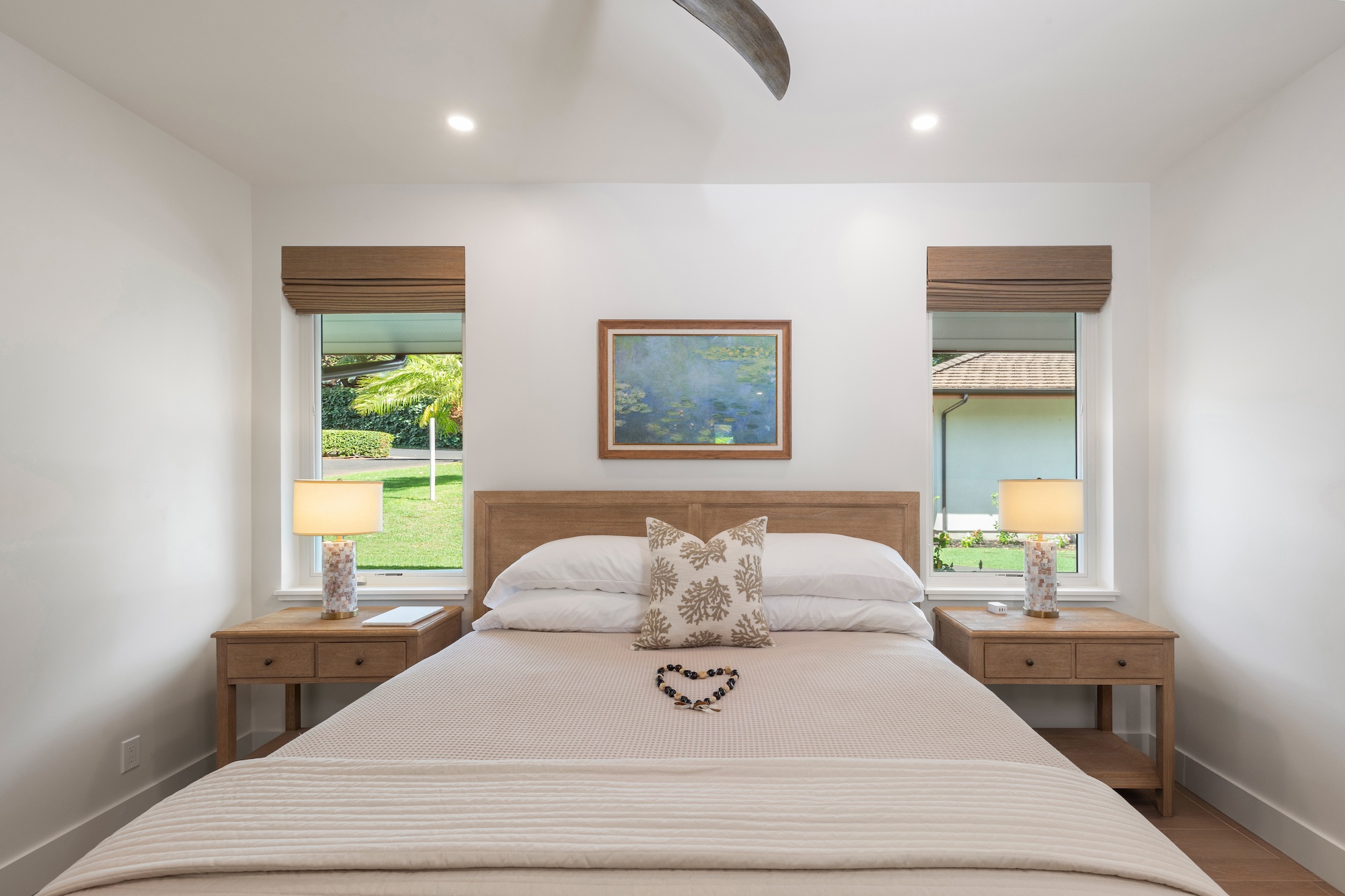 The detached three-bedroom suites complete the 11-bedroom villa. Two spacious king suites with en-suite baths, just steps from the main house, provide privacy and extra room for families. Both suites feature outdoor soaking tubs and showers. The final bedroom, known as the Ohana cottage, is perfect for a family of three, offering a king-size bed, a pullout sofa, a full kitchen, and laundry. Opposite the Ohana is an air-conditioned indoor gym with everything needed to stay on top of your fitness goals.