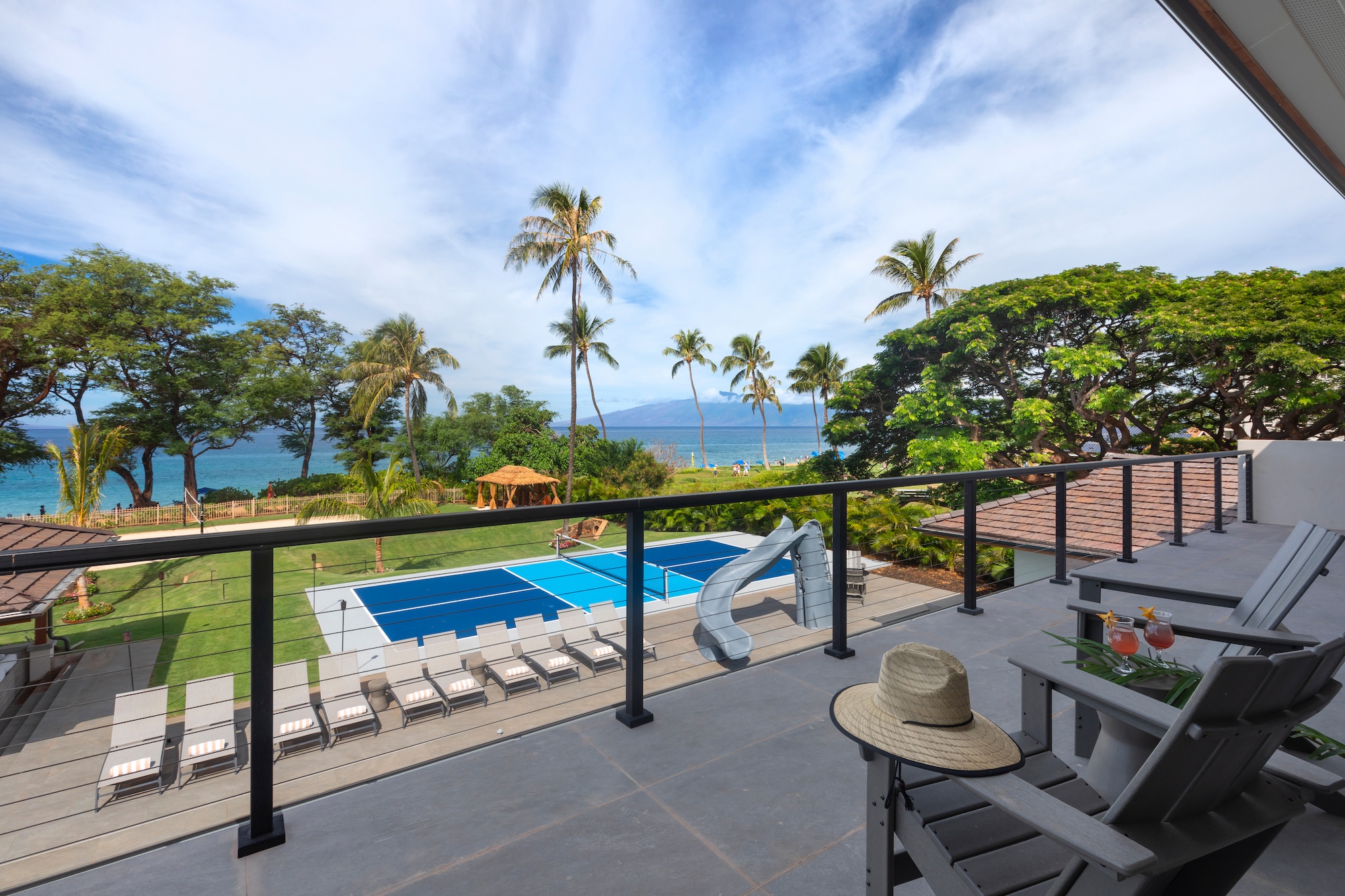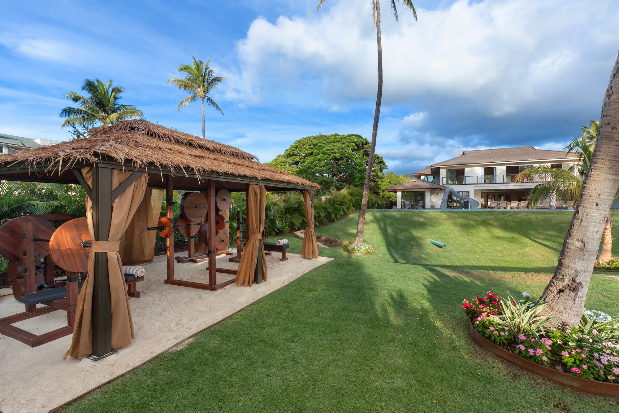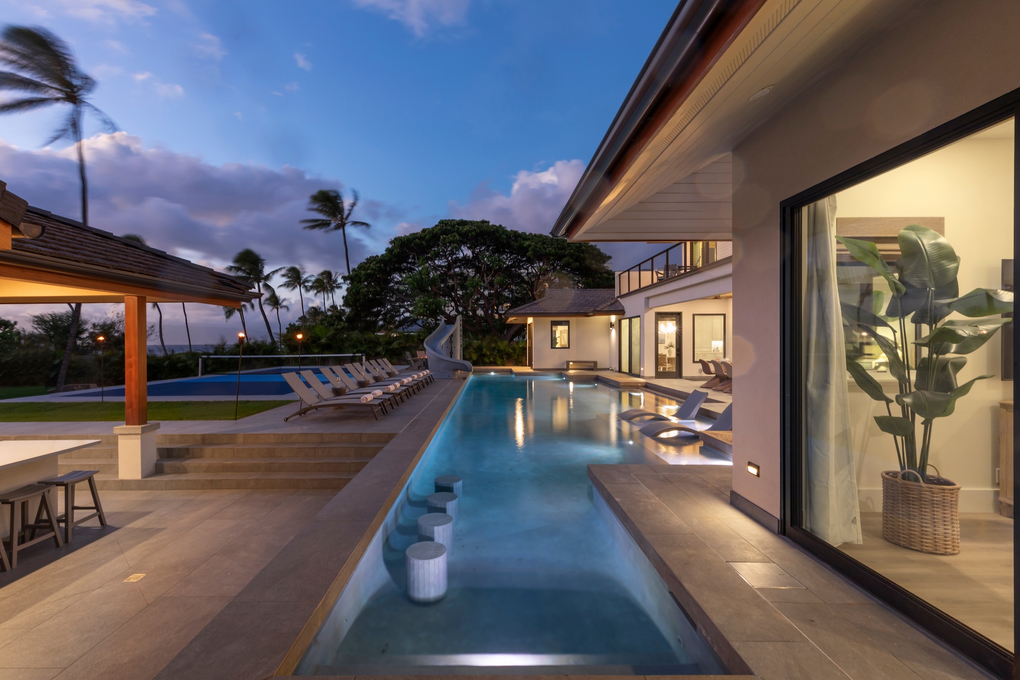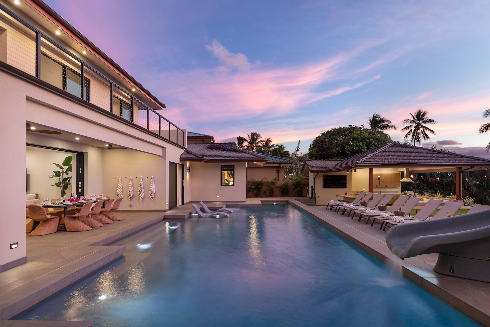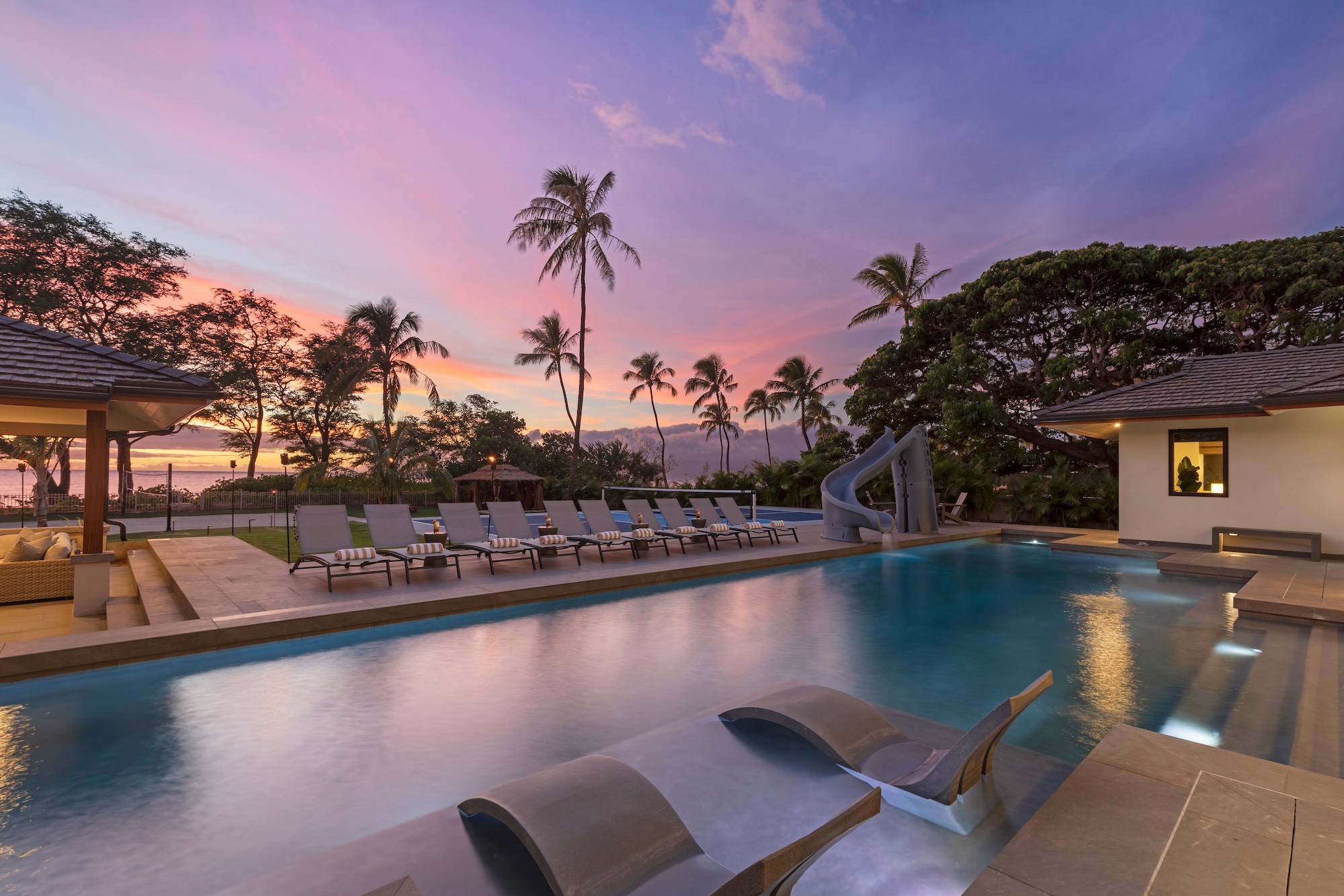 The outdoor spaces at Escape to Tranquility are the estate’s crown jewel. As the first rental on Maui to offer the most requested outdoor amenities in one location, this property features a pickleball court, volleyball court, outdoor gym, private pool with a slide, and a poolside cabana, all nestled within a beautiful one-acre lot.