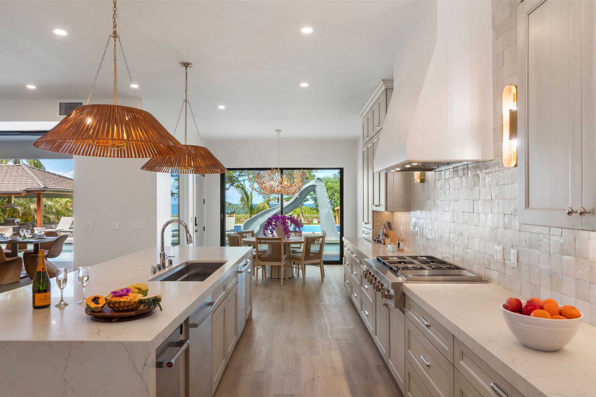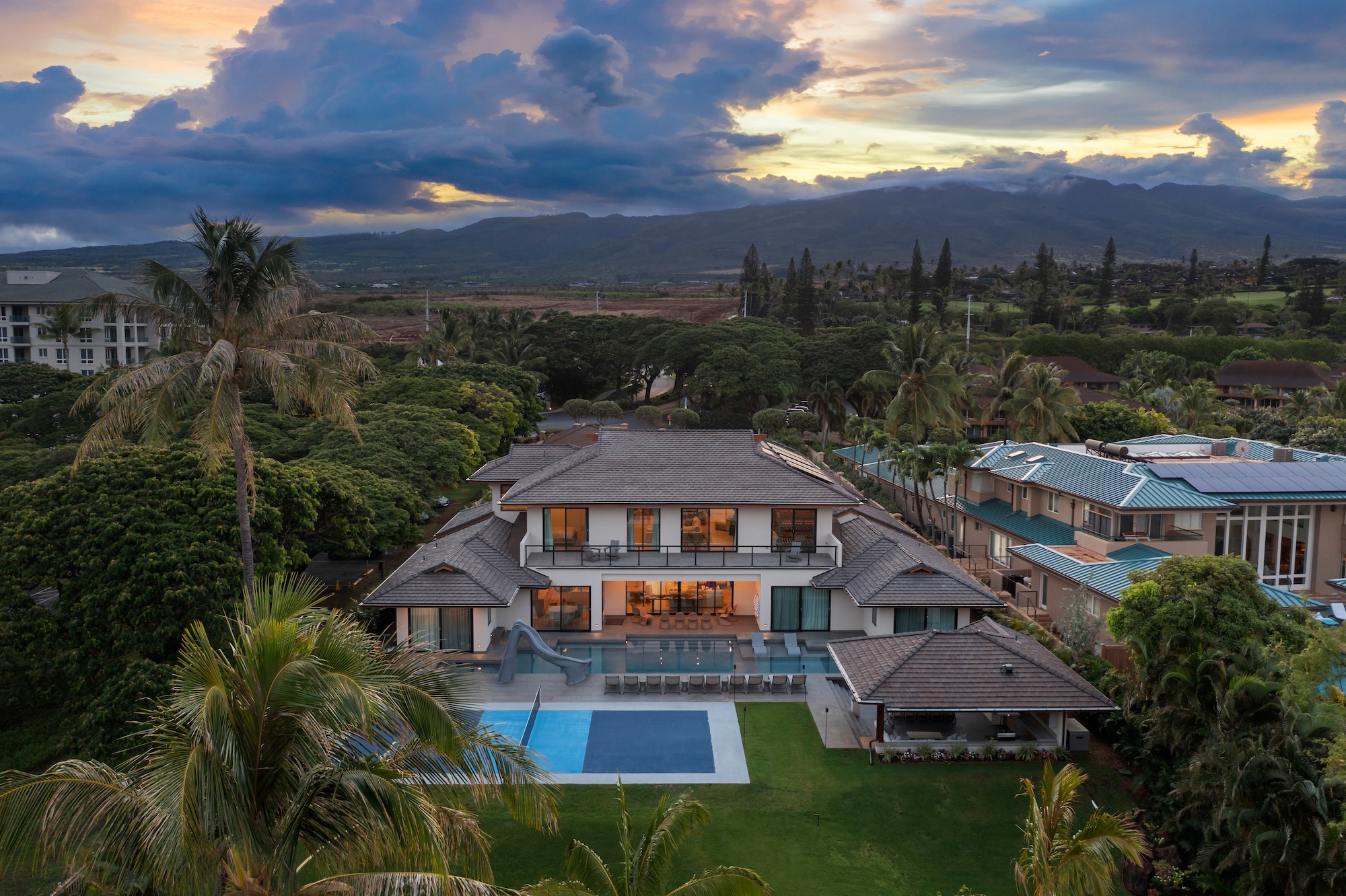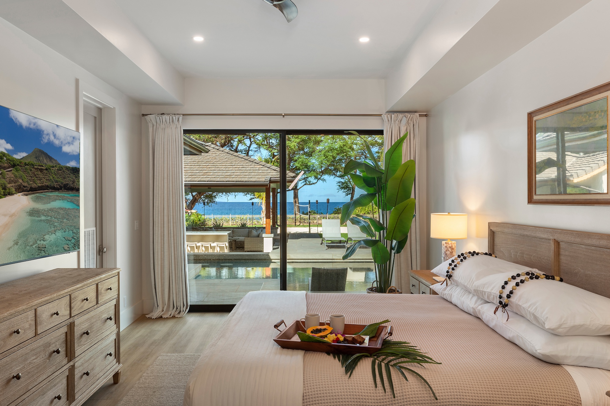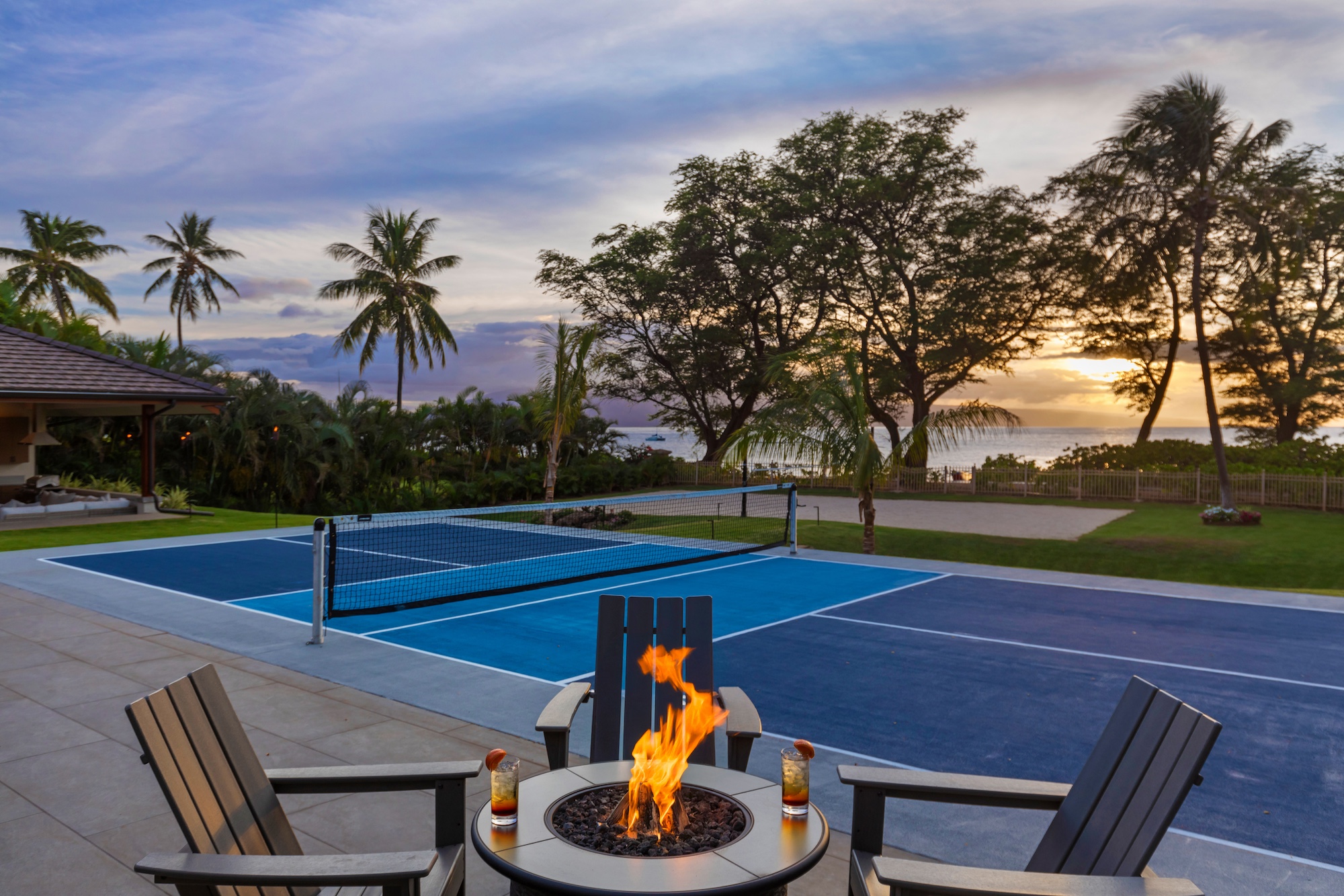 The outdoor spaces at Escape to Tranquility are the estate’s crown jewel. As the first rental on Maui to offer the most requested outdoor amenities in one location, this property features a pickleball court, volleyball court, outdoor gym, private pool with a slide, and a poolside cabana, all nestled within a beautiful one-acre lot.