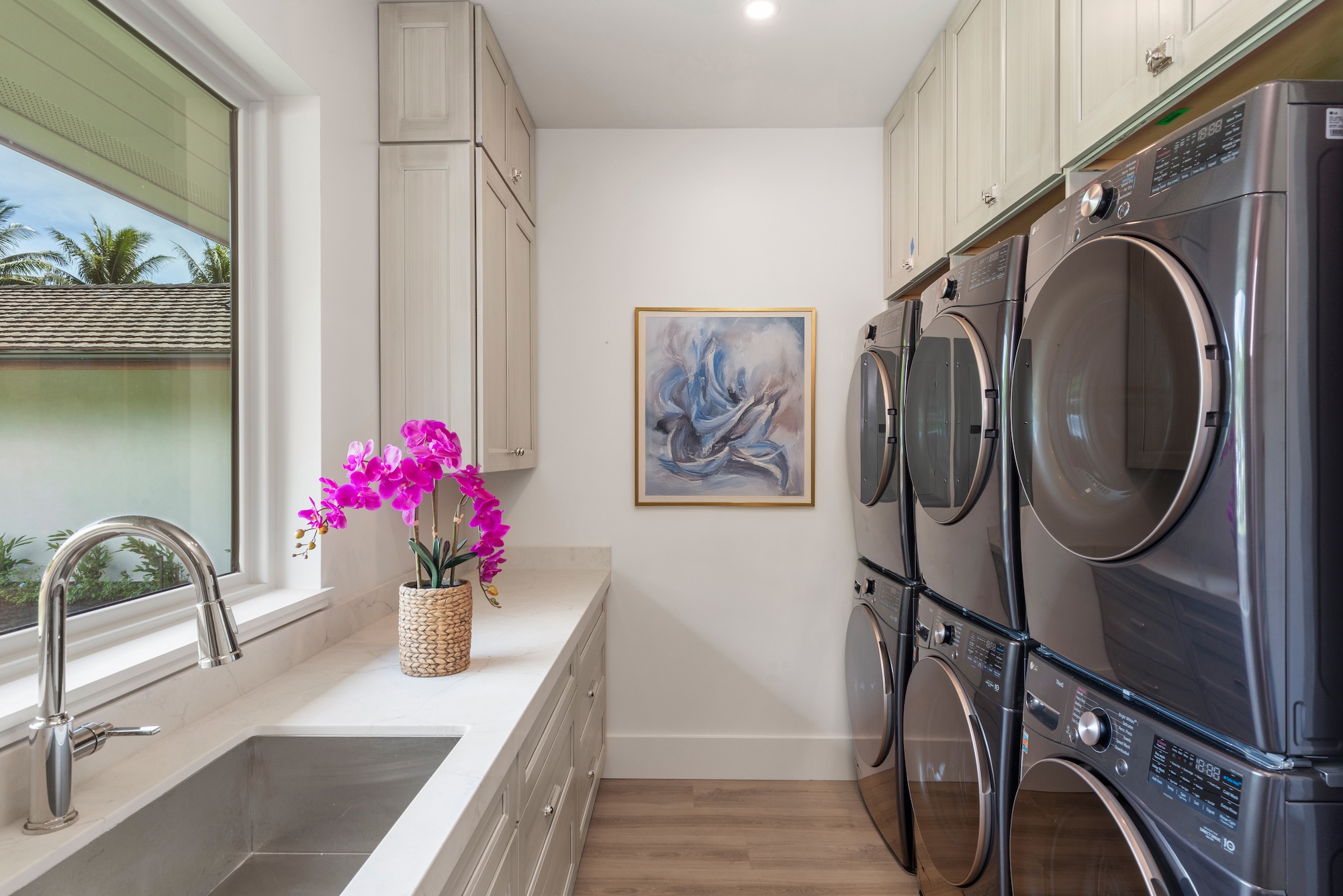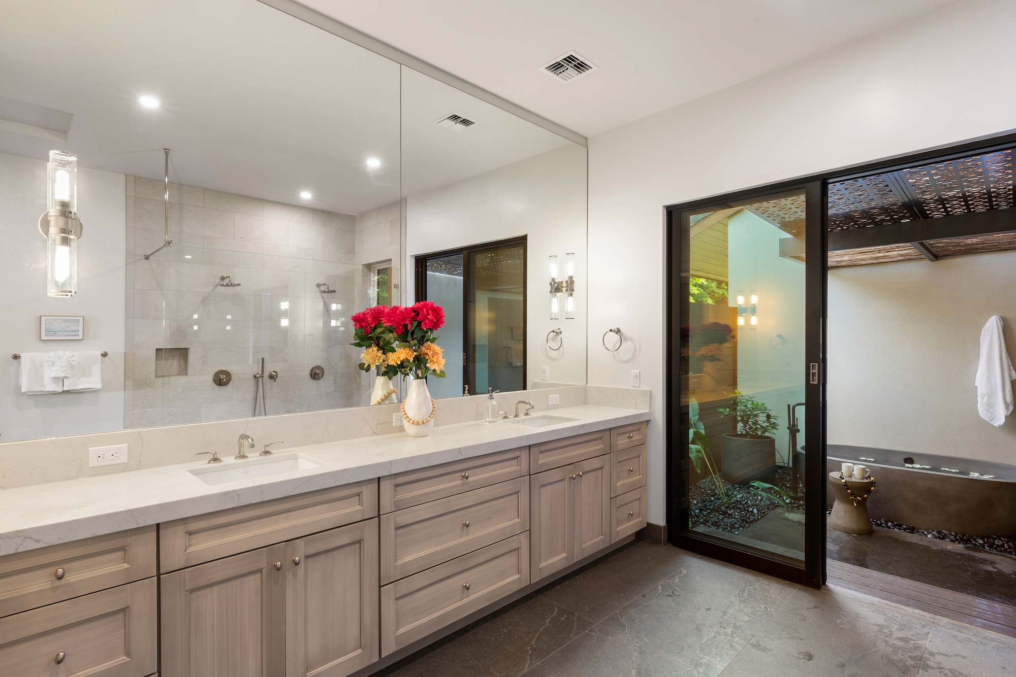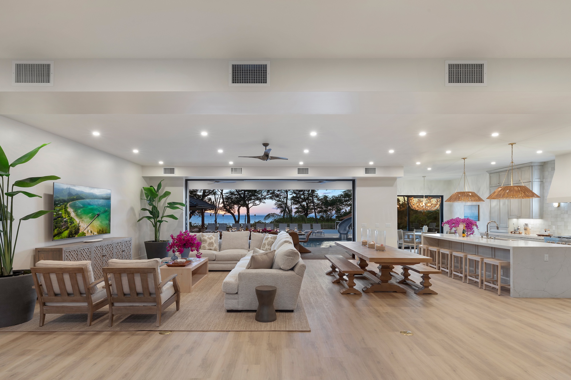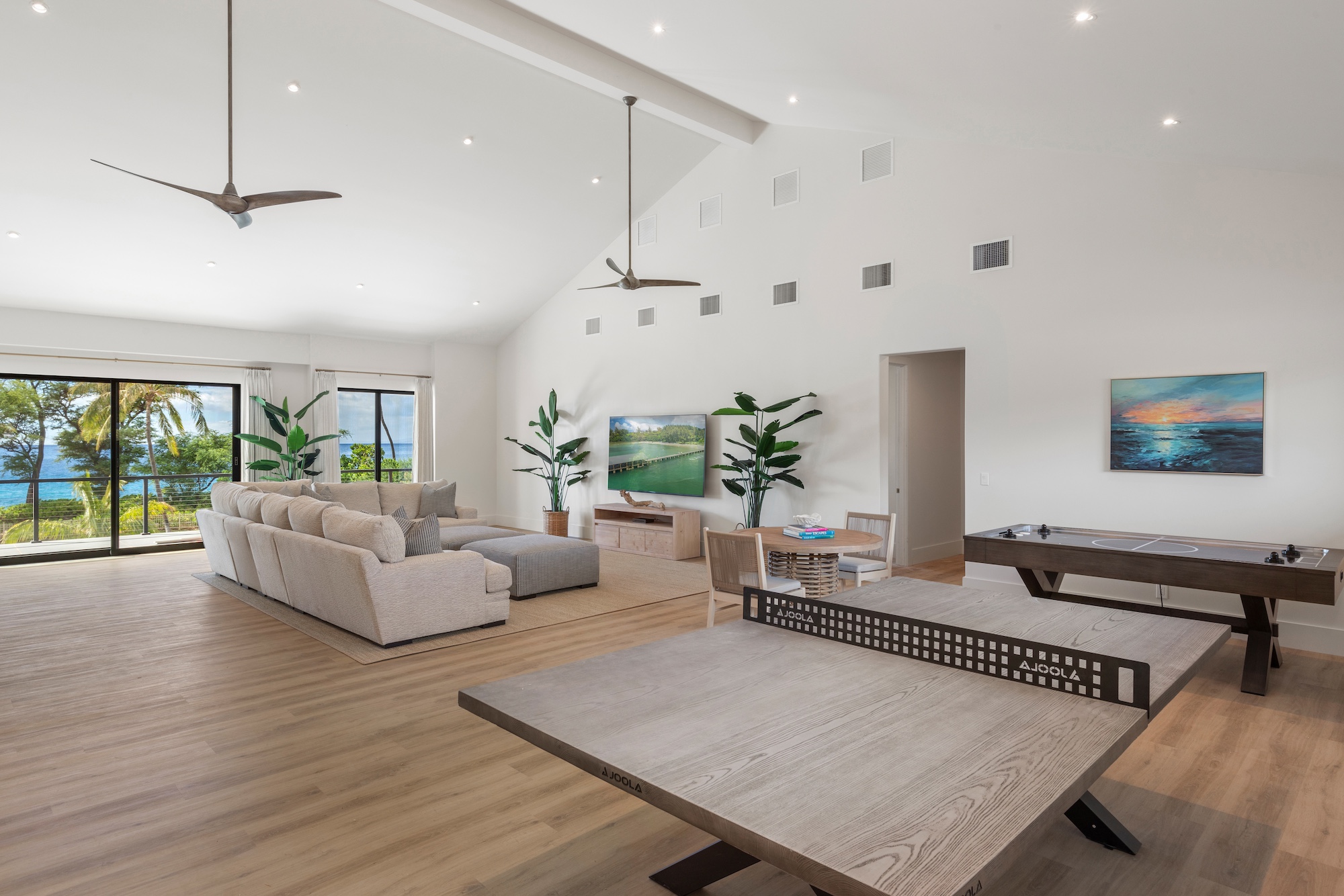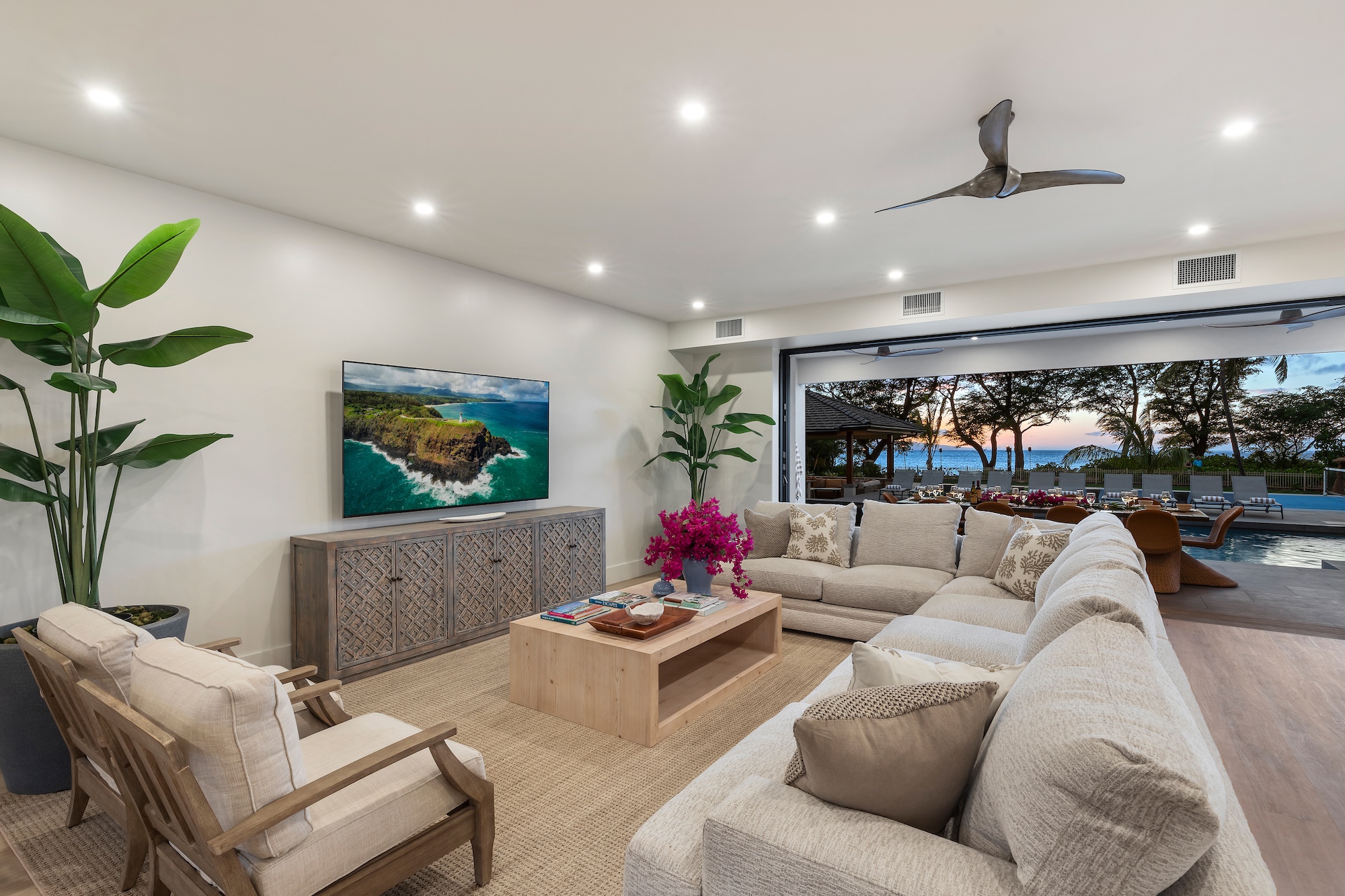 The outdoor spaces at Escape to Tranquility are the estate’s crown jewel. As the first rental on Maui to offer the most requested outdoor amenities in one location, this property features a pickleball court, volleyball court, outdoor gym, private pool with a slide, and a poolside cabana, all nestled within a beautiful one-acre lot.