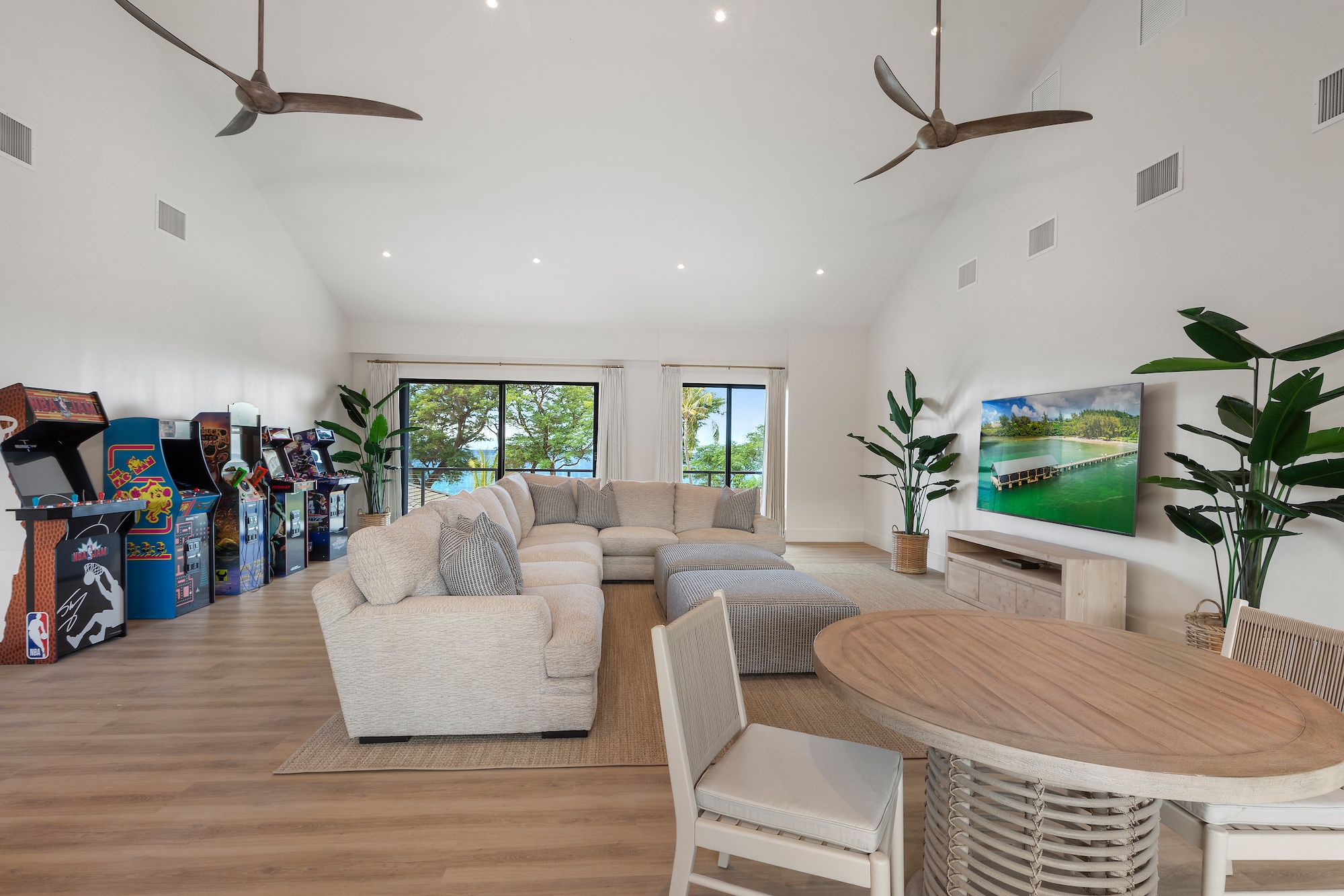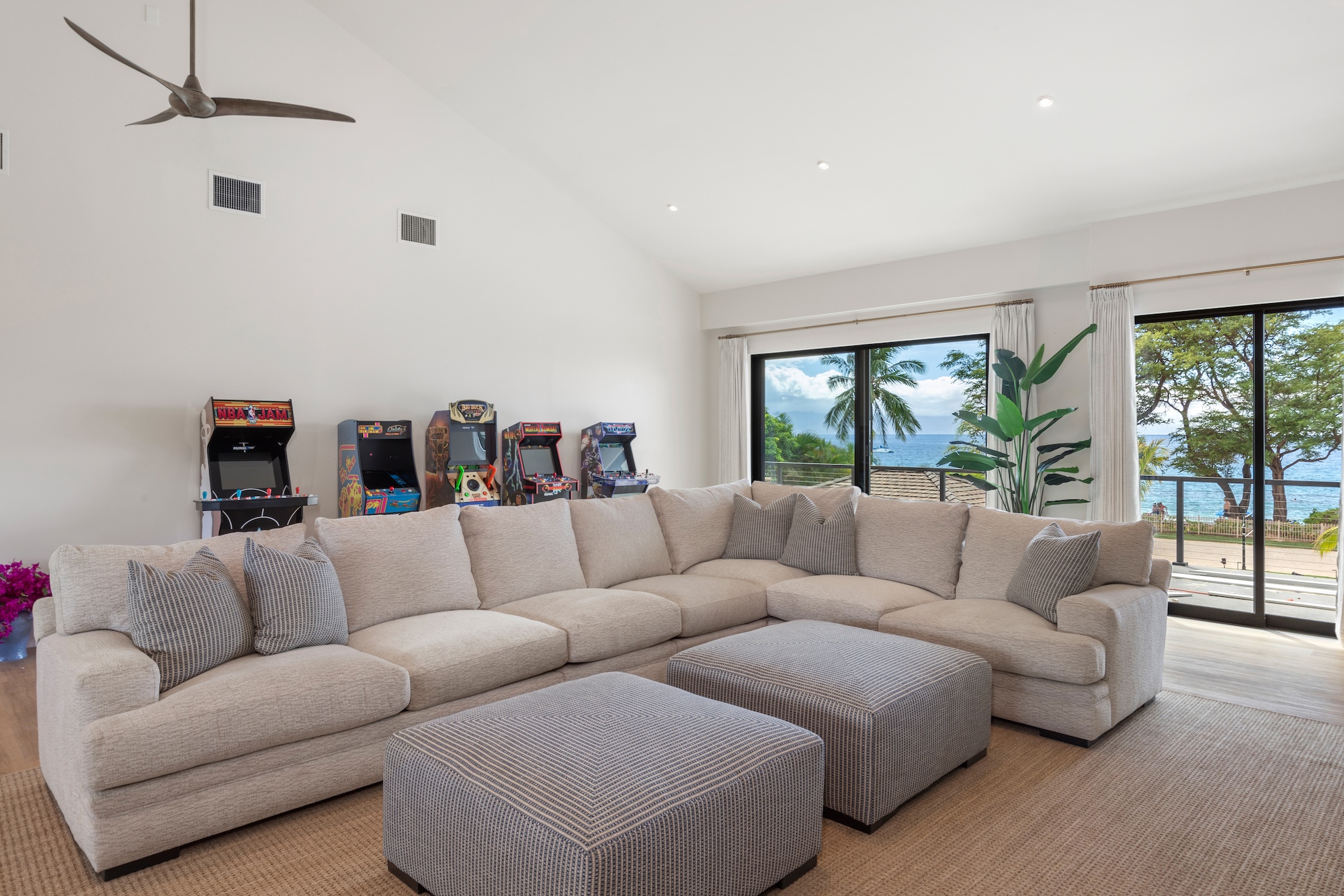 Inside, the villa’s 11,000 square feet of space offers an inviting, open design. The main house spans two levels, with an expansive living area and kitchen decorated with luxurious touches. Ample seating accommodates your entire group, making it perfect for any occasion. The main floor includes five bedrooms, each with an en-suite bathroom. On the left wing, you’ll find three bedrooms: two king suites just steps from the pool and a garden-view suite with two queen beds. The right wing offers a poolside king suite and a garden-view king suite. Additional amenities include a laundry room and a convenient butler’s kitchen. On the second floor, you’ll discover another large living space with unique arcade machines, a ping pong table, and a table game area, as well as two king bedrooms with a shared bath and a suite with three bunk beds and an en-suite bathroom.