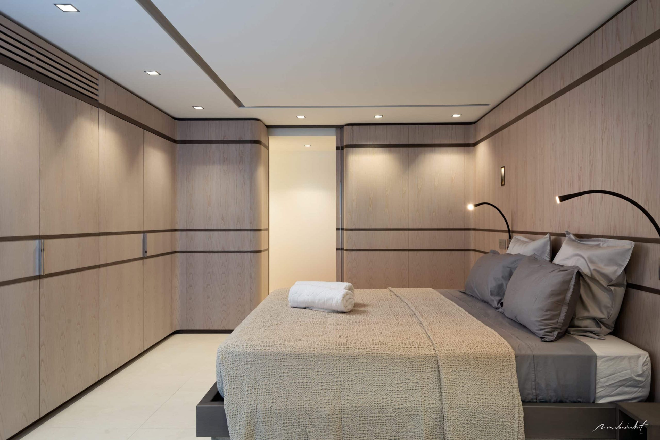 Two bedrooms flank the living area with a third bedroom located on the lower level, connecting to an exercise room.