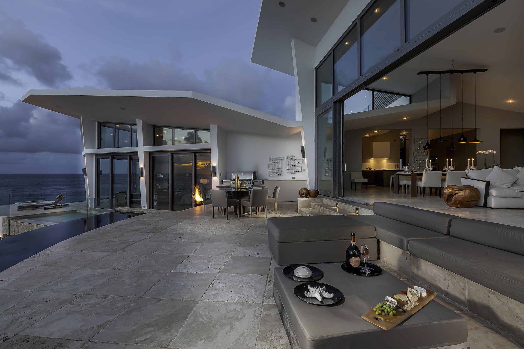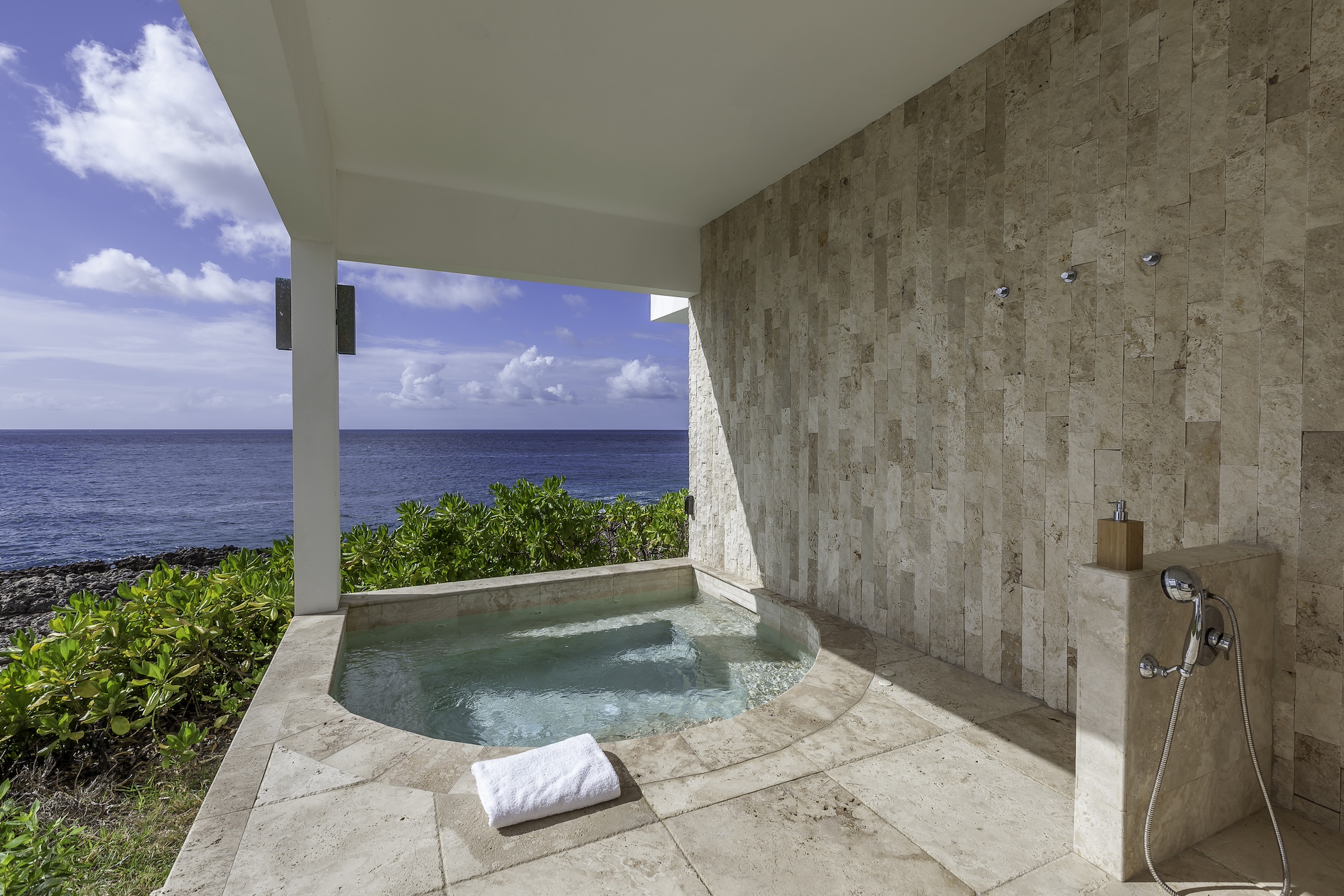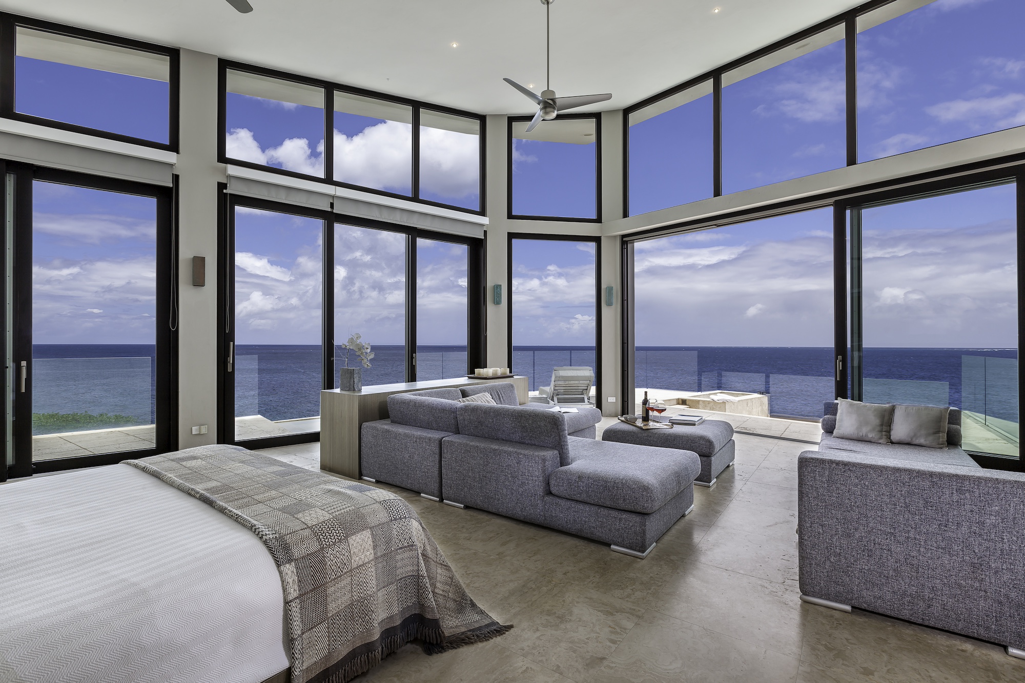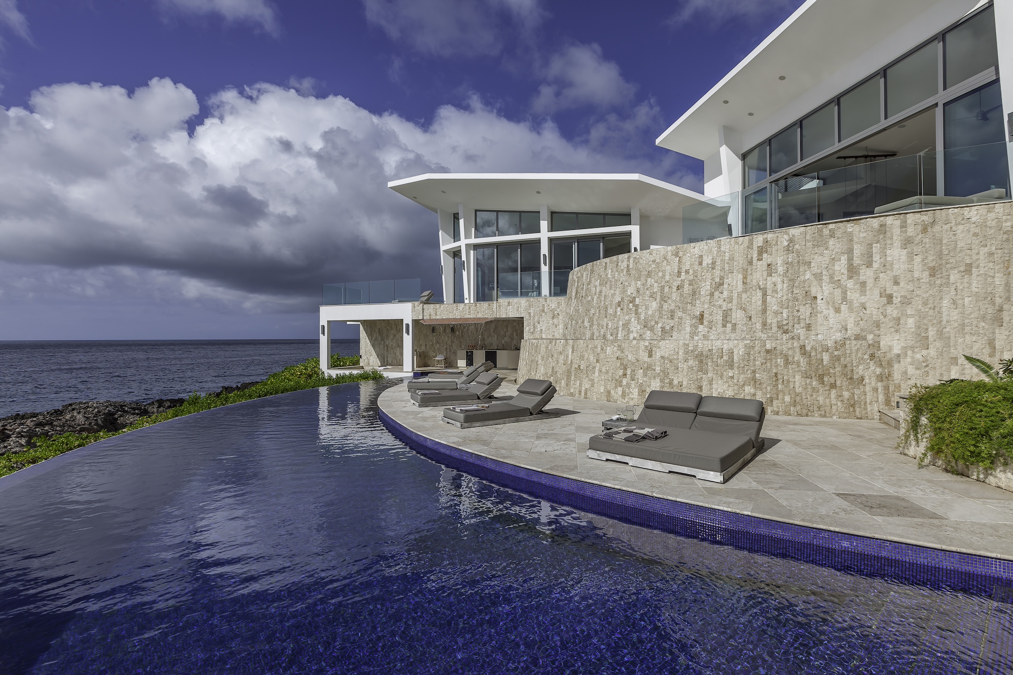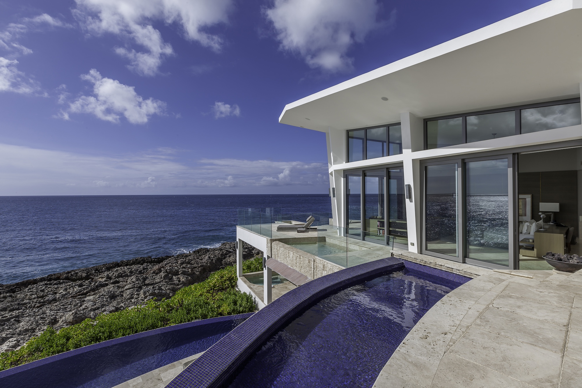 The exterior living areas are designed for relaxation and entertaining, featuring a spacious infinity-edge pool, a grotto-inspired hot tub, and a stylish oceanfront bar. Covered and open-air lounge and dining spaces invite guests to enjoy refreshing trade winds and uninterrupted views of the brilliant Atlantic waters.