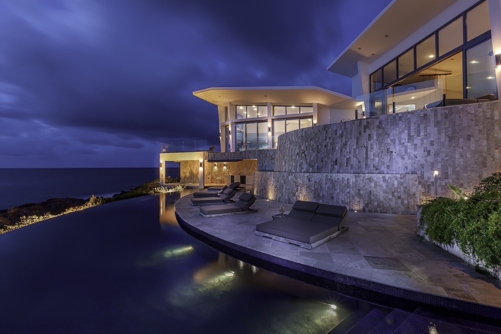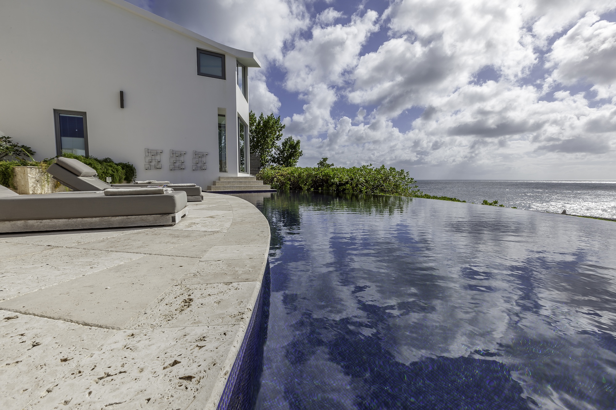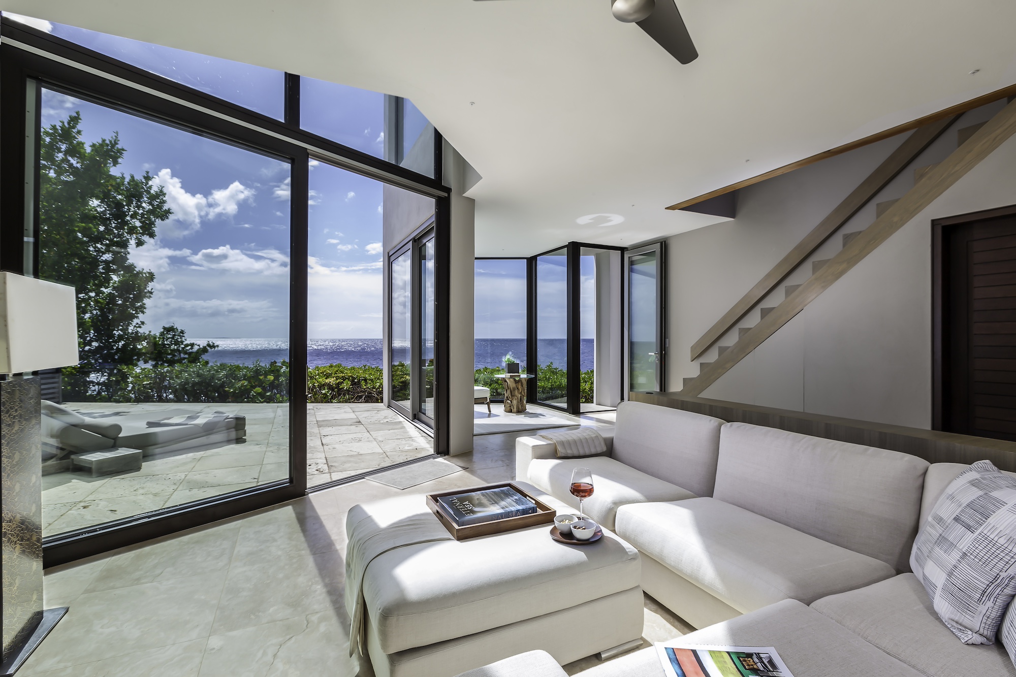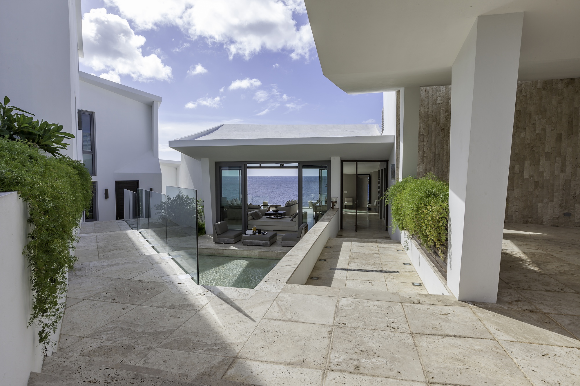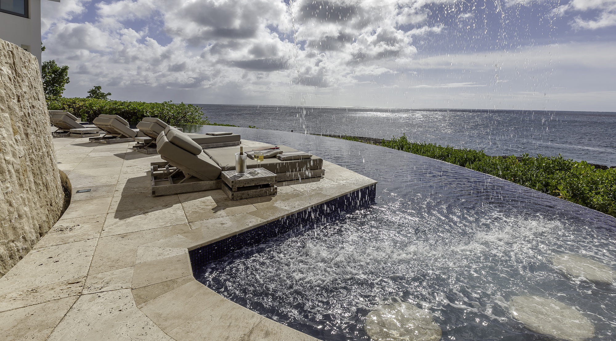 The exterior living areas are designed for relaxation and entertaining, featuring a spacious infinity-edge pool, a grotto-inspired hot tub, and a stylish oceanfront bar. Covered and open-air lounge and dining spaces invite guests to enjoy refreshing trade winds and uninterrupted views of the brilliant Atlantic waters.