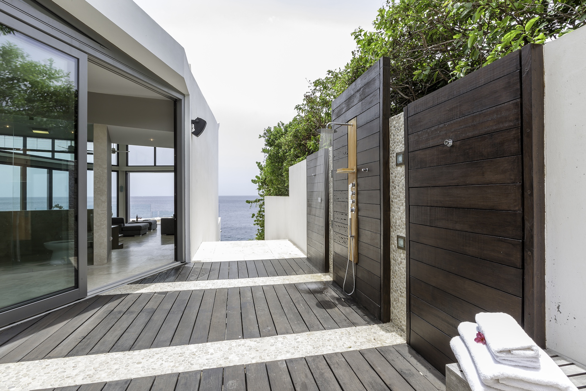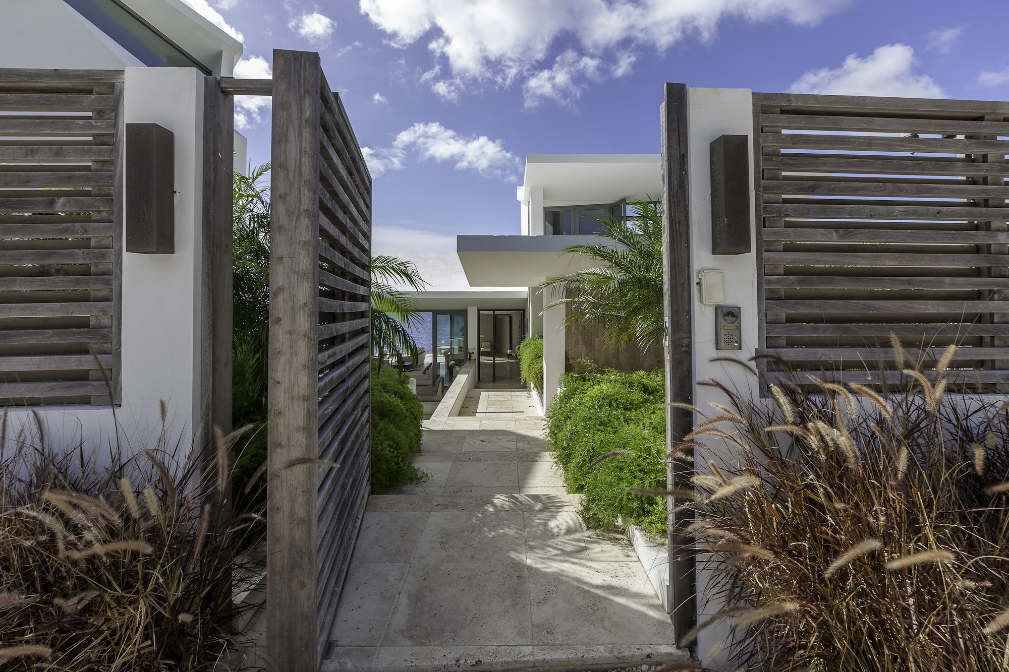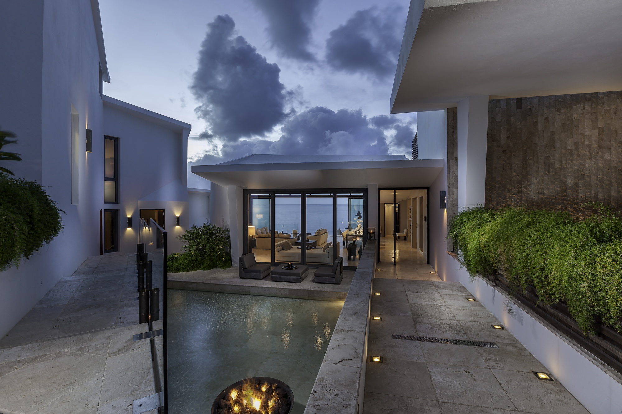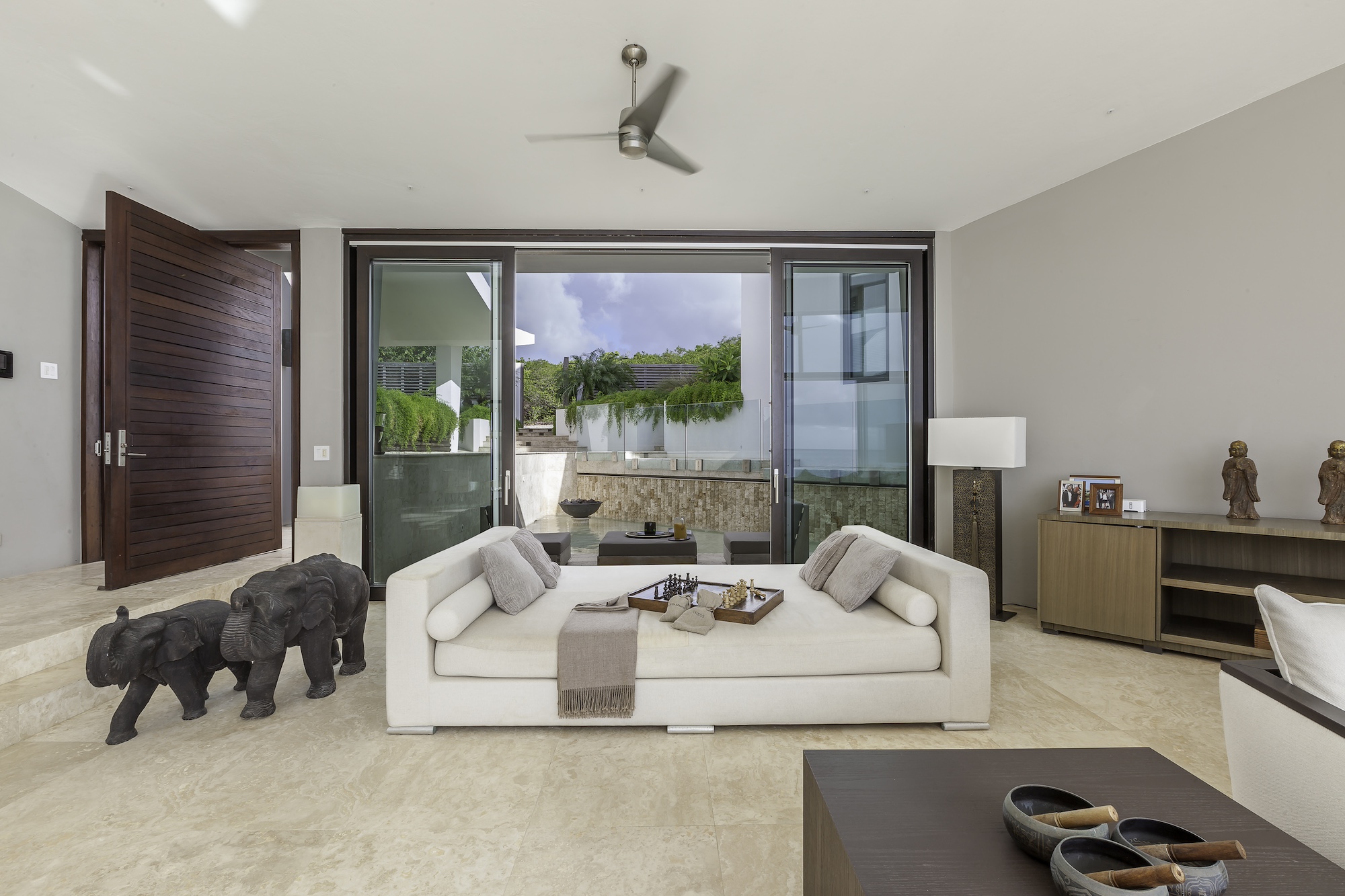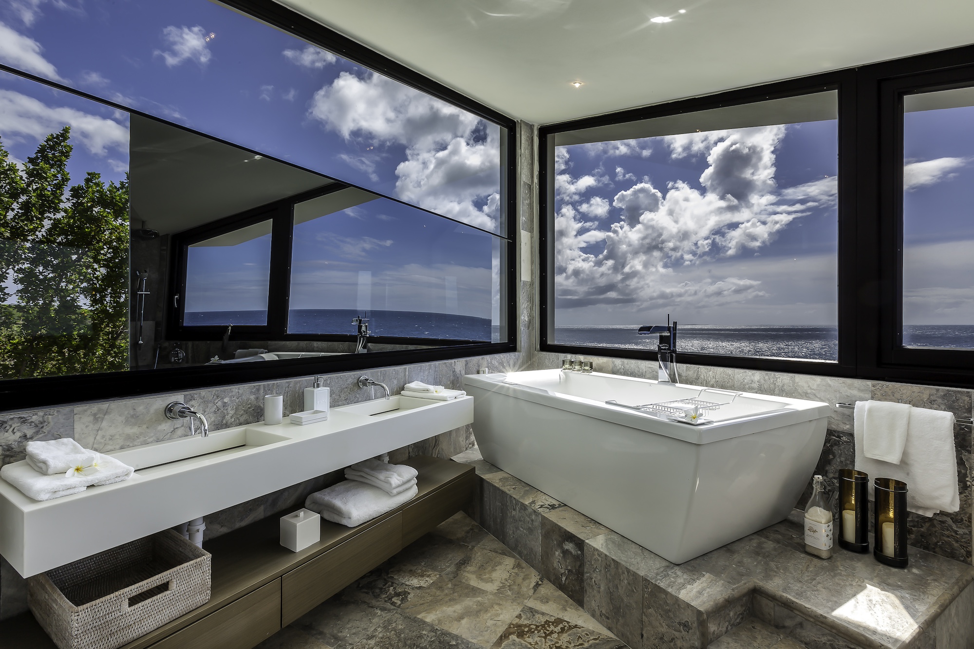 The exterior living areas are designed for relaxation and entertaining, featuring a spacious infinity-edge pool, a grotto-inspired hot tub, and a stylish oceanfront bar. Covered and open-air lounge and dining spaces invite guests to enjoy refreshing trade winds and uninterrupted views of the brilliant Atlantic waters.