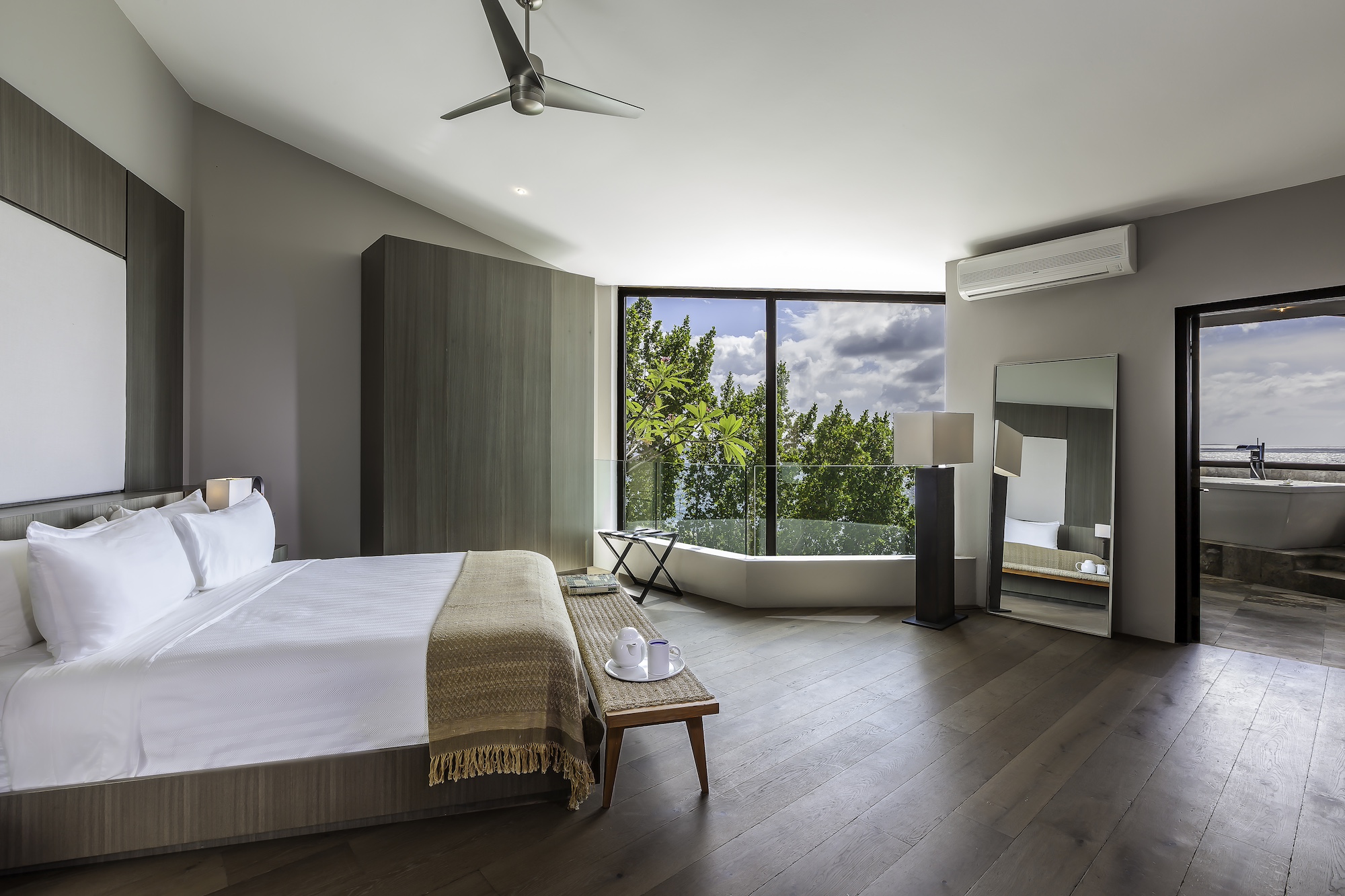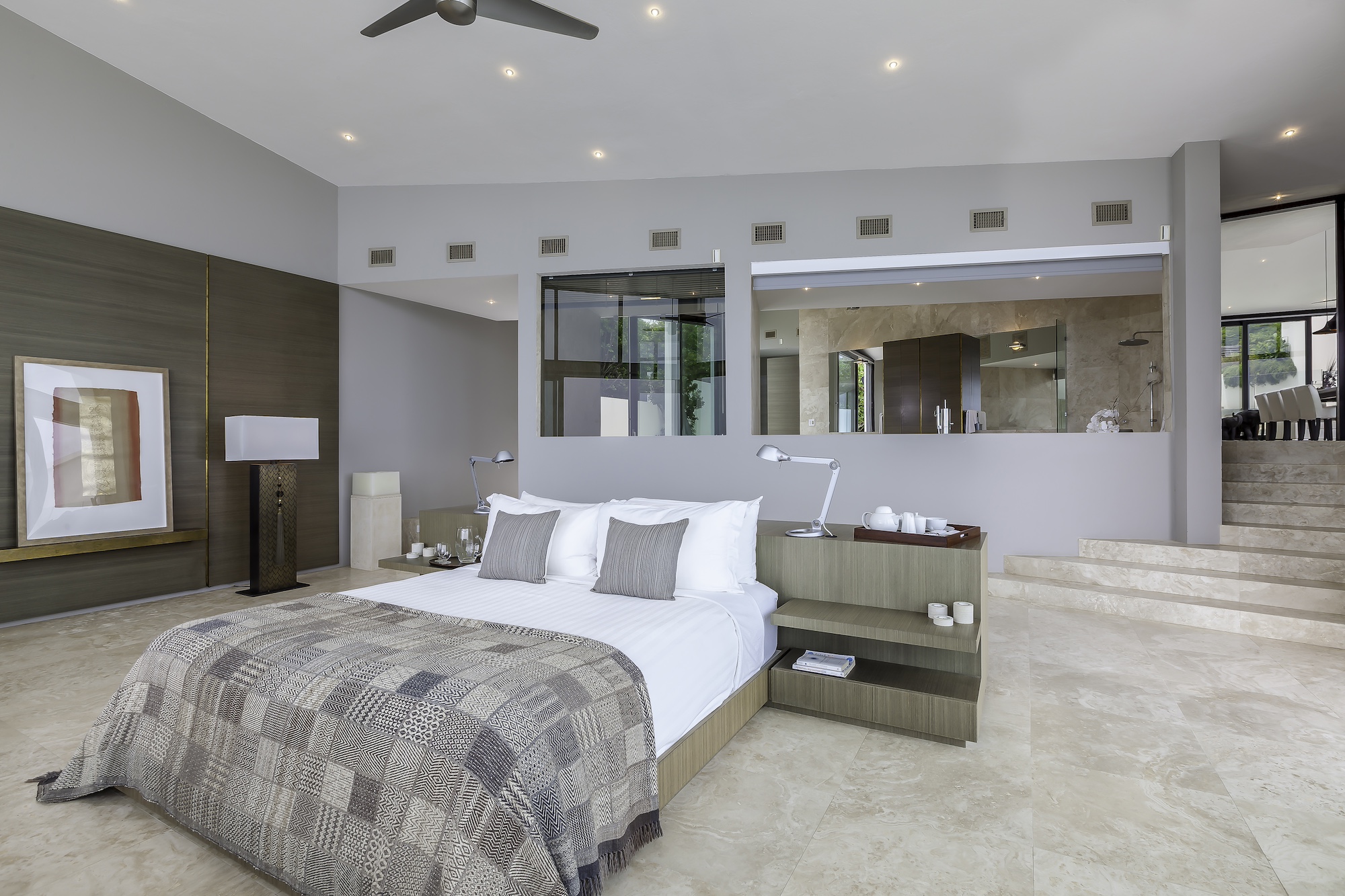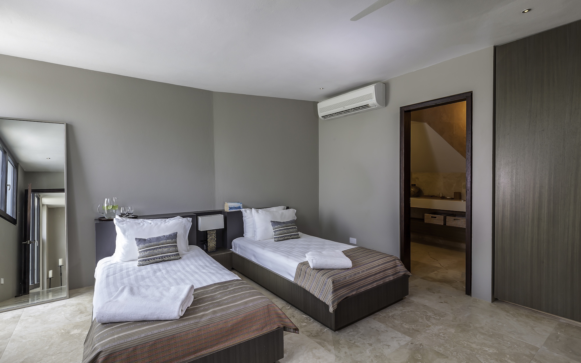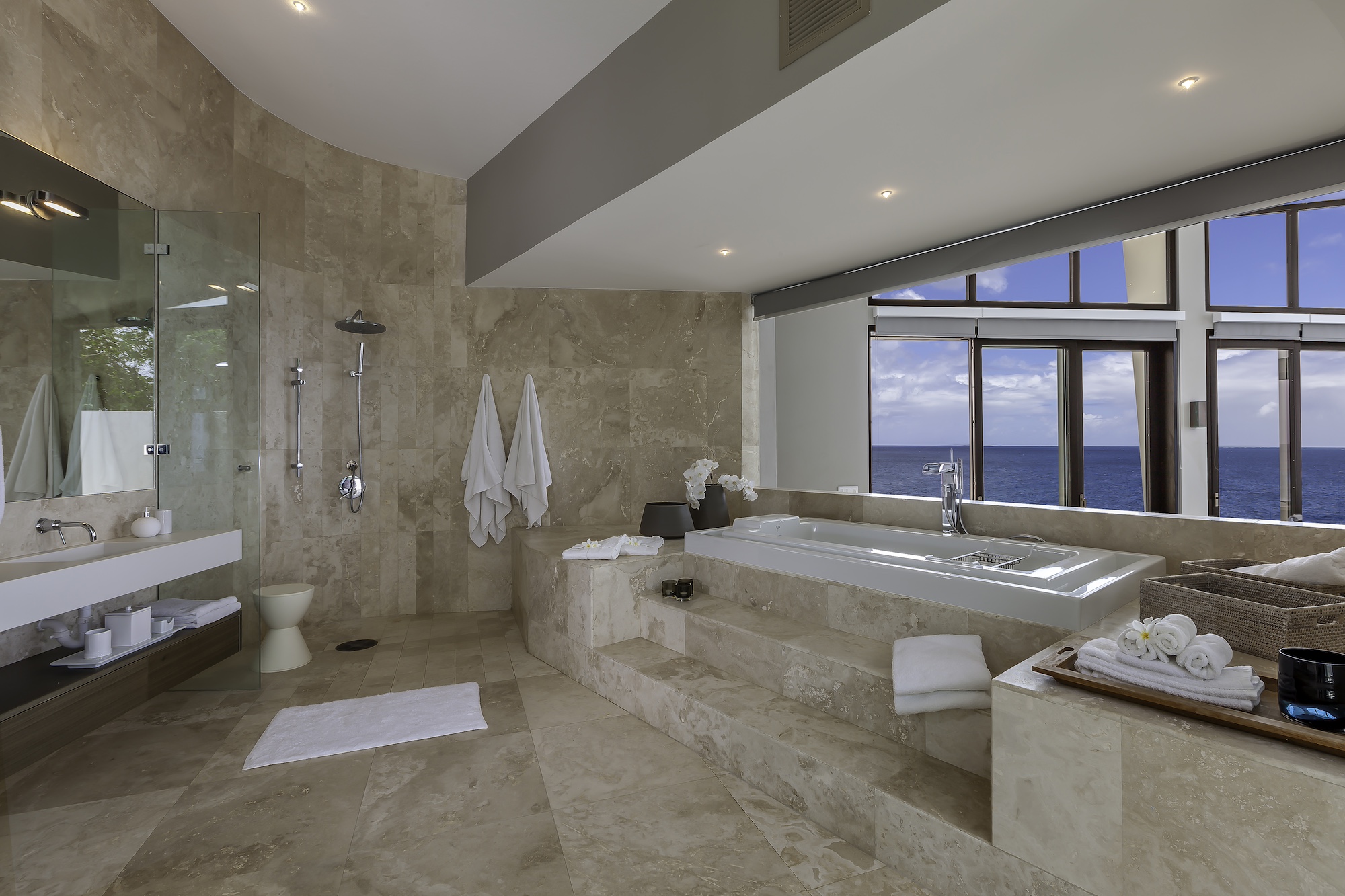 Four private suites are thoughtfully positioned for maximum seclusion, each featuring its own ocean-view terrace, king bed, sitting area, refrigerator, coffee maker, and en suite bathroom. A fifth bedroom with twin beds is available on request, allowing the villa to host up to 10 guests with ease.