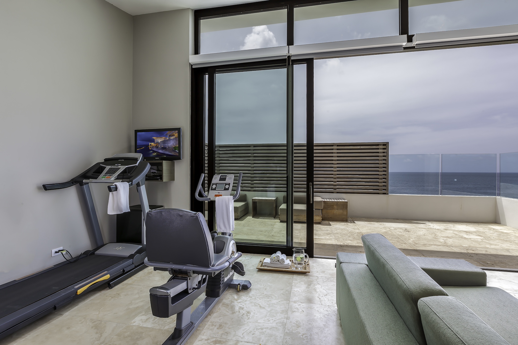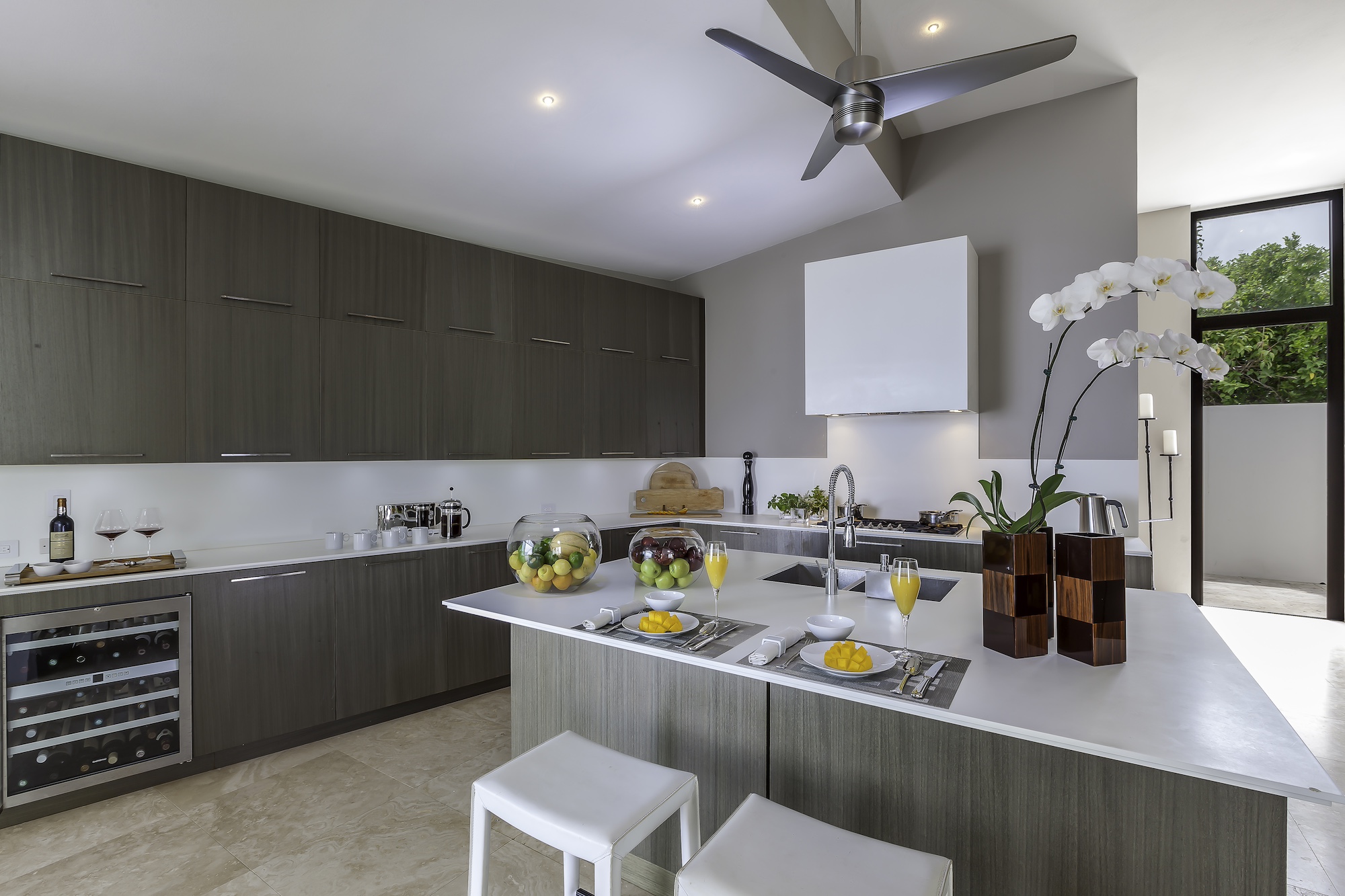 Inside, the airy great room impresses with soaring double-height ceilings and retractable floor-to-ceiling glass that fully connects the interior to the terrace. Both indoor and outdoor dining areas comfortably seat up to twelve guests, while the fully equipped kitchen — complete with an oversized island — overlooks the main gathering space. A dedicated office and a gym/recreation room each open onto a private terrace for added flexibility.