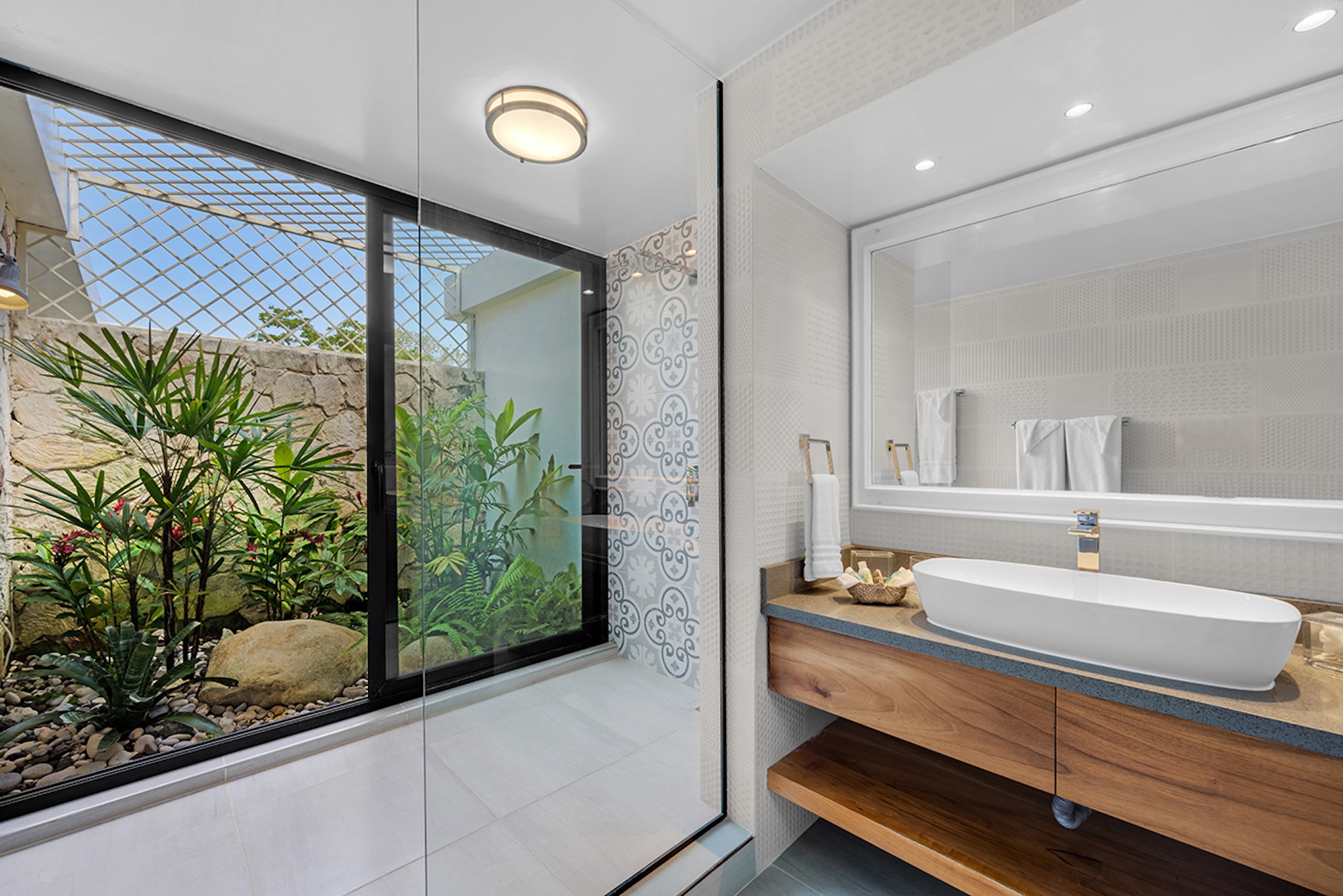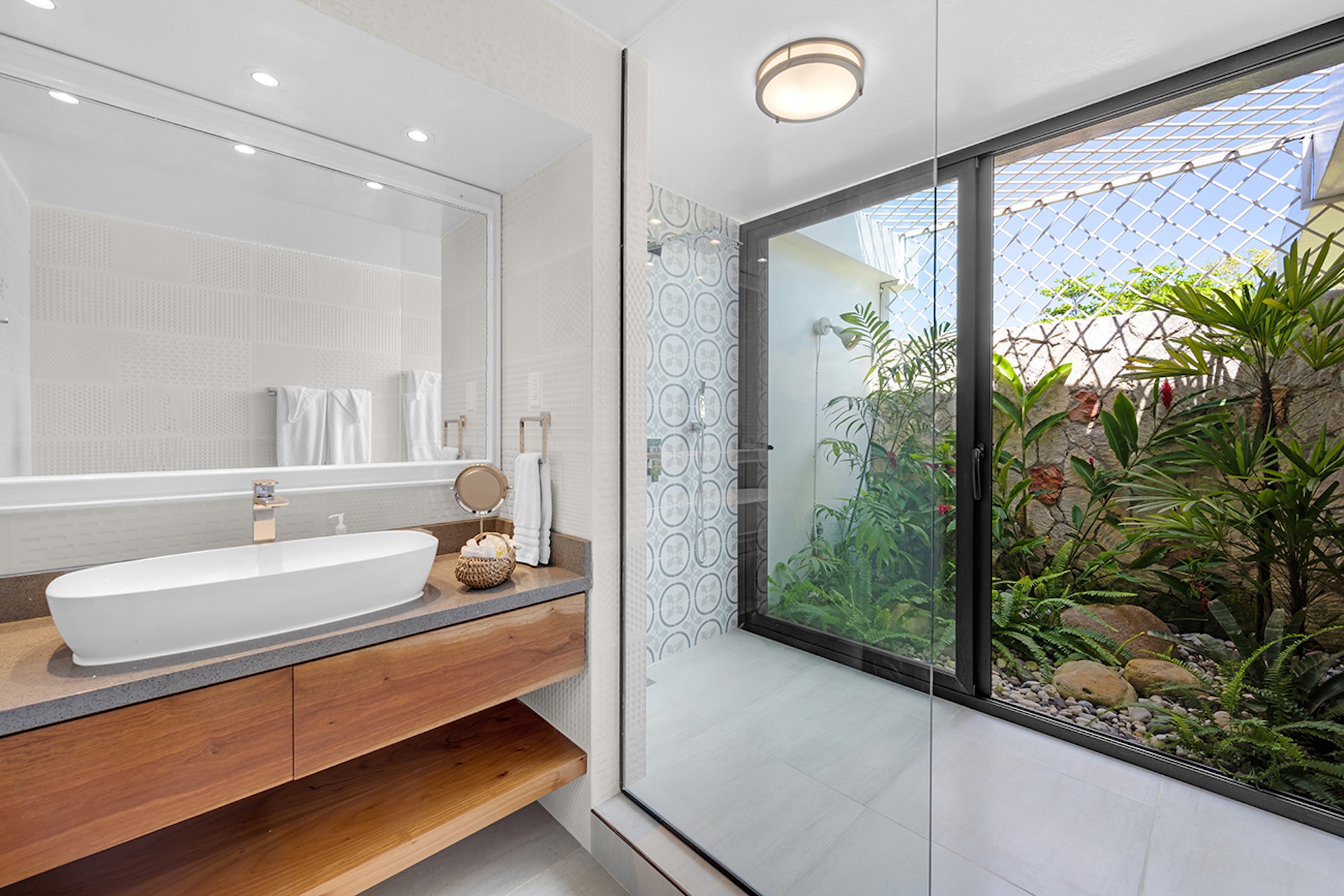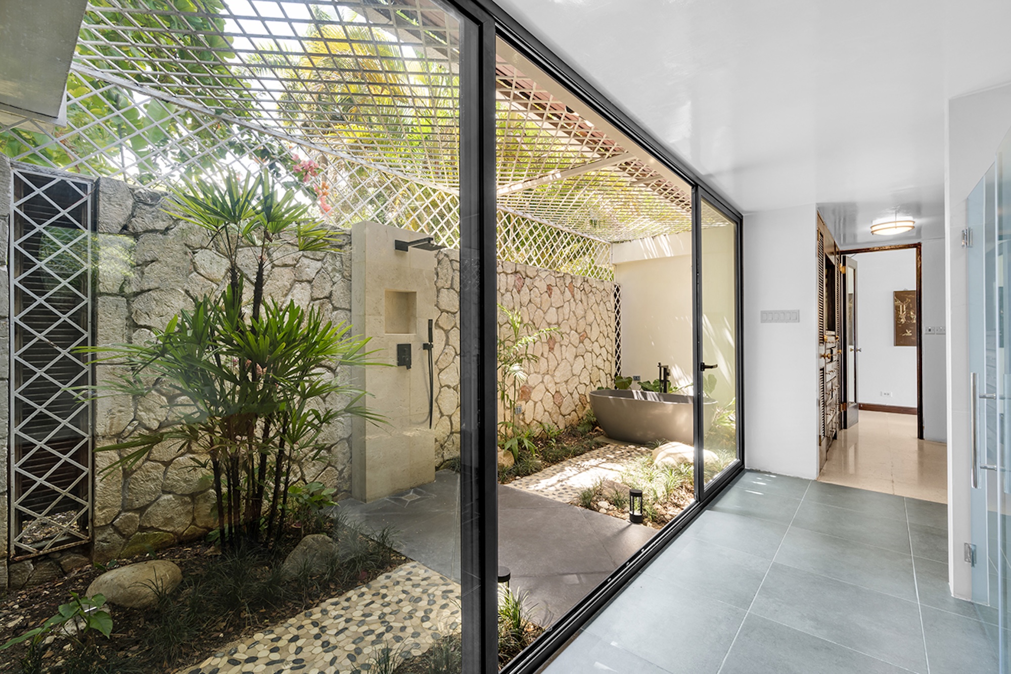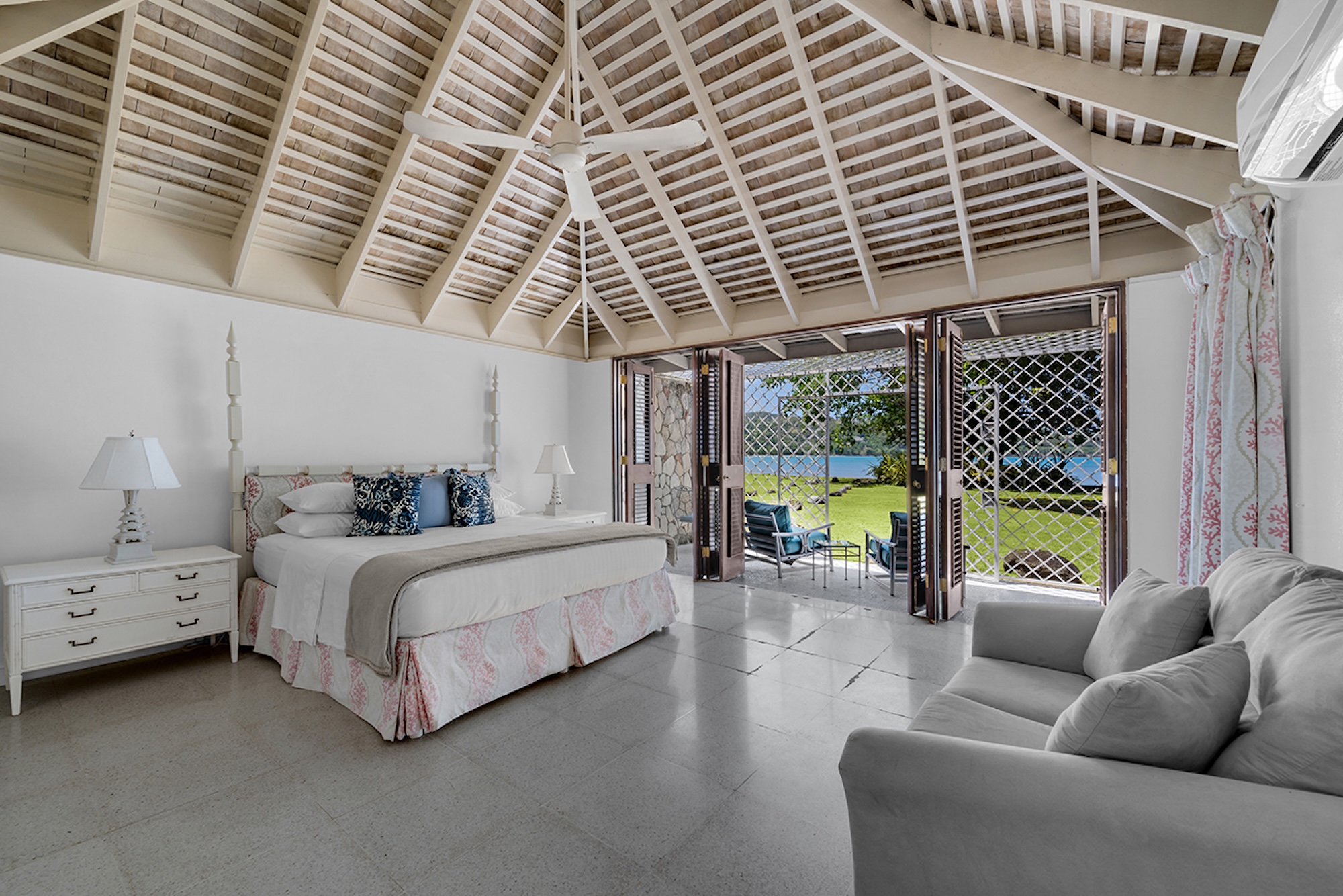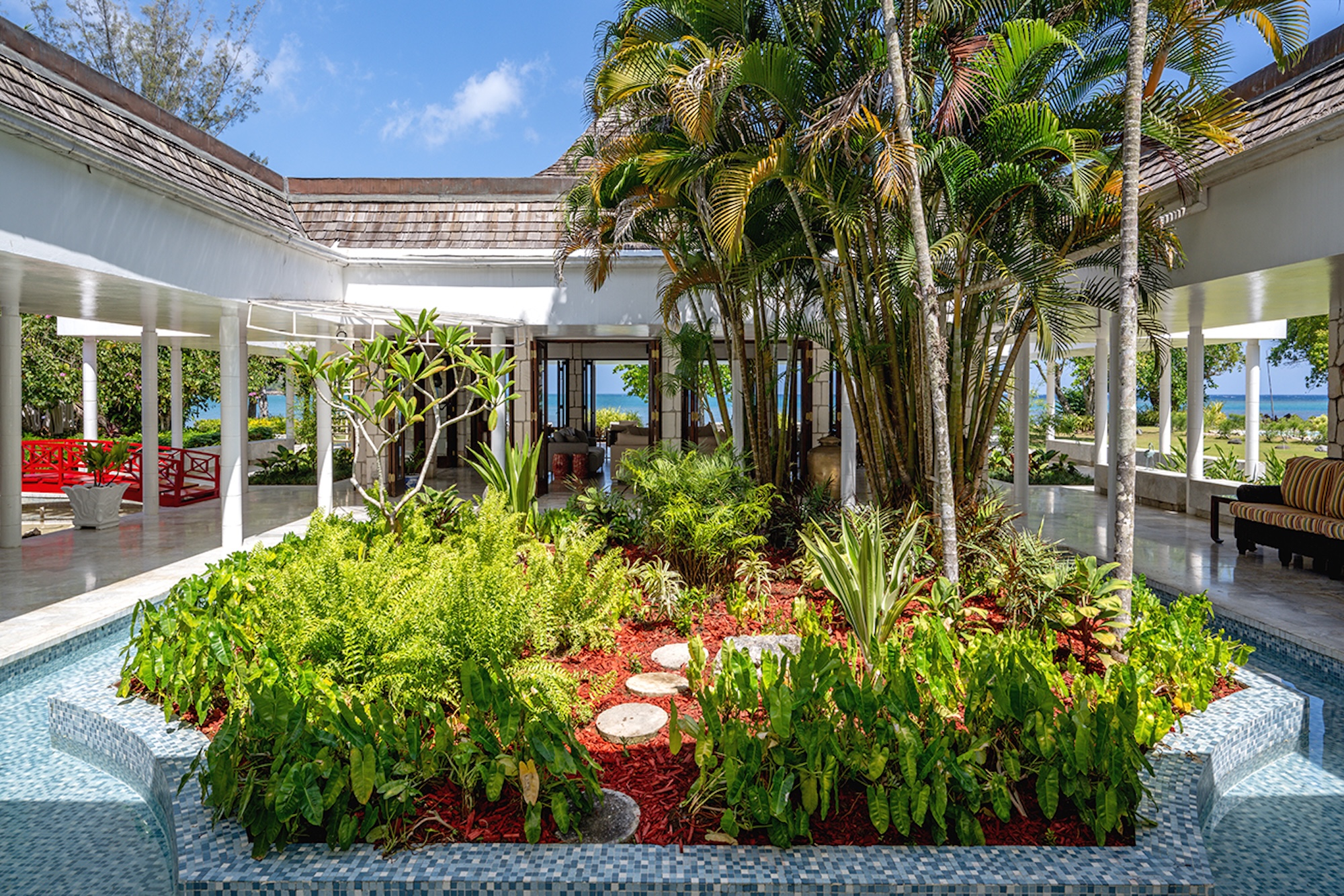 Gentle water gardens and charming bridges separate the living spaces, creating a serene sense of flow and privacy. With an elegant, almost Oriental-inspired sensibility, interiors open seamlessly to the outdoors—each room framed by tall mahogany French doors that lead onto private porches, while ceiling fans throughout enhance the relaxed, breezy atmosphere.