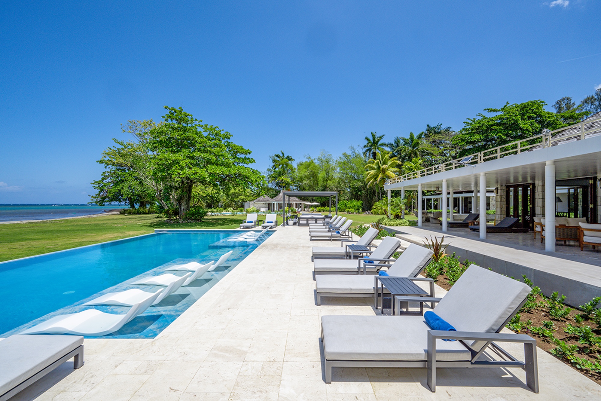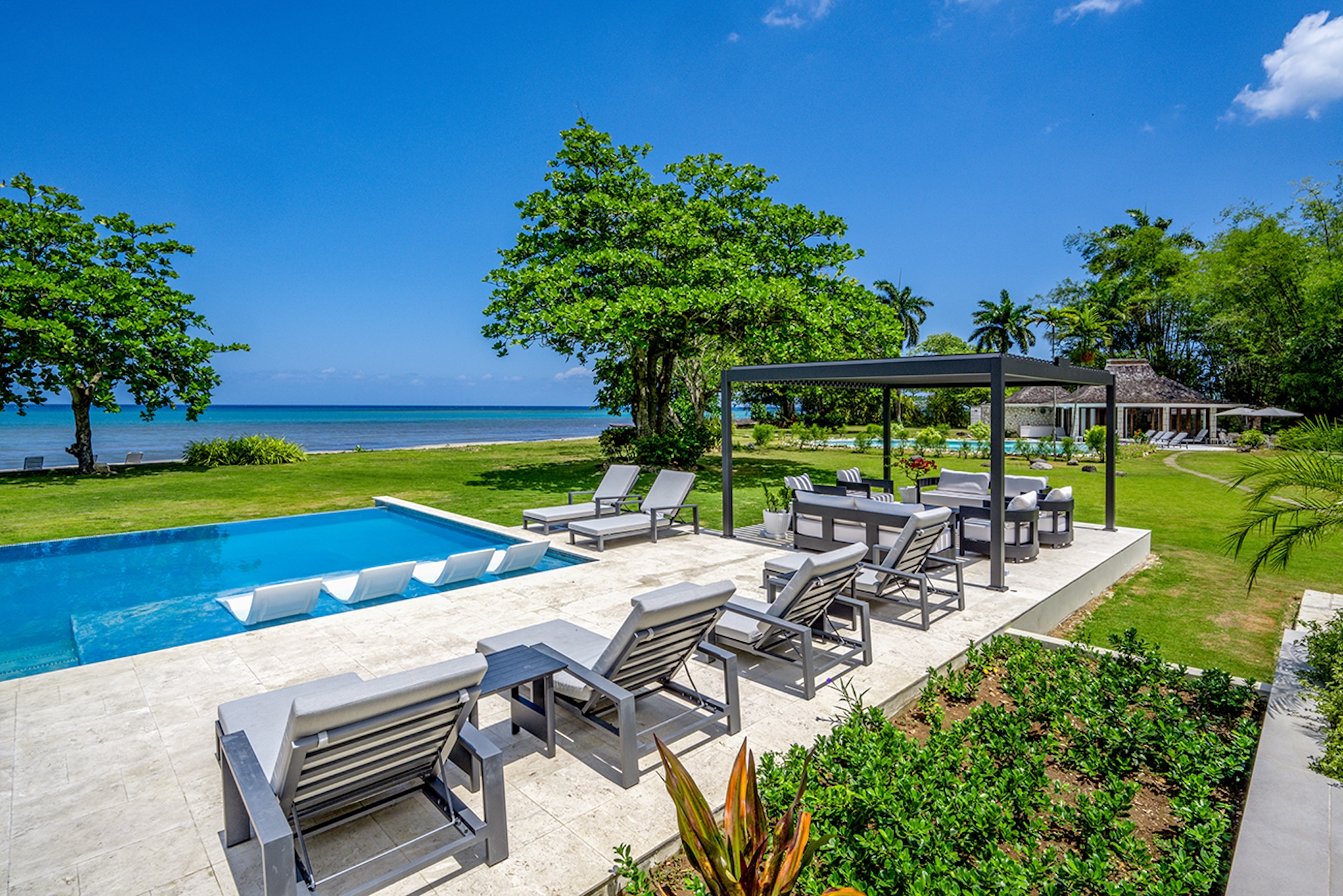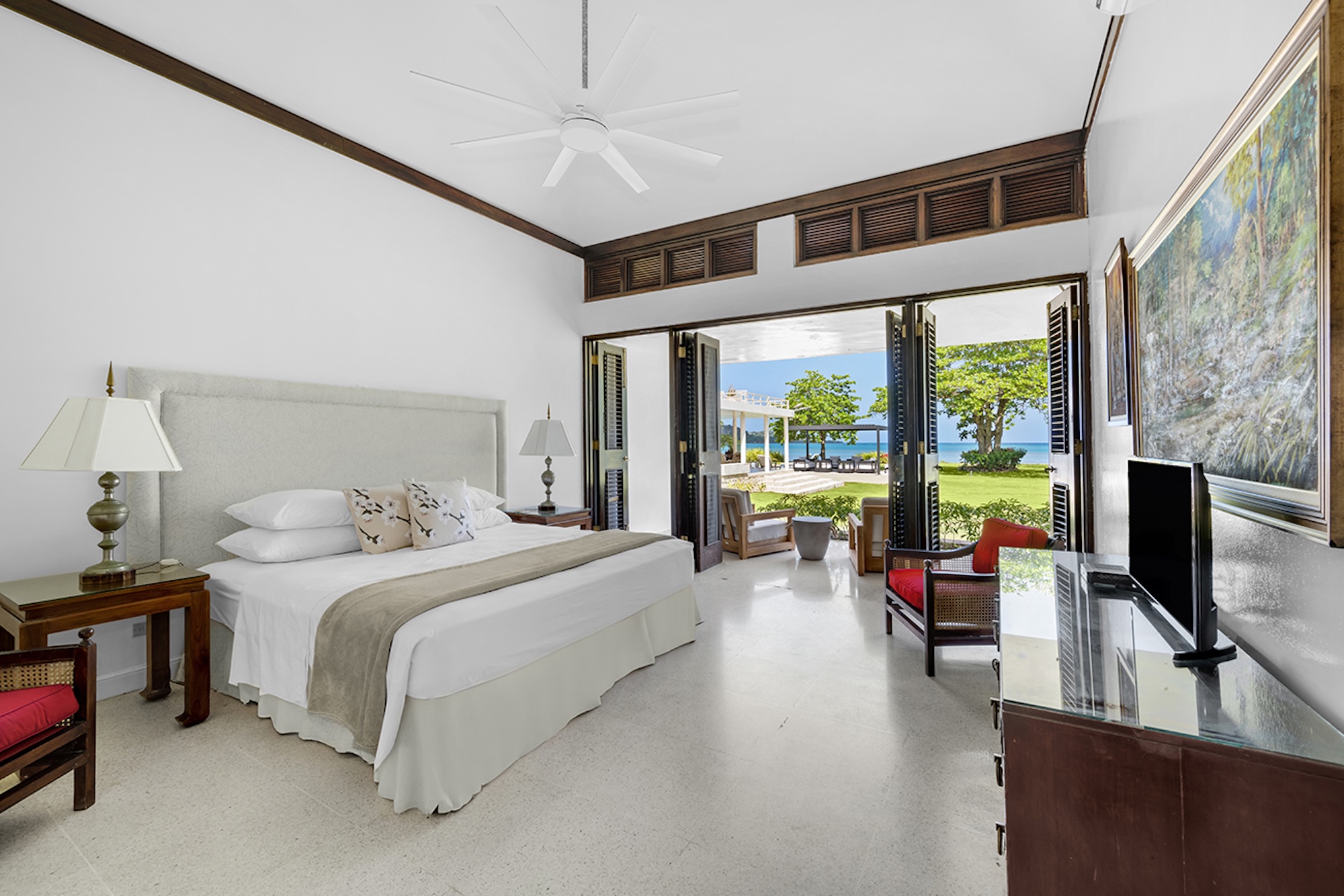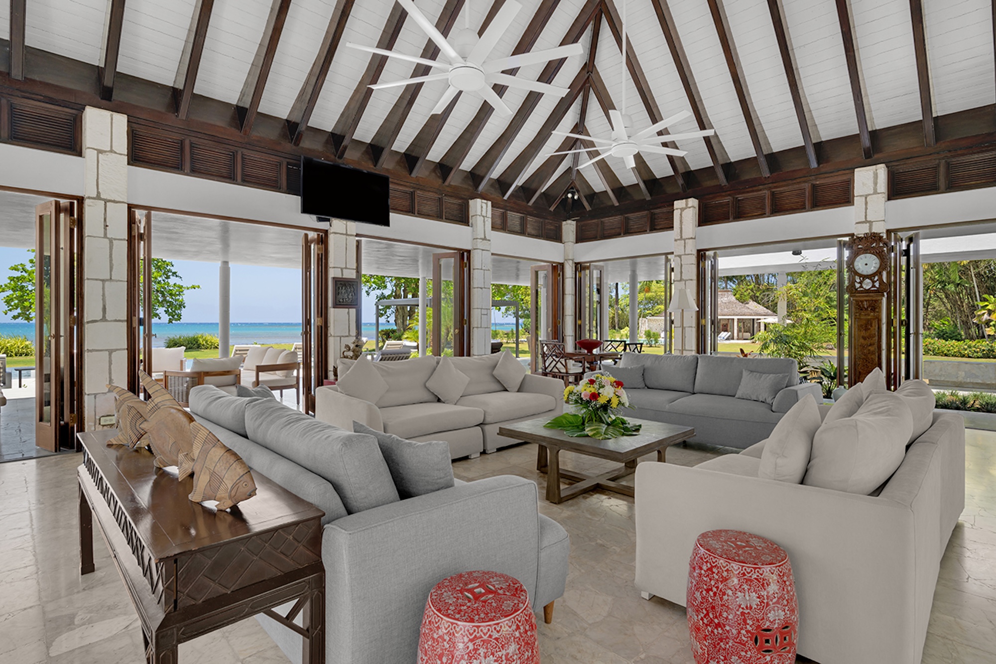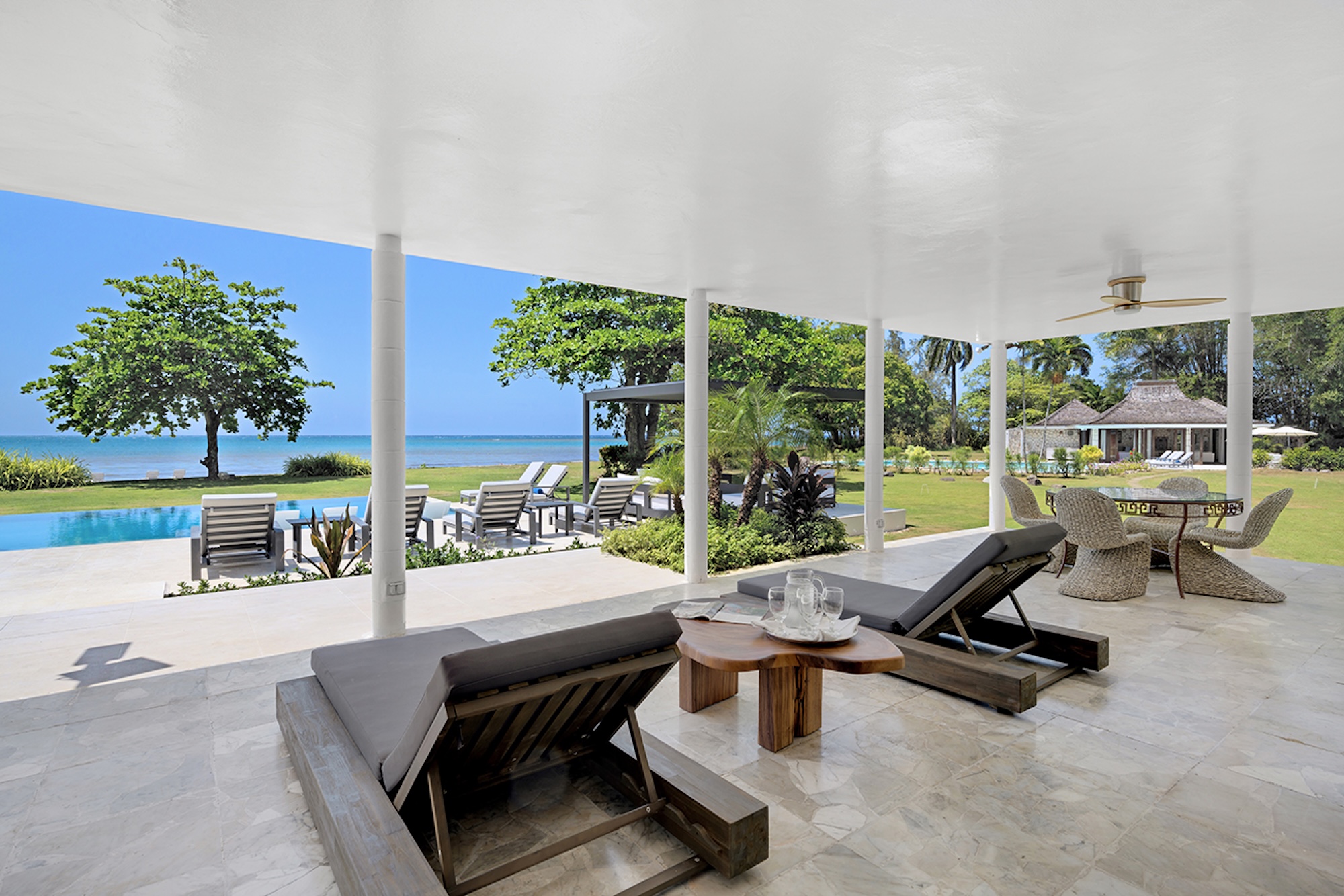 At the heart of the villa, the 600-square-foot main pavilion showcases a luminous Great Room encircled by glass doors, inviting in natural light and panoramic views. It opens onto a sweeping wraparound veranda, where gleaming white Jamaican marble floors reflect the coastal sunshine. Just beyond, the media room mirrors this open design, with its own walls of glass doors revealing captivating vistas of the gardens and sea. A full bar and powder room sit conveniently nearby, perfect for effortless entertaining.