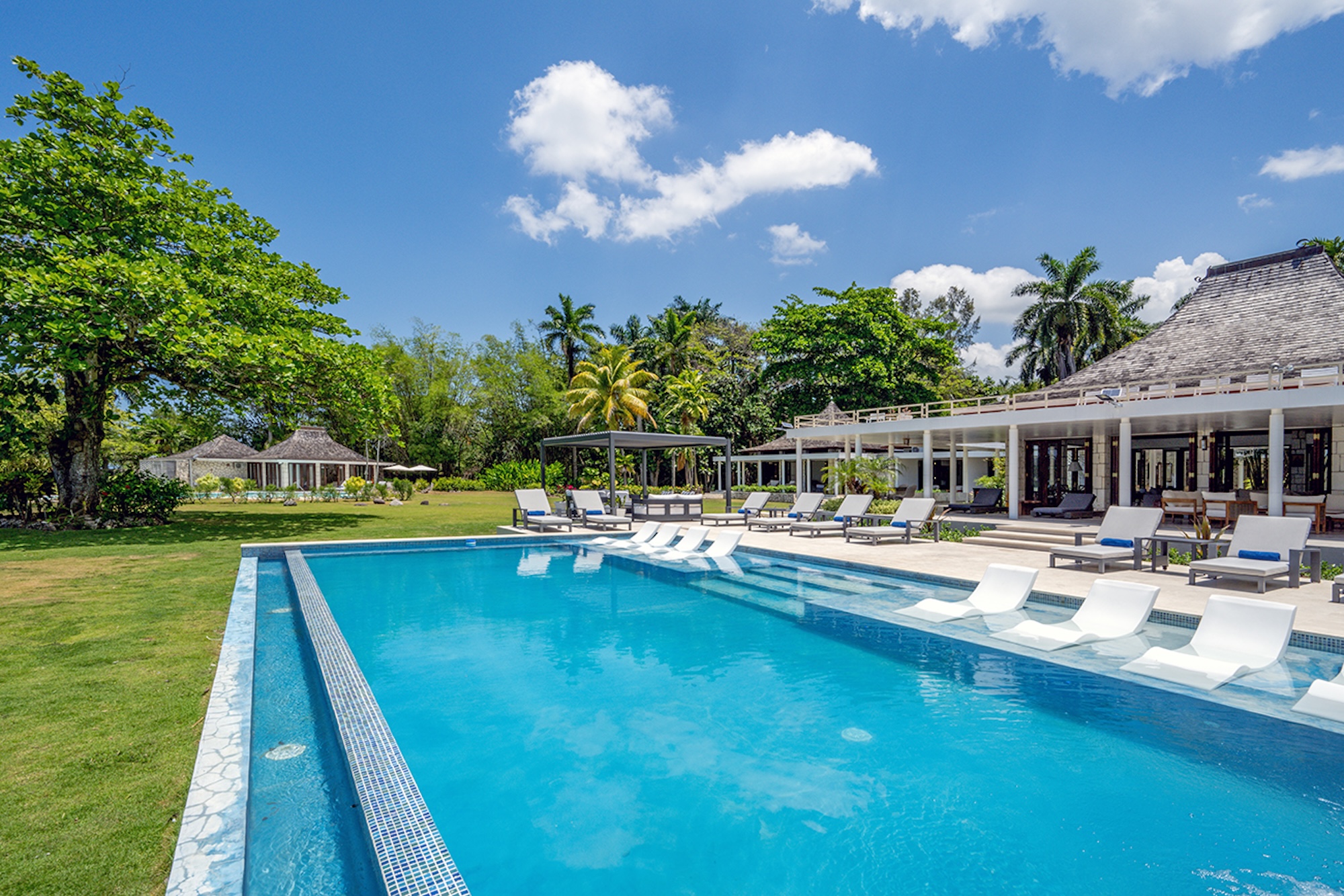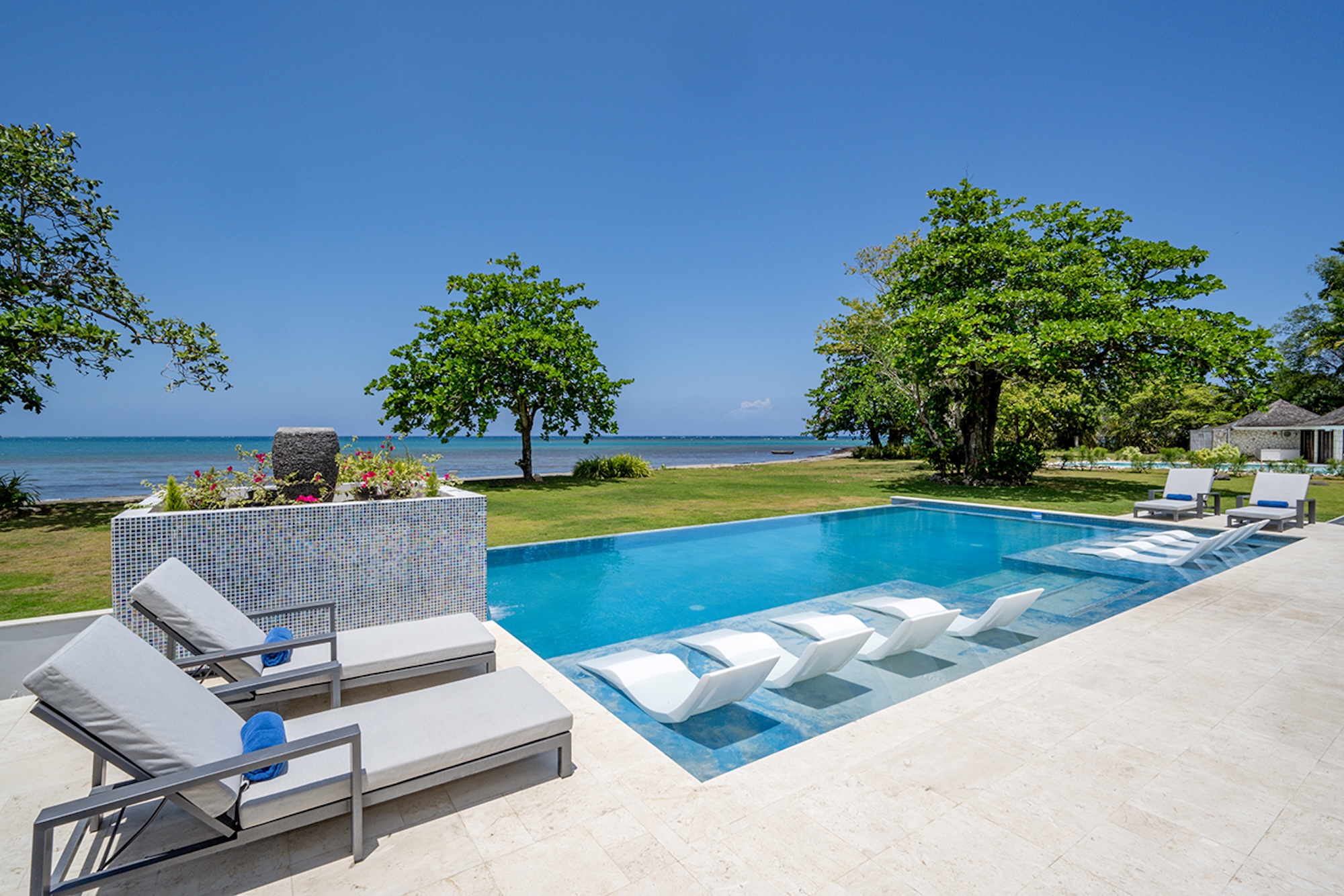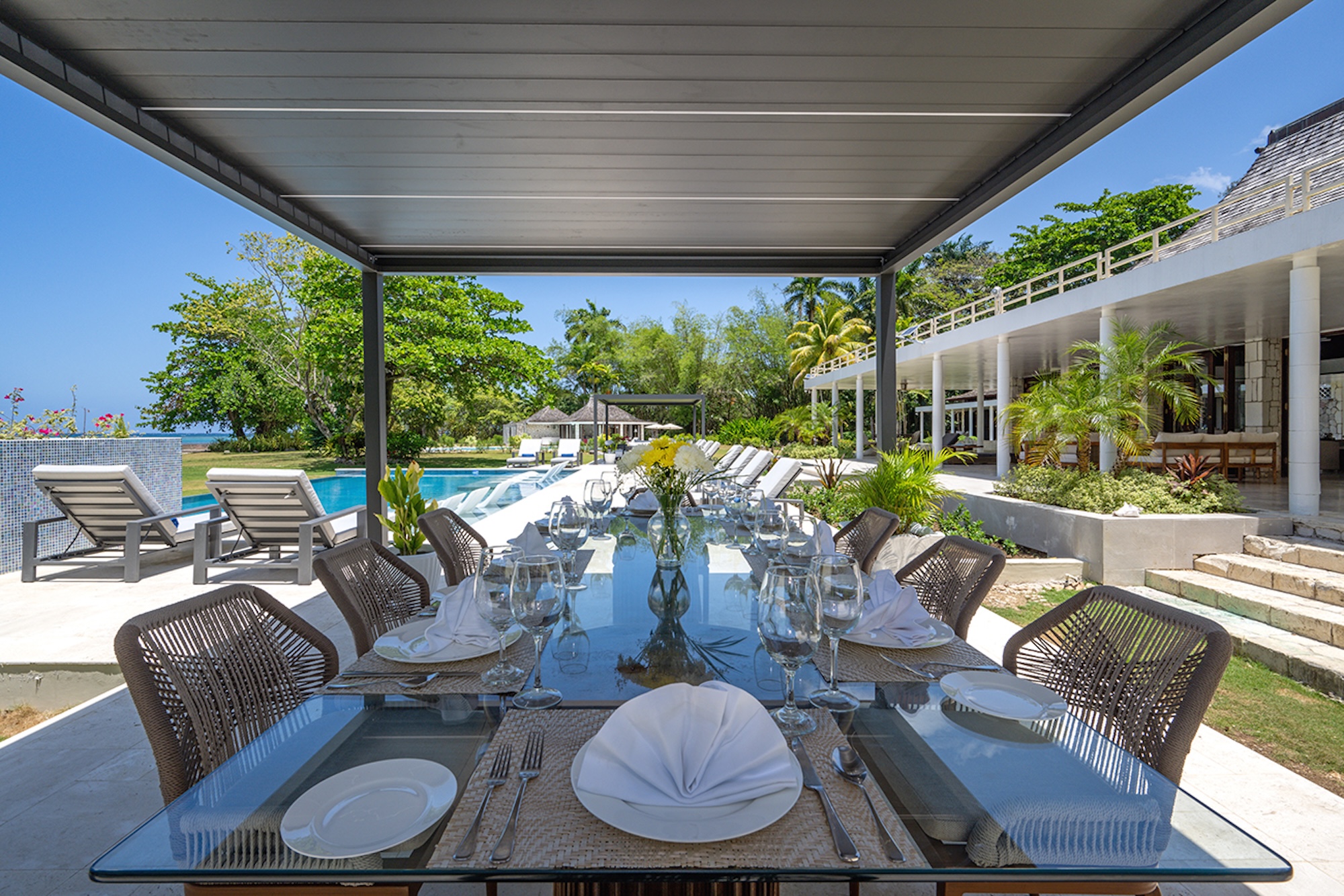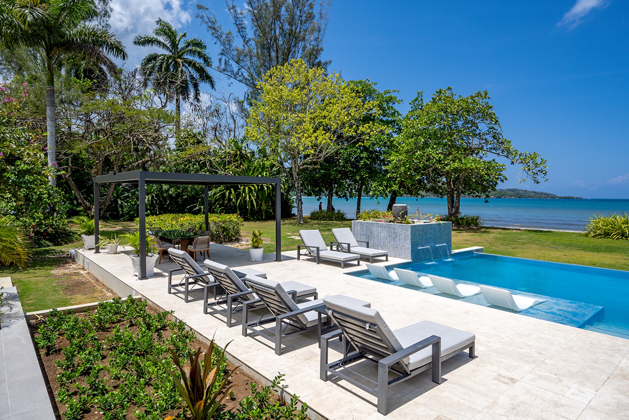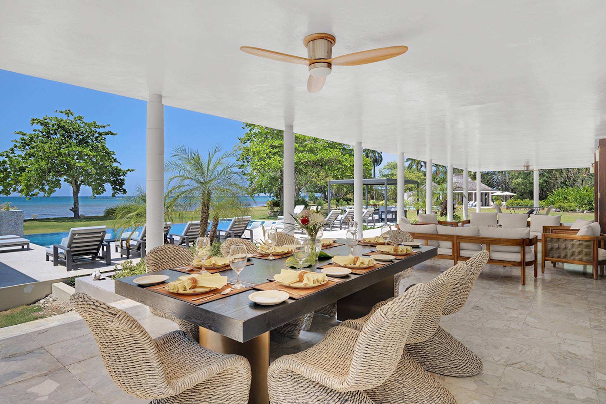 At the heart of the villa, the 600-square-foot main pavilion showcases a luminous Great Room encircled by glass doors, inviting in natural light and panoramic views. It opens onto a sweeping wraparound veranda, where gleaming white Jamaican marble floors reflect the coastal sunshine. Just beyond, the media room mirrors this open design, with its own walls of glass doors revealing captivating vistas of the gardens and sea. A full bar and powder room sit conveniently nearby, perfect for effortless entertaining.