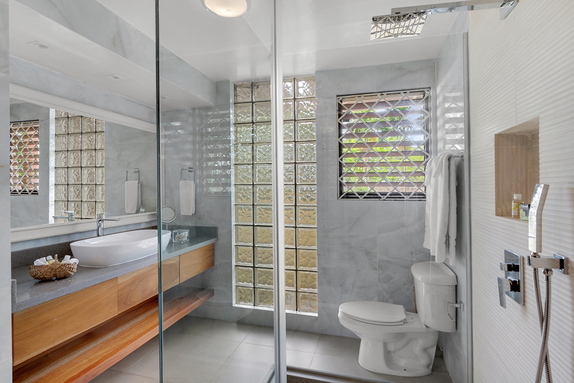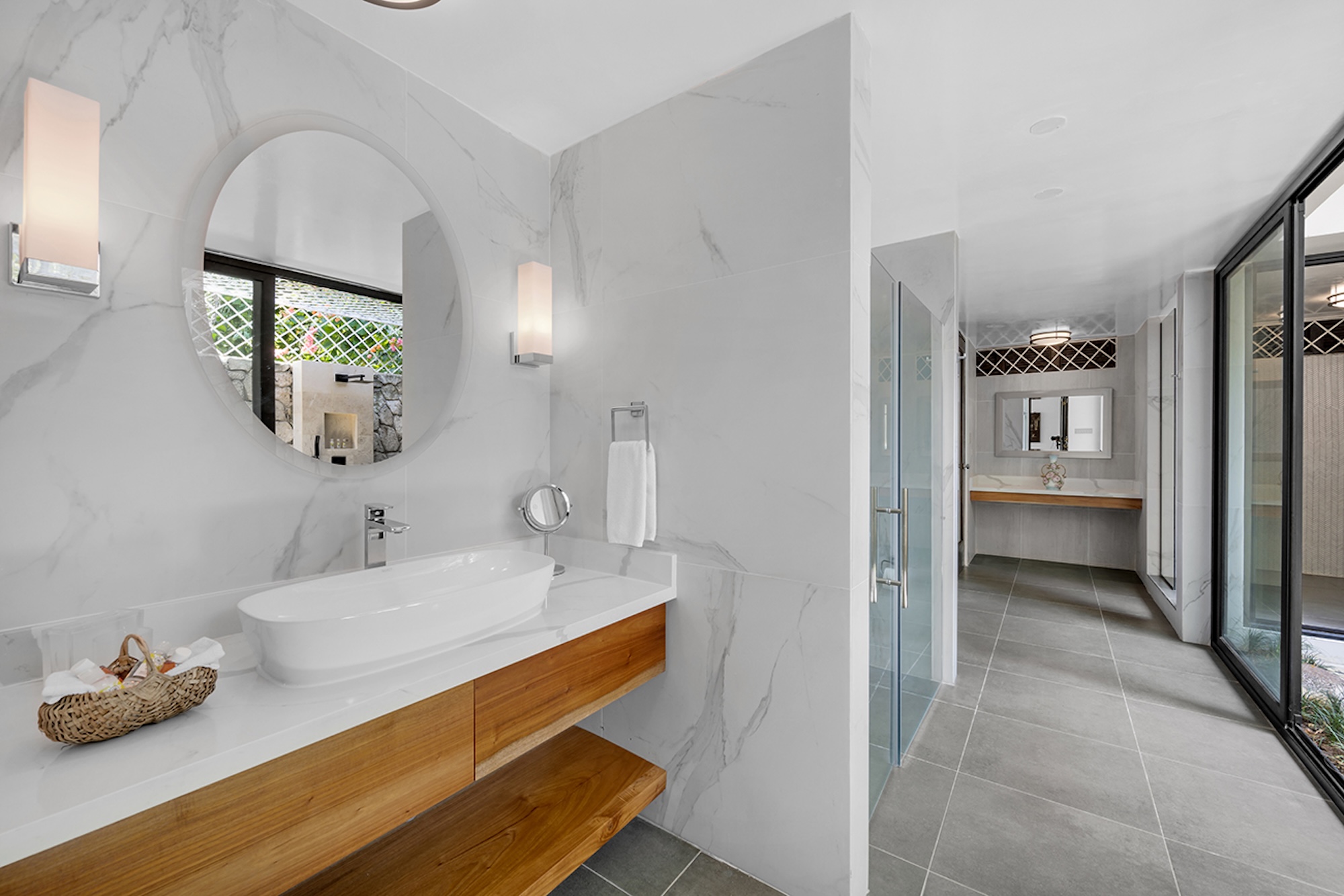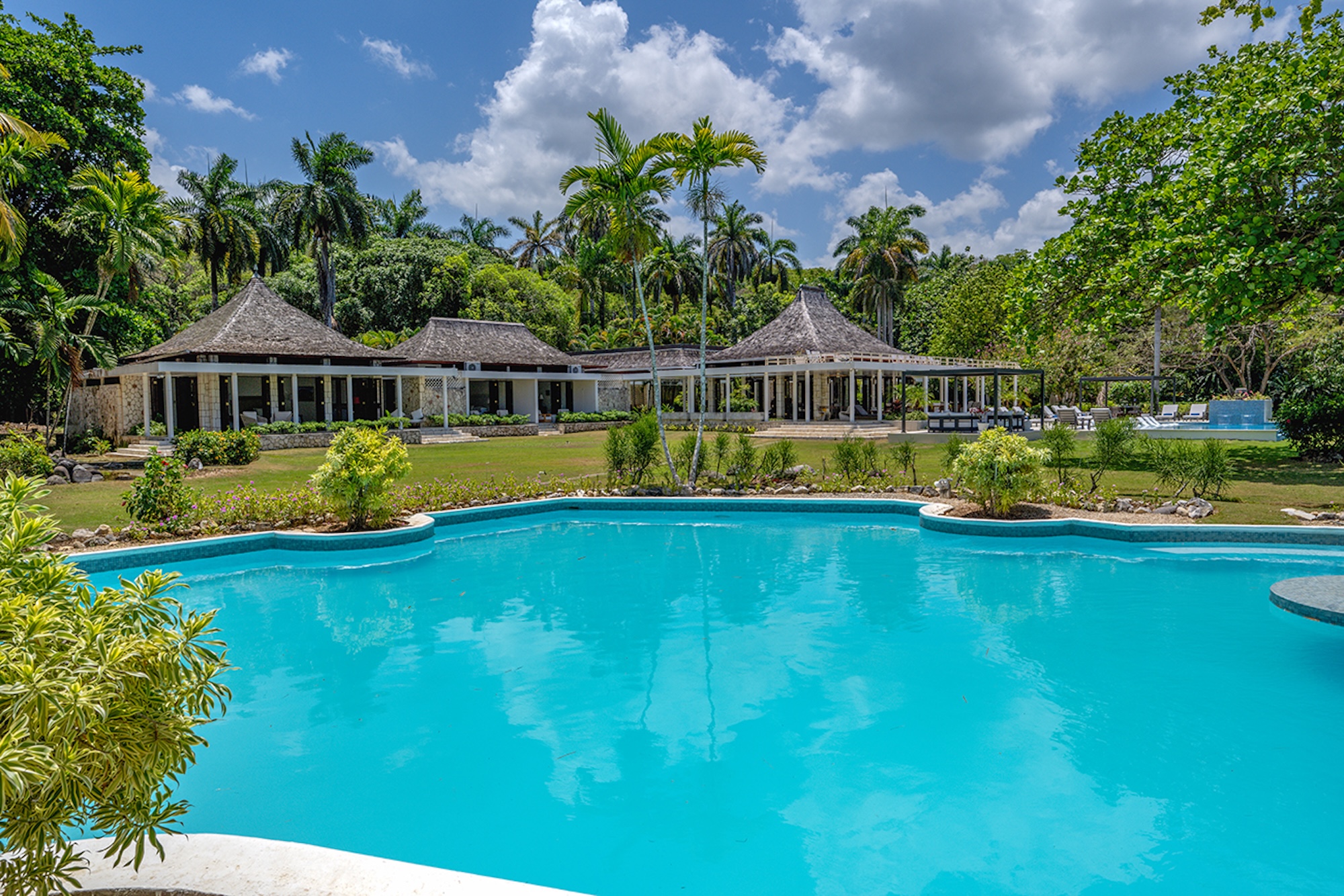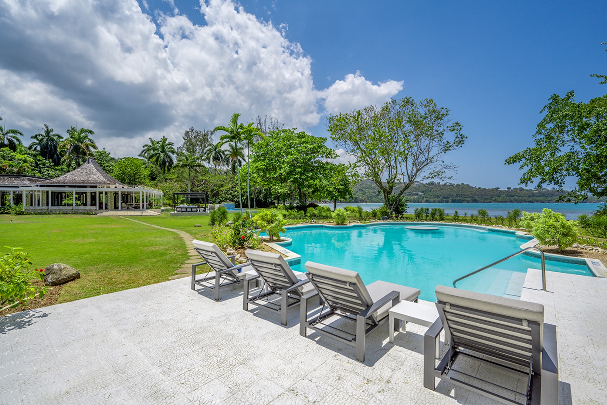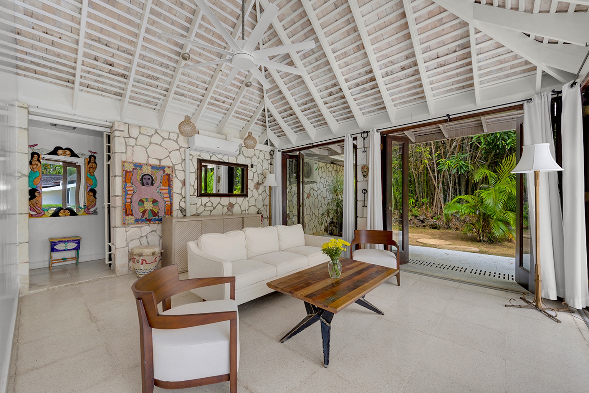 At the heart of the villa, the 600-square-foot main pavilion showcases a luminous Great Room encircled by glass doors, inviting in natural light and panoramic views. It opens onto a sweeping wraparound veranda, where gleaming white Jamaican marble floors reflect the coastal sunshine. Just beyond, the media room mirrors this open design, with its own walls of glass doors revealing captivating vistas of the gardens and sea. A full bar and powder room sit conveniently nearby, perfect for effortless entertaining.