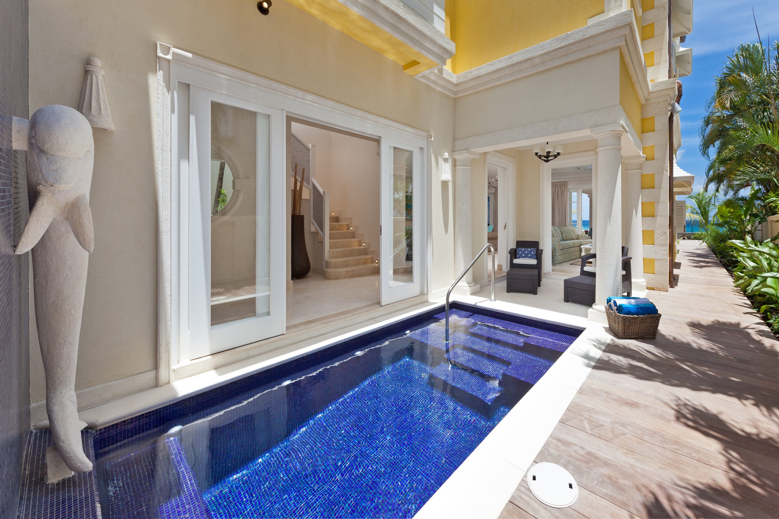 Guests are greeted by a beachfront garden perfect for soaking up the sun or enjoying a refreshing dip in the plunge pool. Alternatively, they can unwind on the shaded terrace with a refreshing drink, all while savoring the mesmerizing view of the Caribbean Sea.