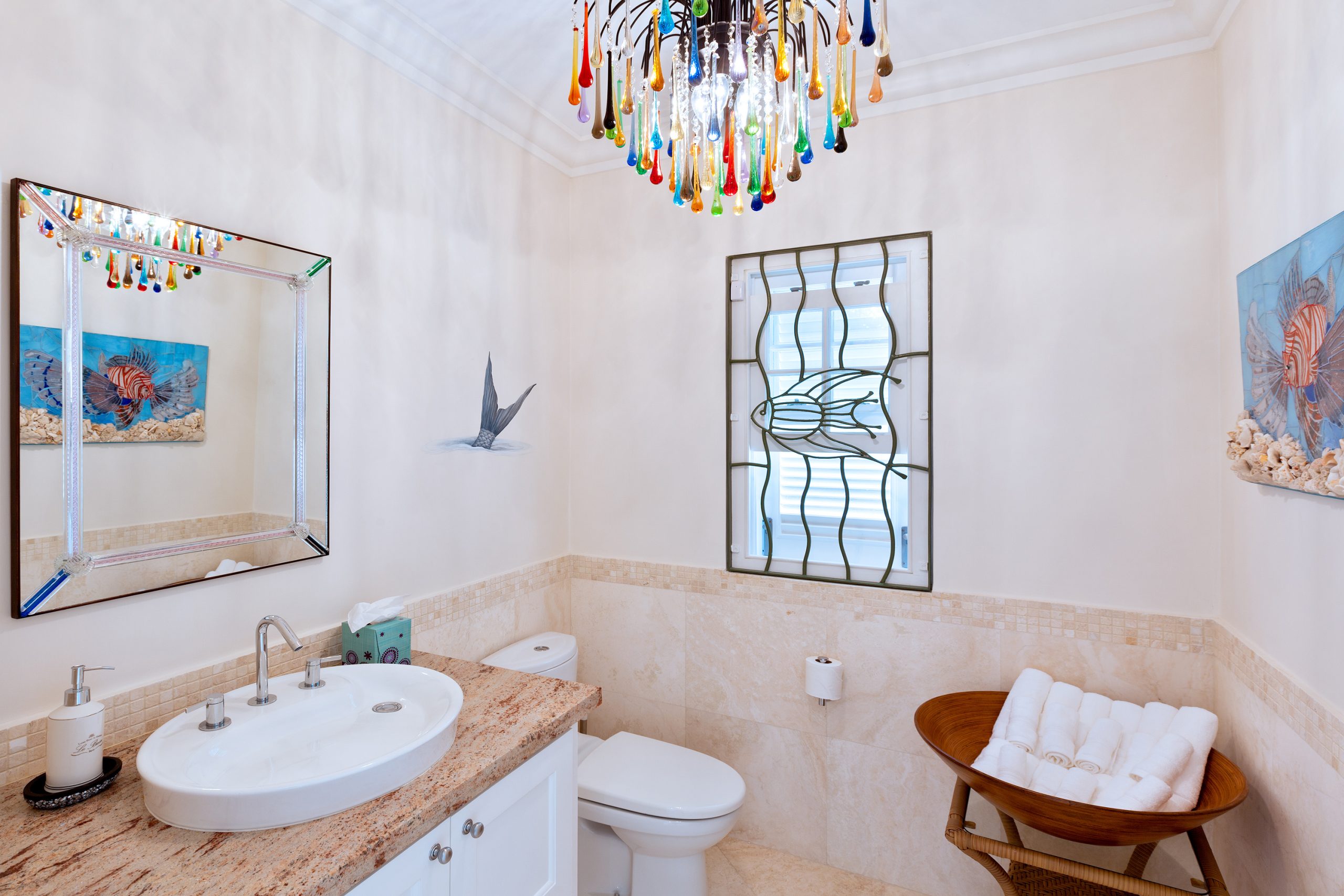 Inside, the décor exudes modern sophistication, characterized by cool blues, vibrant tropical hues, and playful nods to an enchanting “undersea” motif. The expansive living room and TV area seamlessly flow onto the covered terrace, offering ample seating and an alfresco dining area for leisurely meals. The well-equipped kitchen, just steps away, ensures culinary endeavors are a breeze.