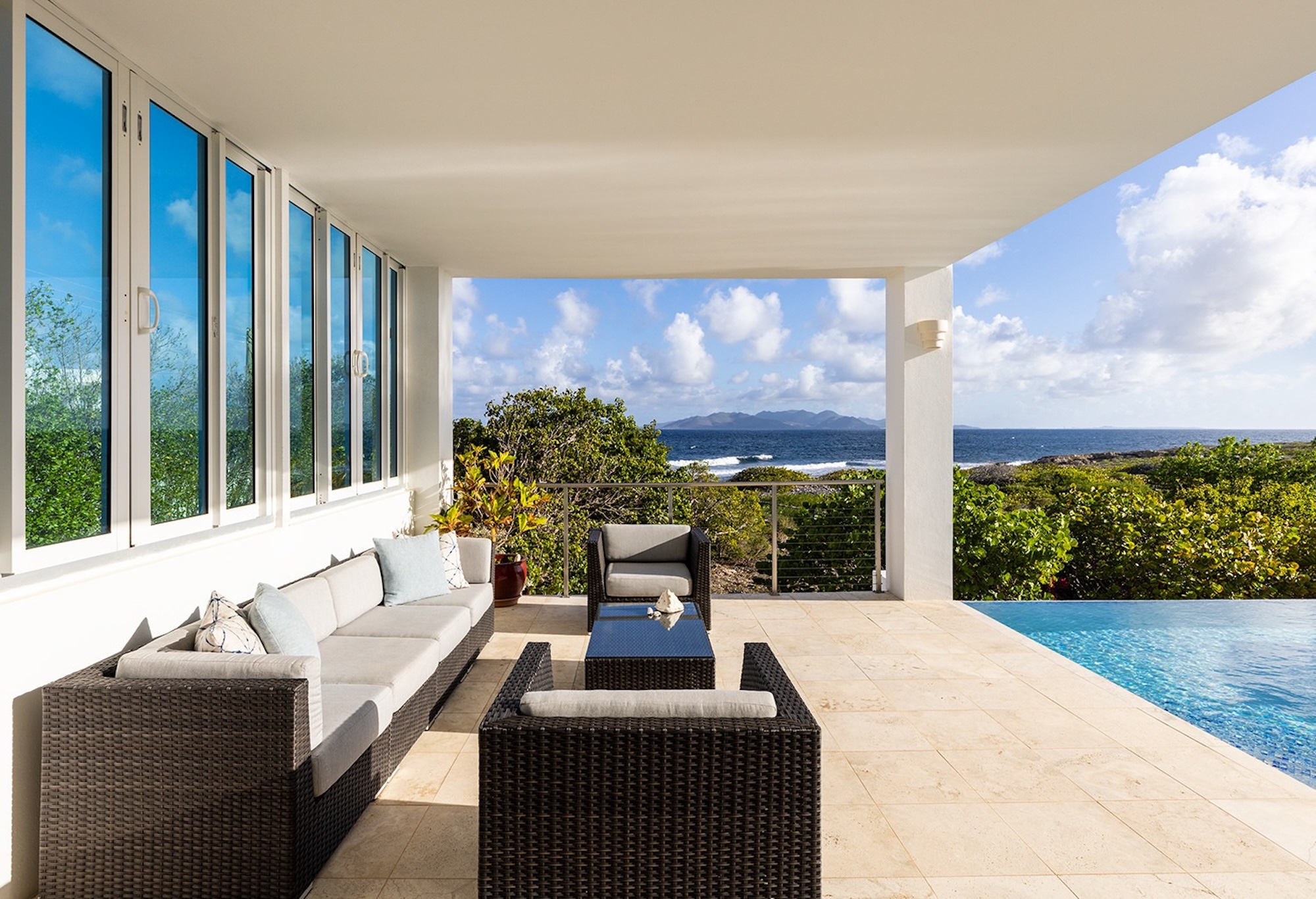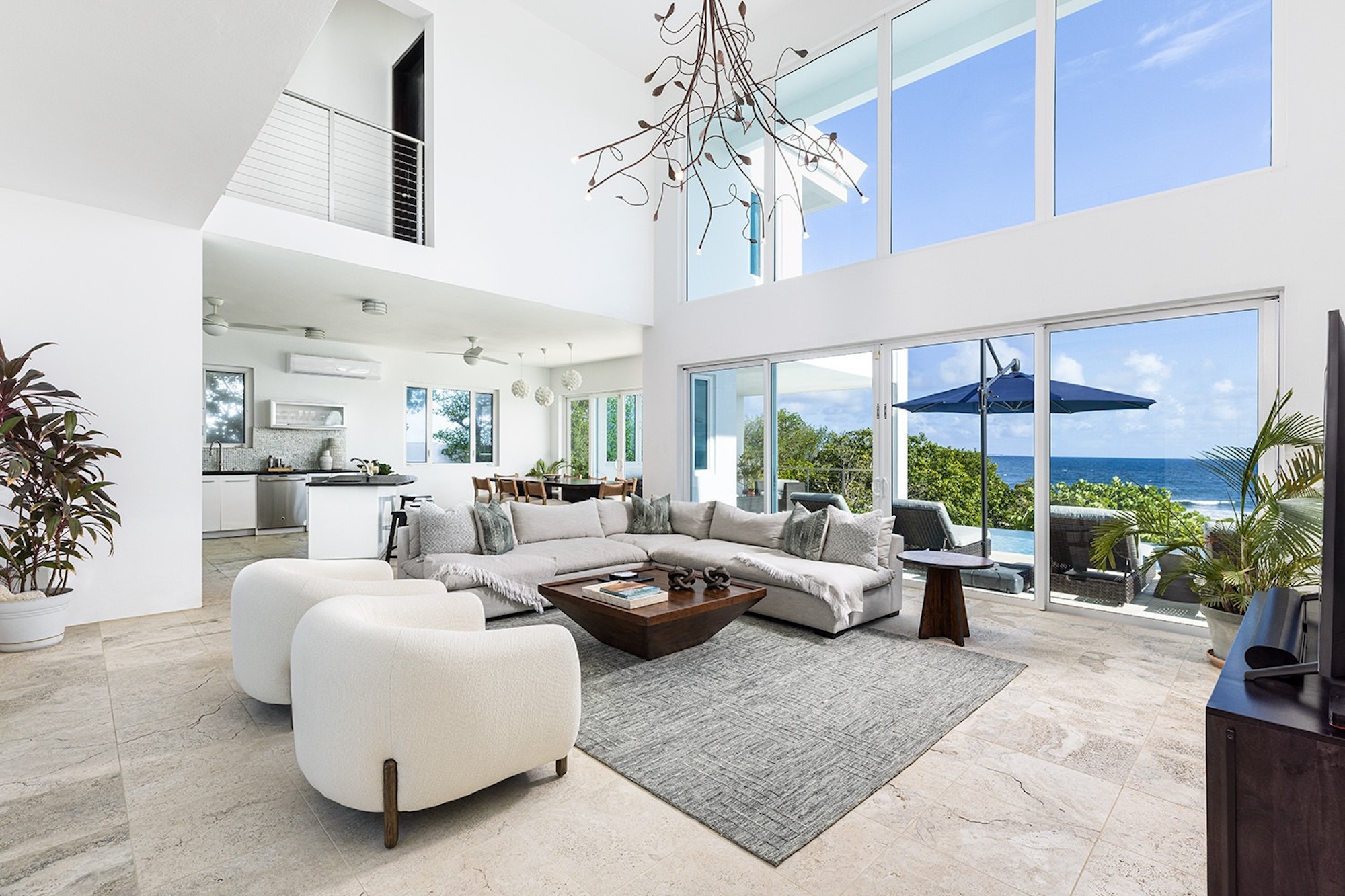 This modern beachfront retreat offers unmatched privacy, style, and comfort, featuring three master suites with floor-to-ceiling windows that frame breathtaking views of the Caribbean Sea and the nearby island of St. Martin.