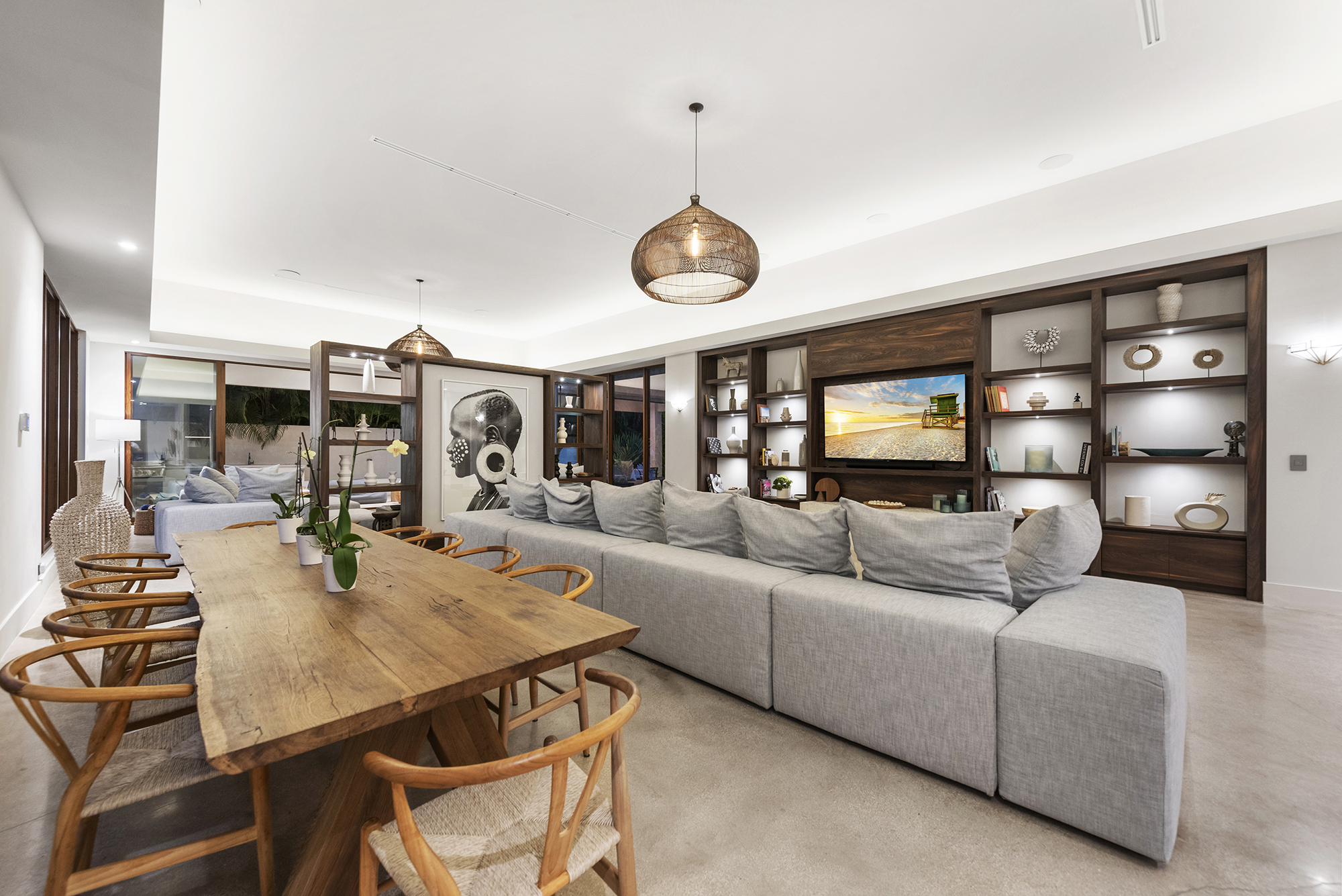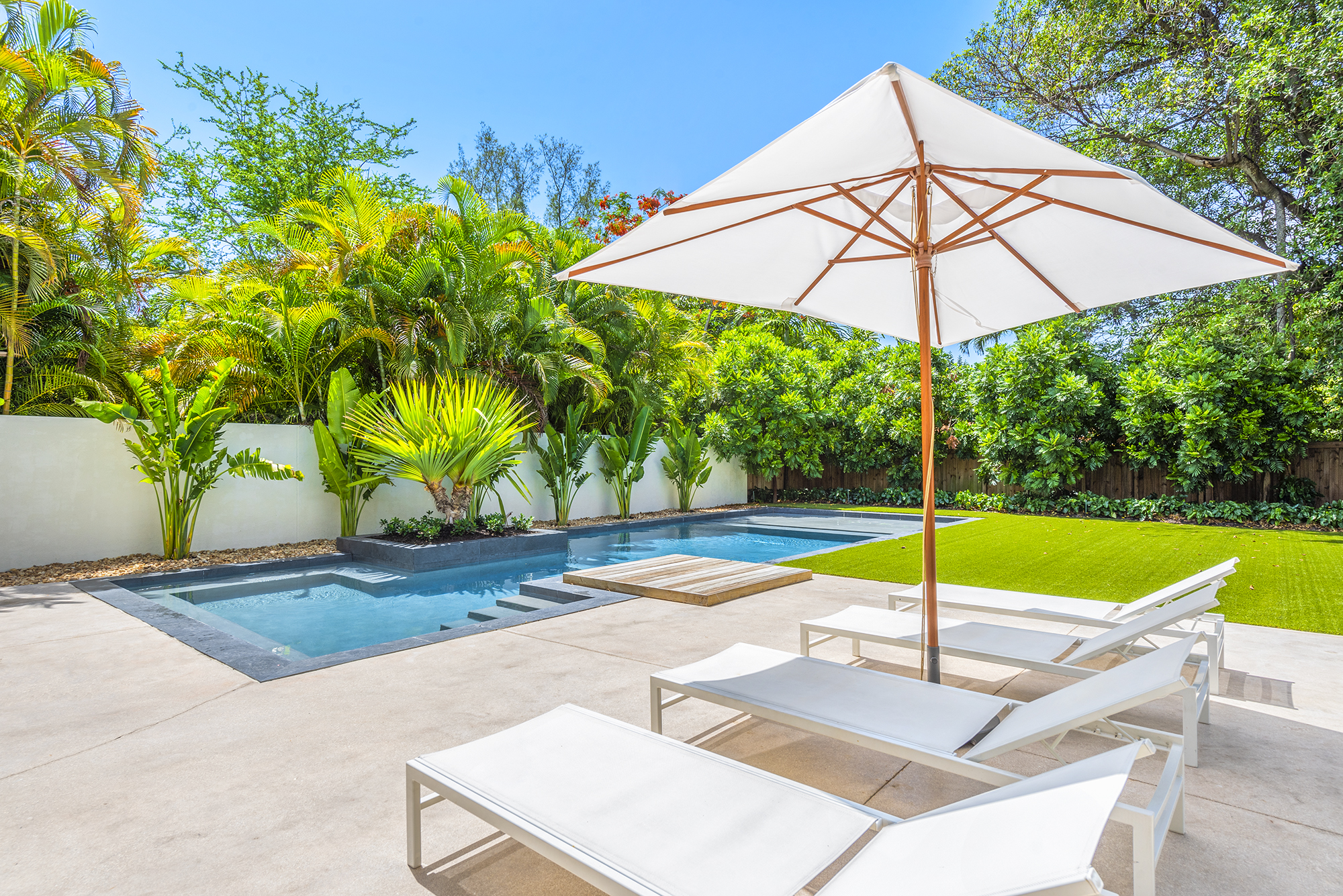 Indoor and outdoor living merge seamlessly, with multiple spaces for gathering in either sun or shade. Guests can unwind beneath the palms, take a refreshing swim in the heated pool, or fire up the grill for an alfresco meal on the veranda. Evenings lend themselves to lingering outdoors, enjoying the illuminated pool and quiet Miami breezes.