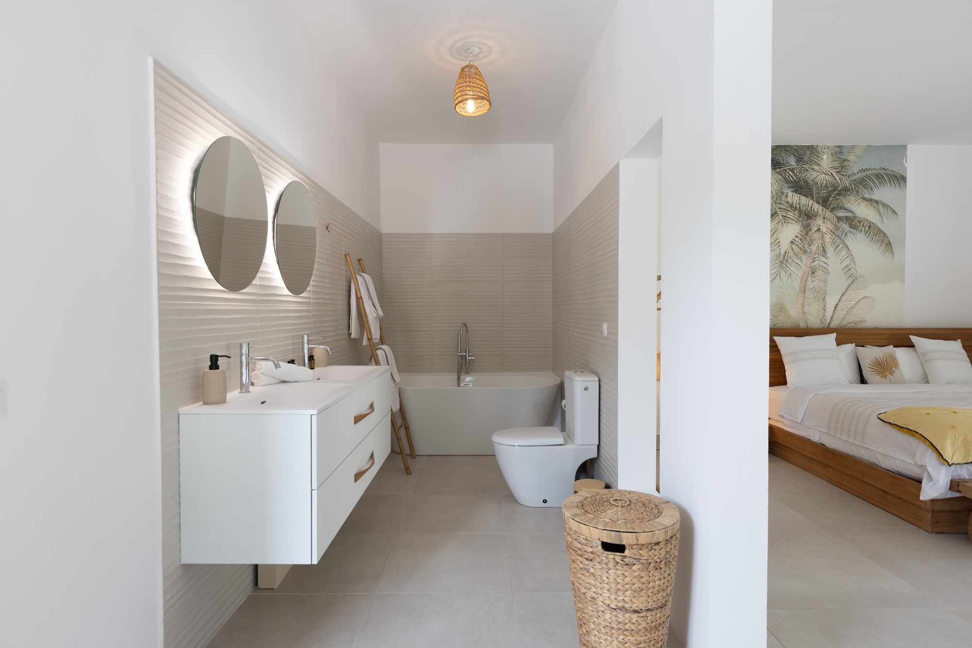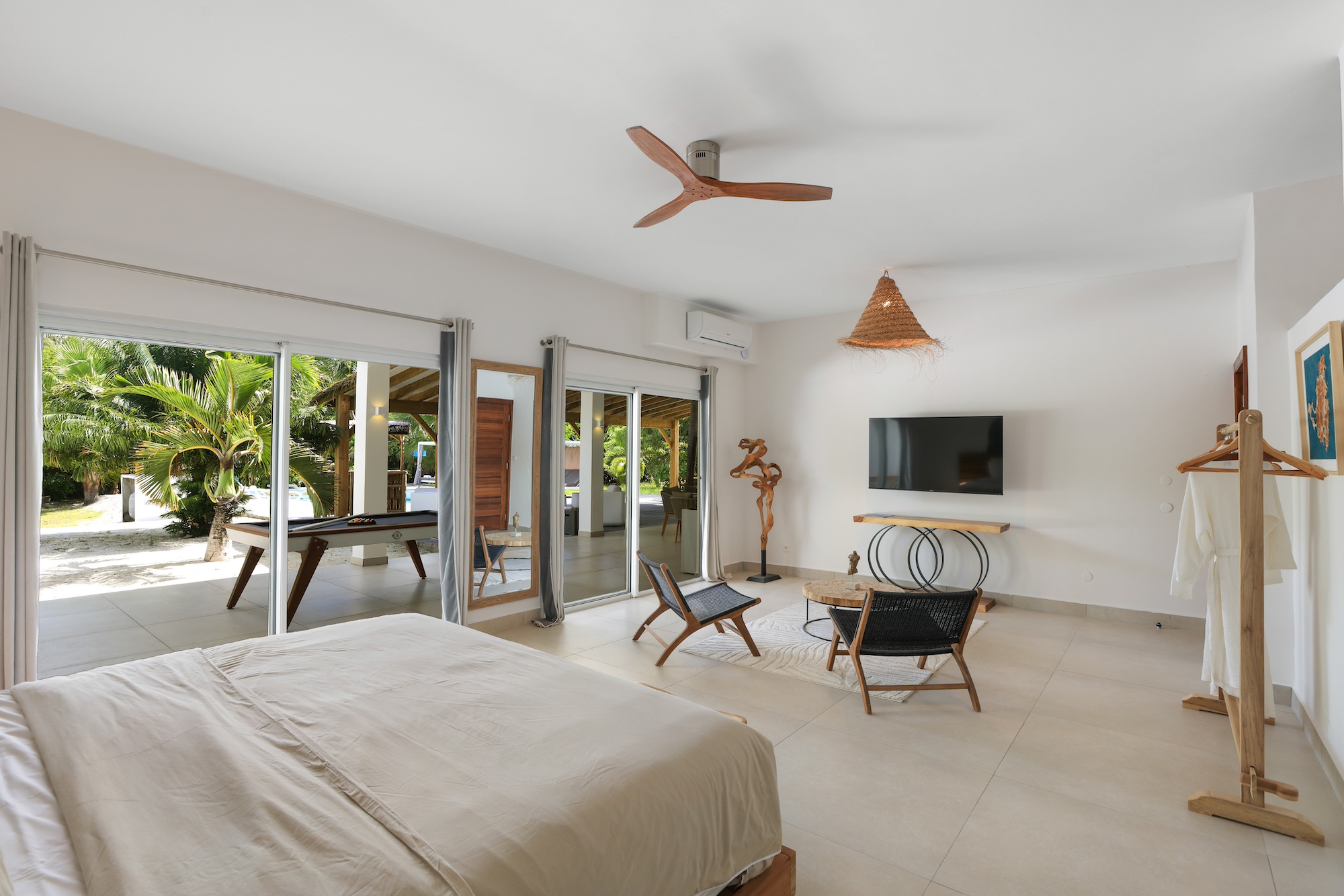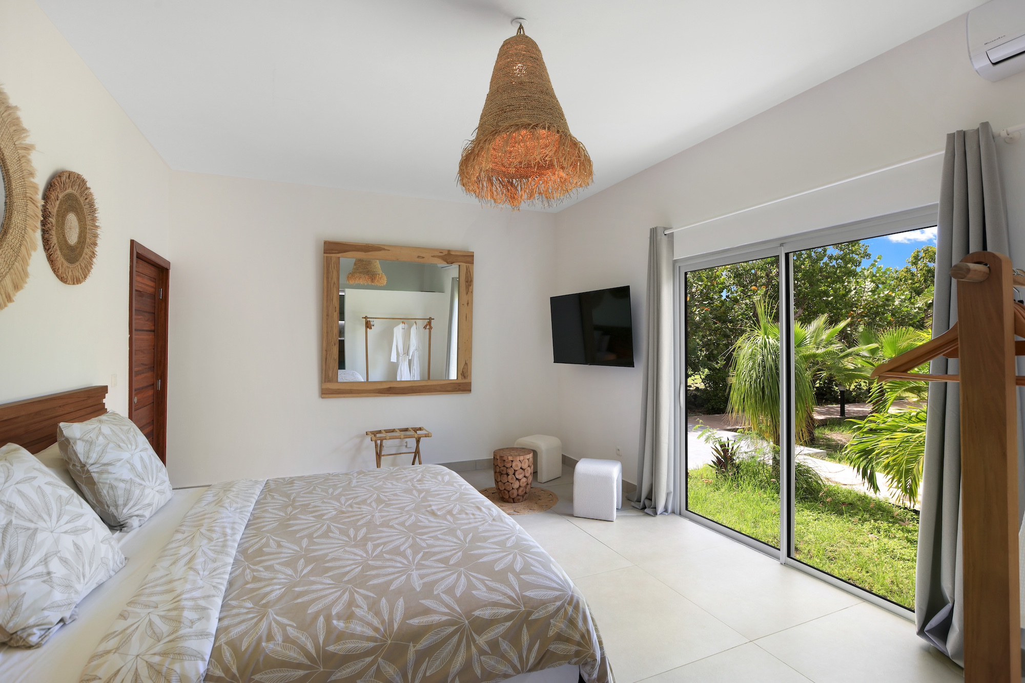 Within the main villa, four bedrooms are elegantly arranged—two facing the pool and two overlooking the gardens. The sixth bedroom enjoys its own private entrance, terrace, and hammock, along with access to the jacuzzi, providing a tranquil haven for those seeking extra seclusion.