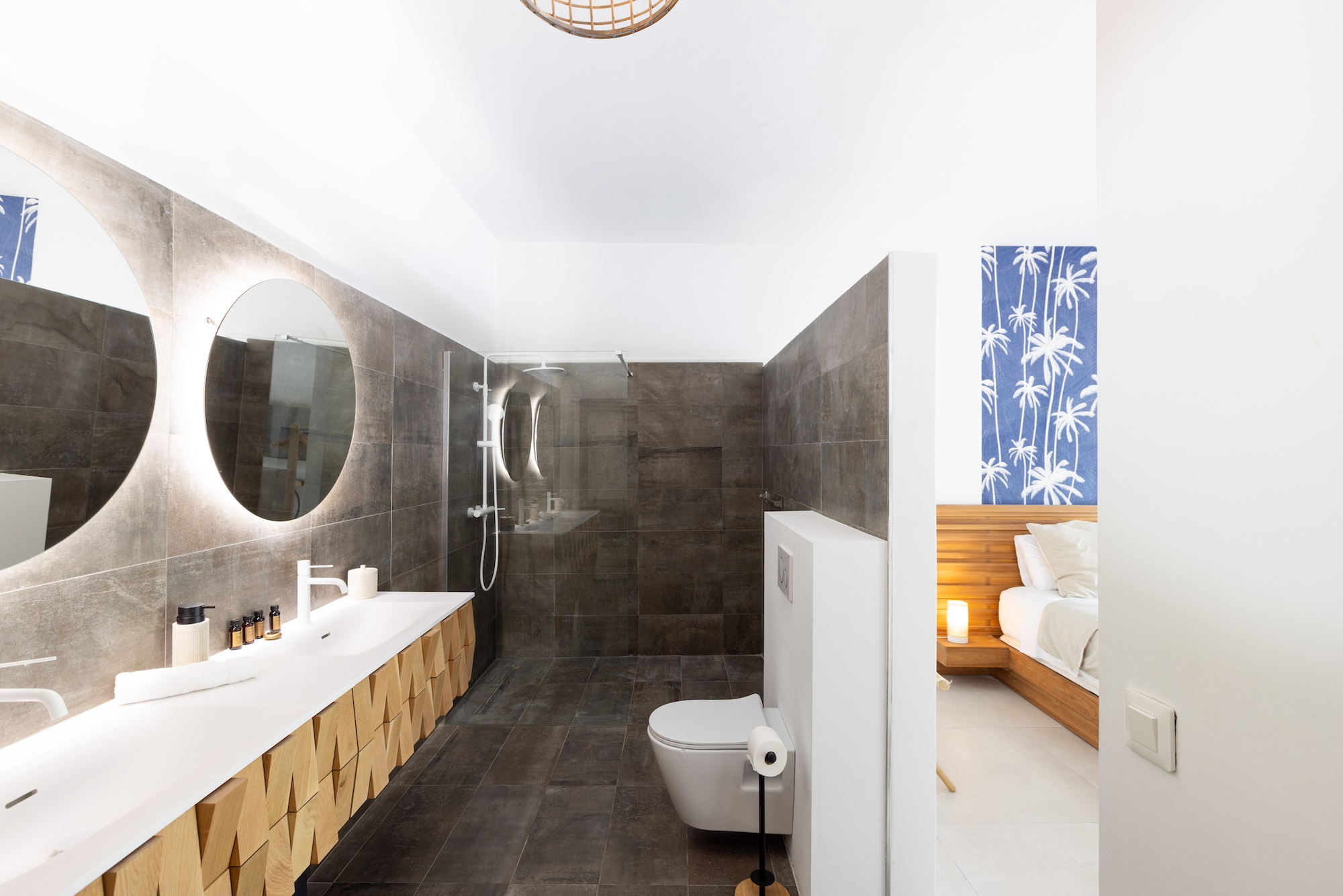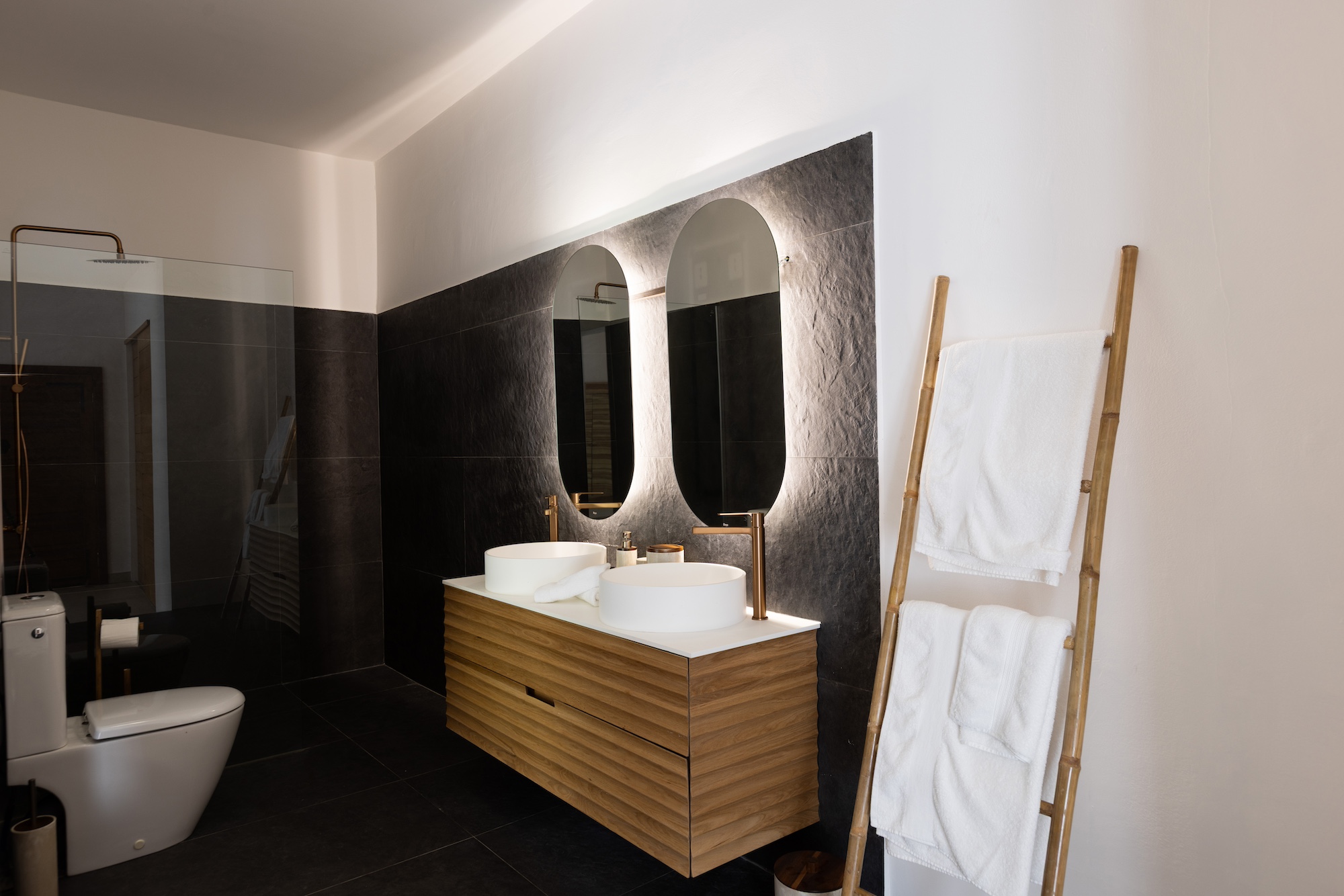 Each of the six bedrooms features an ensuite bathroom, ensuring total comfort and privacy for every guest. The master suite opens directly onto the terrace, offering serene views of the pool and a private garden patio with two loungers, an outdoor shower, and direct access to the jacuzzi—perfect for unwinding at the end of the day.