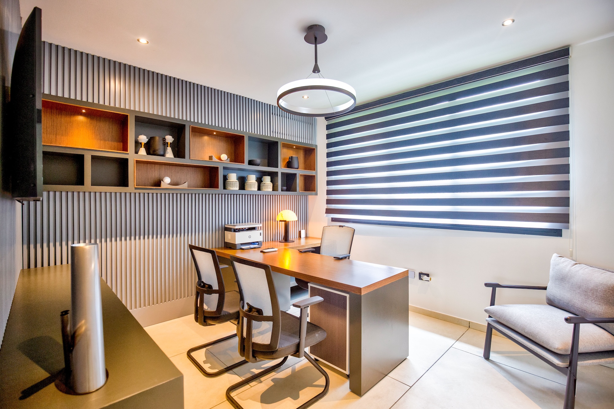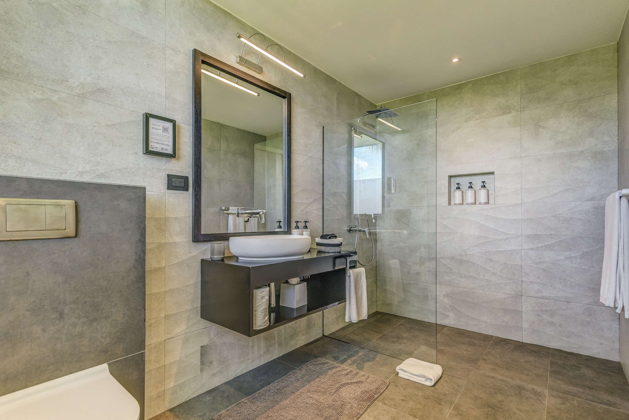 As you enter through the main entrance, a high ceiling with a gentle breeze coming from the garden welcomes you to a large and sober foyer sprinkled with subtle modern touches and governed by a minimalistic outlook.