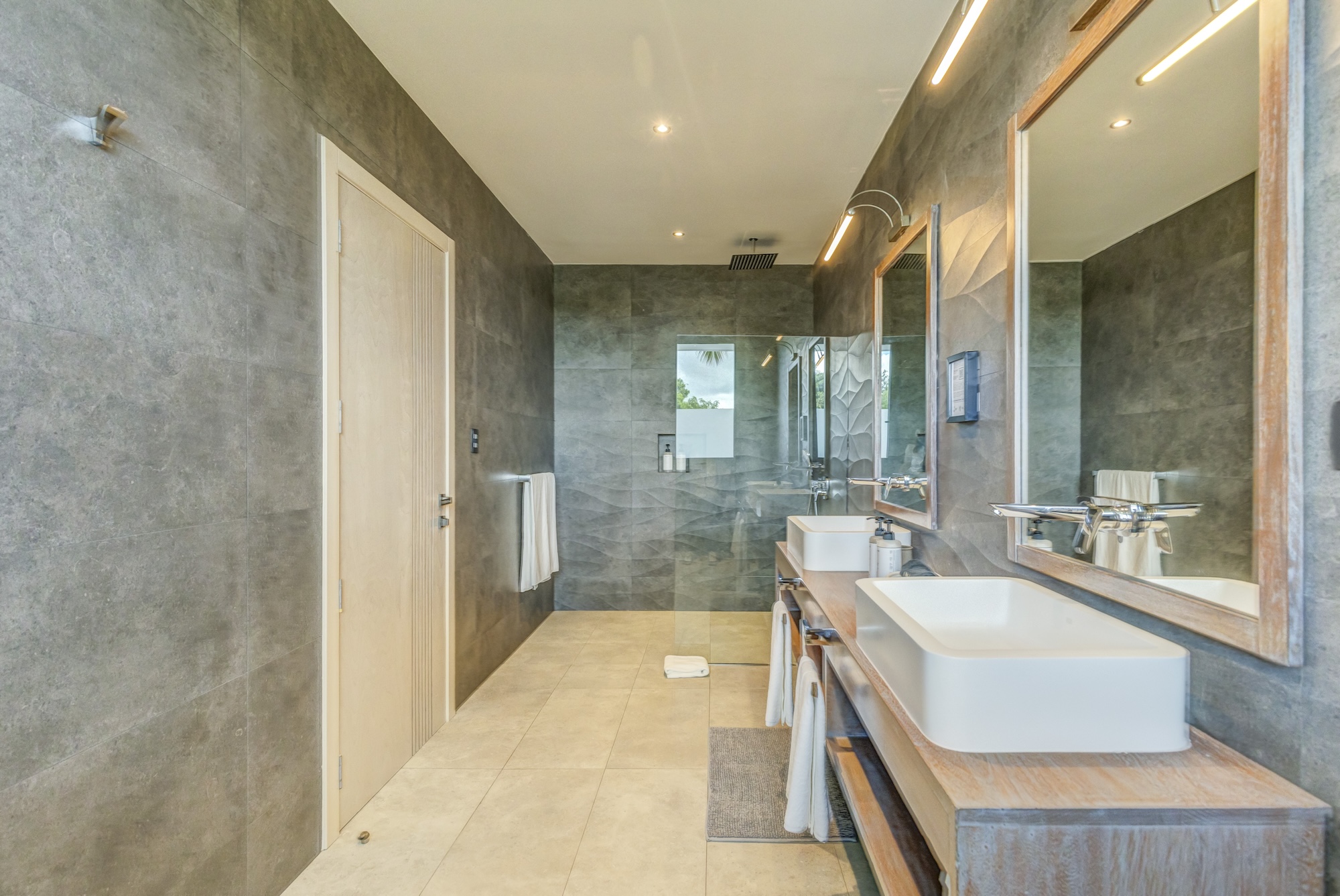 When going upstairs to the second floor you will find 7 of the 9 bedrooms. There are two master bedrooms with a King bed, an en-suite bathroom and Jacuzzi on the terrace. Then, you have 4 double bedrooms with 2 Queen beds and en-suite bathroom each and the seventh bedroom, ideal for families, has 2 Queen beds and 2 Twin Bunk Beds with its en-suite bathroom. Finally, when going downstairs you will find the eighth bedroom, another master with a King bed and en-suite bathroom next to the last bedroom with 2 Queen beds and en-suite-bathroom.